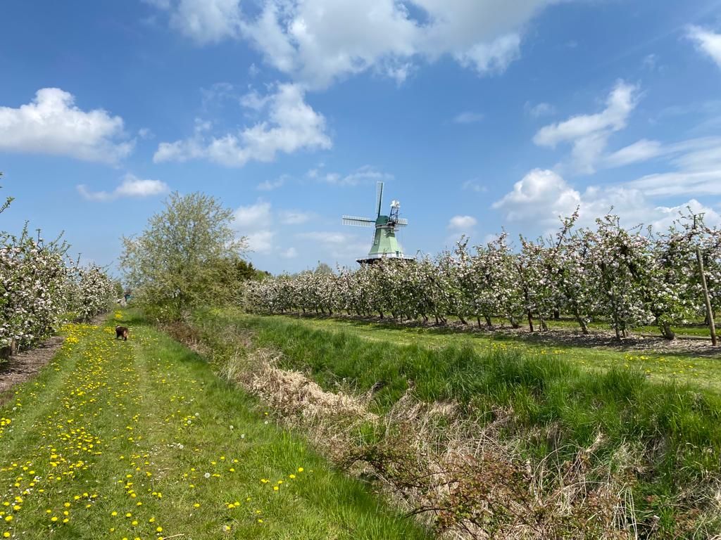 # Day 5: Hollern-Twielenfleth. Bei bestem Wetter ☀️ hat Thom eine kleine (3 Stunden) Führung über den Obsthof mitgemacht und weiß jetzt „alles“ über den Apfelanbau 🍎🍏… Abends haben uns Marc und Bärbel – gaanz „alte“ Freunde, die gerade hier in die Ecke gezogen sind – besucht und wir haben lecker zusammen gegrillt. War mega schön euch wiederzusehen 🥰. Zum Tagesabschluss dann noch mit netten Leuten vom Treffen am Feuer geplaudert… 🔥🍻
