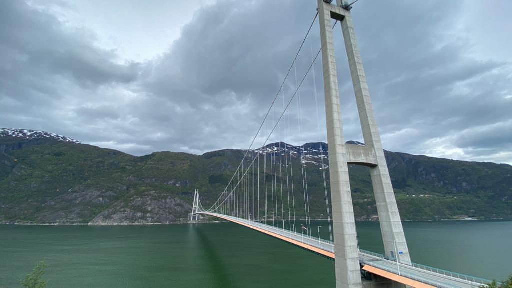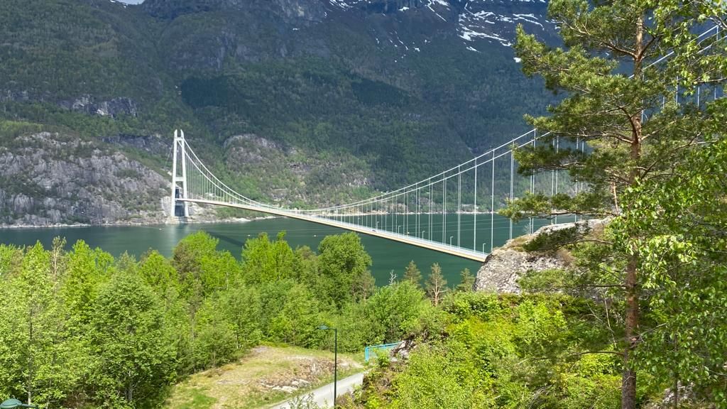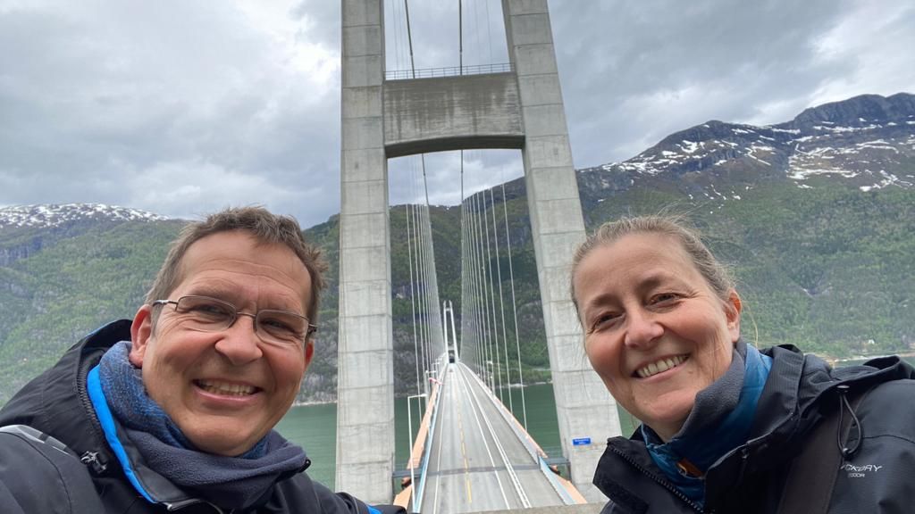 Also ab nach Bergen mit Zwischenstopp an der „Hardangerbru“ (Hardangerbrücke), über die wir dann auch weitergefahren sind (gegen eine kleine „Spende,“ von 117 NOK). Hier haben wir Phil aus der Schweiz kennengelernt 69 Jahre alt, 2 künstliche Hüften und allein mit dem Fahrrad unterwegs – ein echtes Original und krass gut drauf!!!
