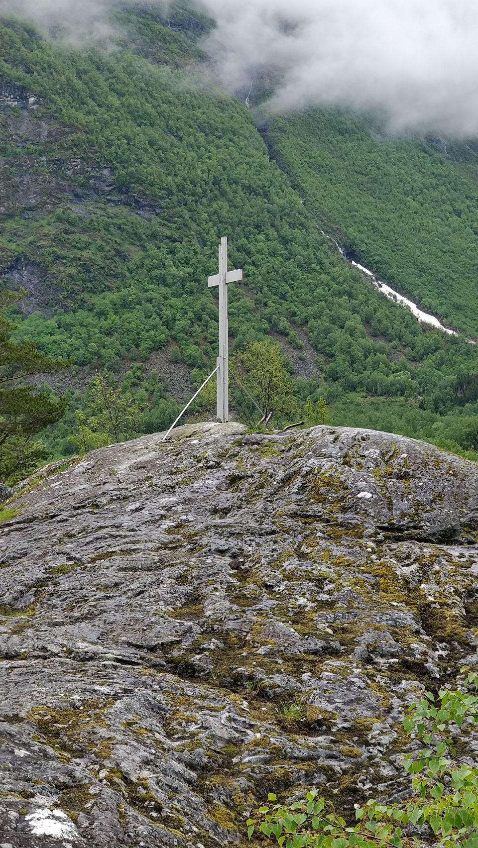 Der Aussichtspunkt war dann ein Info- und Startpunkt für verschiedene Wanderwege – ohne Aussicht 🙃. Von dort ging aber der „Meditationspfad Lodalen“ los (ca. 1 km glaube ich… stand da), ist ja nicht weit und überhaupt – Meditationspfad klingt doch easy … 🙏…. Von wegen – 🪨über Stock und Stein ging es zum (Gipfel-)Kreuz… einmal war es so steil und rutschig, da hat Thom mich mit Cubas Leine „abgeseilt“ 😂… Das Wetter hat gnädigerweise aber mal wieder eine kleine Regenpause für uns eingelegt und wir wurden mit einer schönen View über den See belohnt.