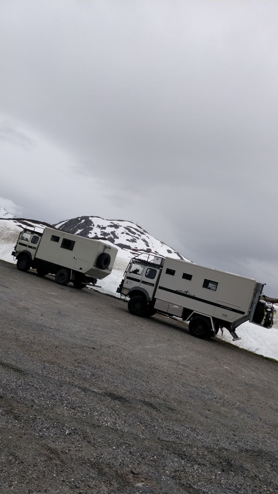 Das Oskar-Team meldet sich und gibt grünes Licht, außerdem hat Thom sich ja schon Mut angetrunken 😆- also wagen wir’s und folgen den beiden zum Gletscherplatz. Es sind übrigens sogar 2 (super enge) Tunnel und dummerweise kam uns tatsächlich (glücklicherweise nur) ein PKW entgegen – da hat echt nur noch ein Blatt Papier dazwischen gepasst. Aber wie so oft: der Aufwand hat sich gelohnt, wie die Bilder zeigen: Ein wirklich außergewöhnlicher Stellplatz mitten im Juni in Schnee und Eis.