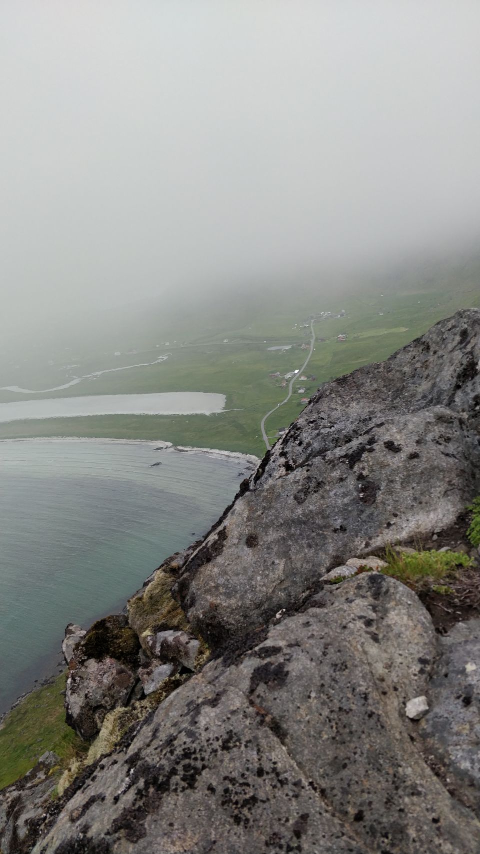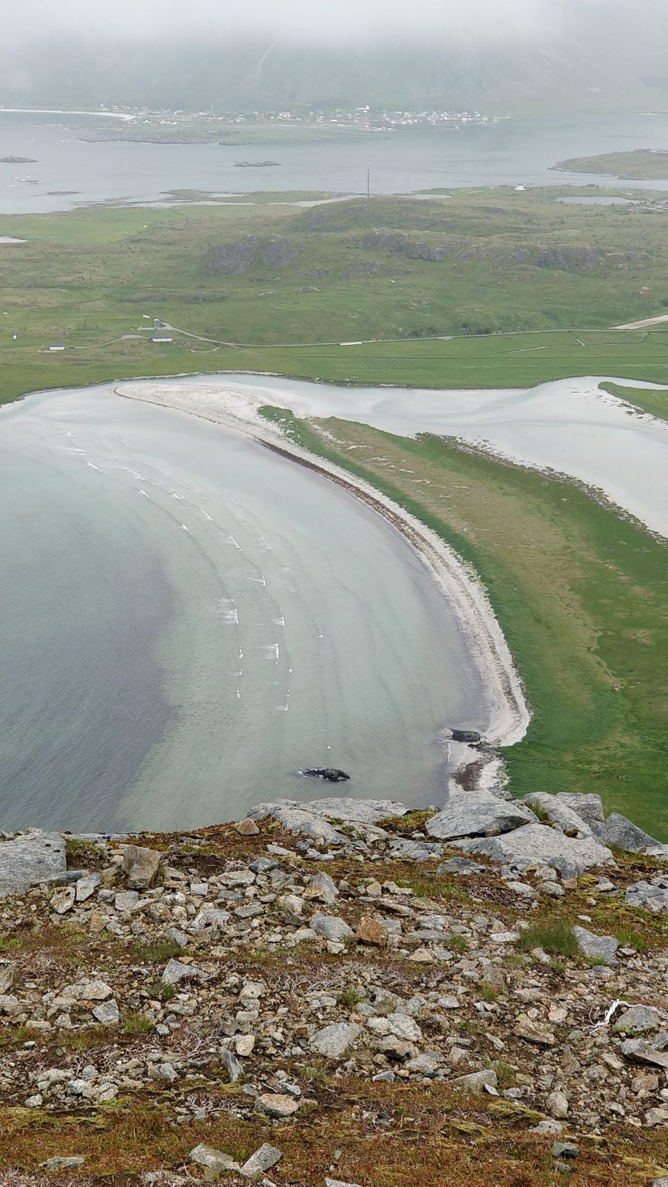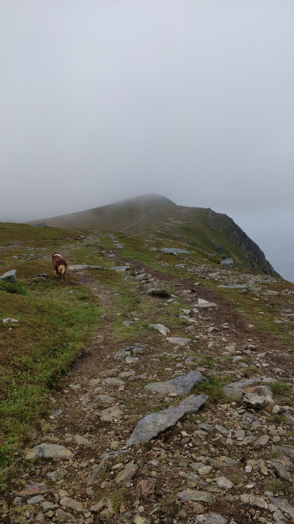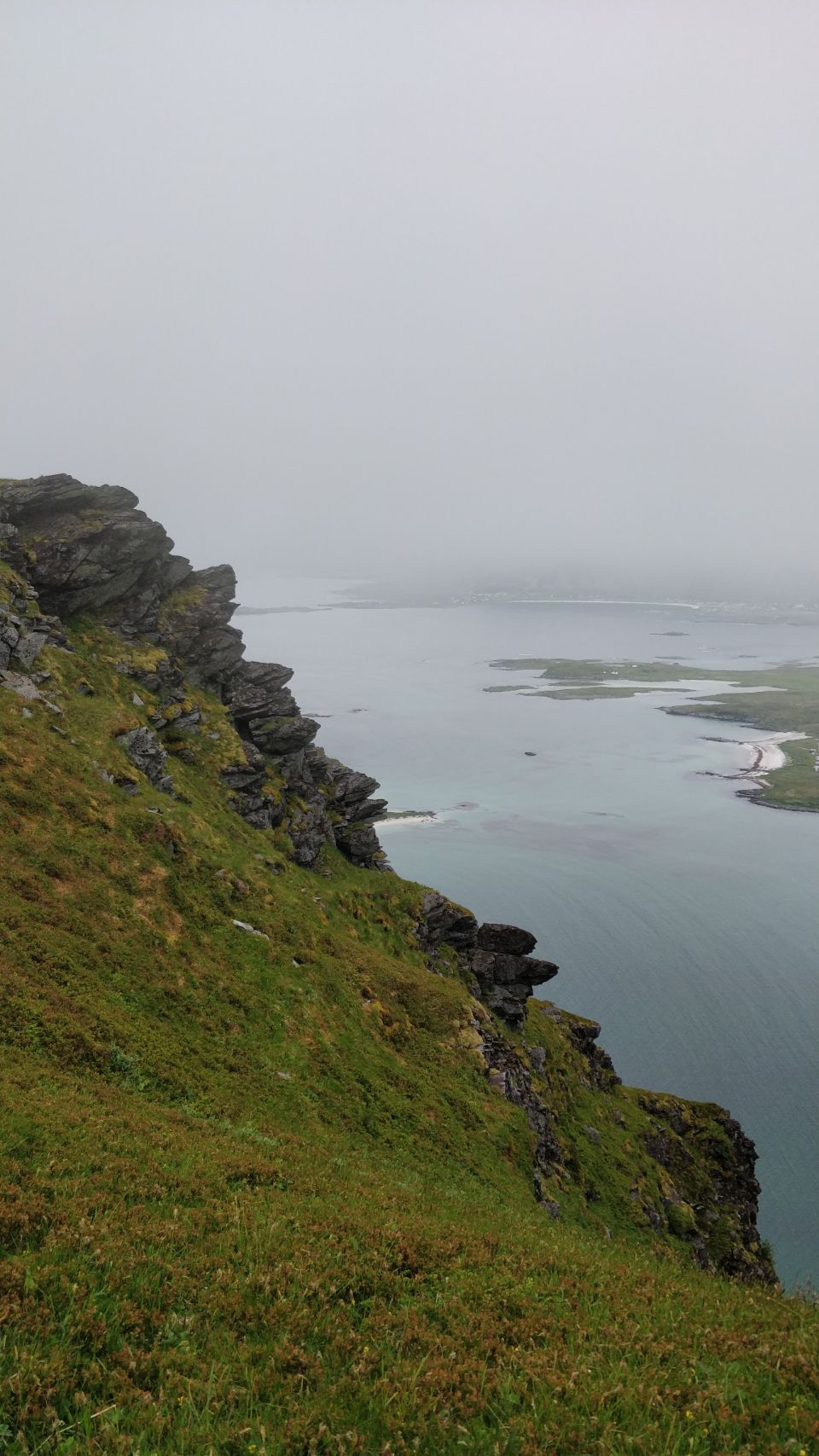 Heute steht eine Tagestour auf den Ytresandheia auf dem Programm. Laut Beschreibung im Internet „familientauglich“, „Schwierigkeitsgrad leicht“… da ich ja immer noch fußlahm bin, aber nicht die ganze Zeit im oder vorm KRÜMEL rumhängen will, erschien diese Wanderung machbar. Leider ist ja immer alles relativ und mir würden hier – auch mit ohne Fußweh – nicht unbedingt die Attribute leicht und familientauglich einfallen, aber gut. Was man anfängt, will man auch zu Ende bringen, also rauf auf den Berg. Im Nachhinein erweist sich dieser Ehrgeiz eher als kontraproduktiv: oben angekommen werden wir leider nicht mit einer phantastischen Aussicht belohnt 😠, sondern mit Schietwetter und Wolken. Tapfer ziehen wir unser Picknick auf dem Plateau durch, bis es uns endgültig zu kalt wird und wir wieder absteigen. So gesehen war der Ausflug fußttechnisch ein Minusgeschäft. Dafür ist es dann abends schön (na toll 😤), so dass wir wenigstens nochmal grillen können 🥩🥖🍻 und ein paar schöne Strandaugenblicke genießen.