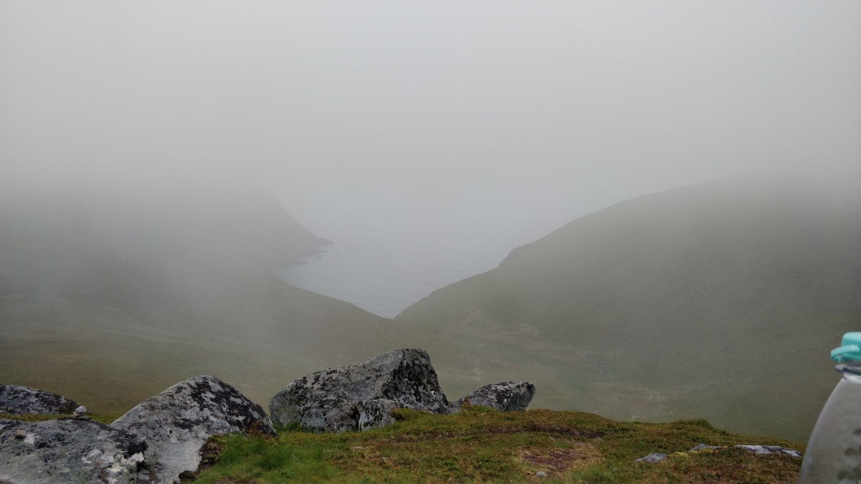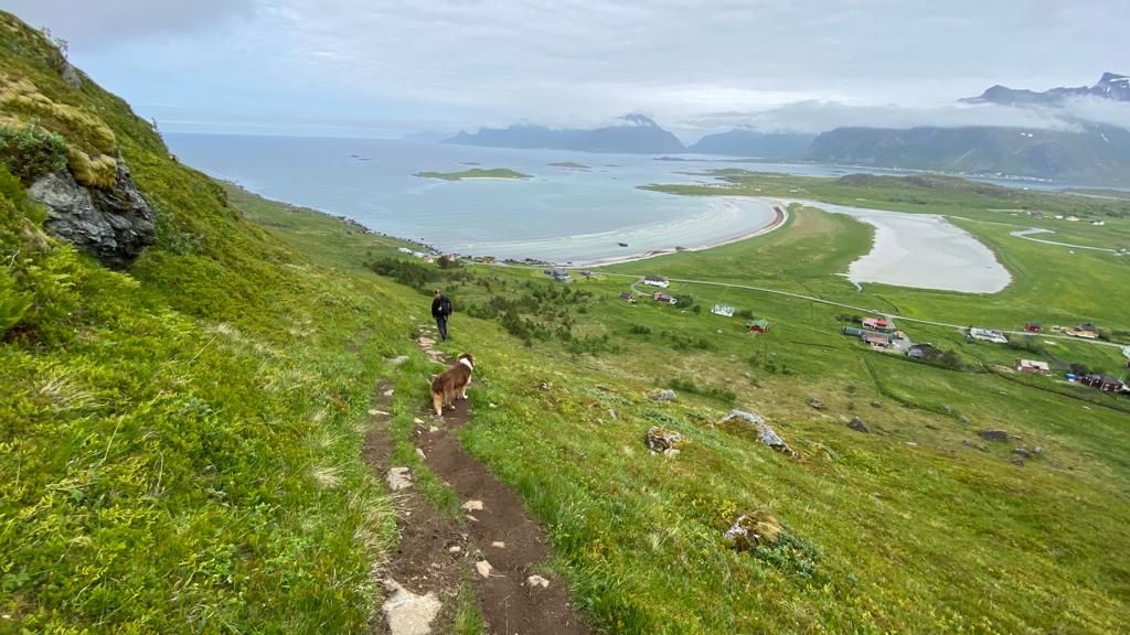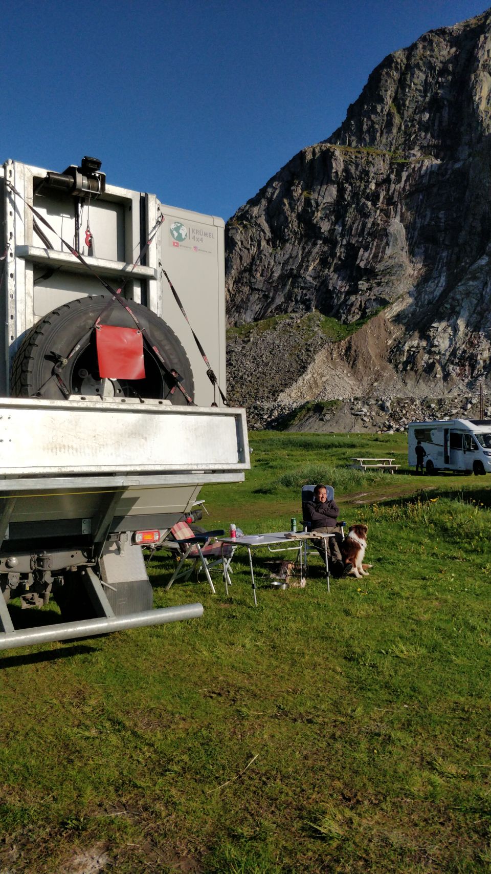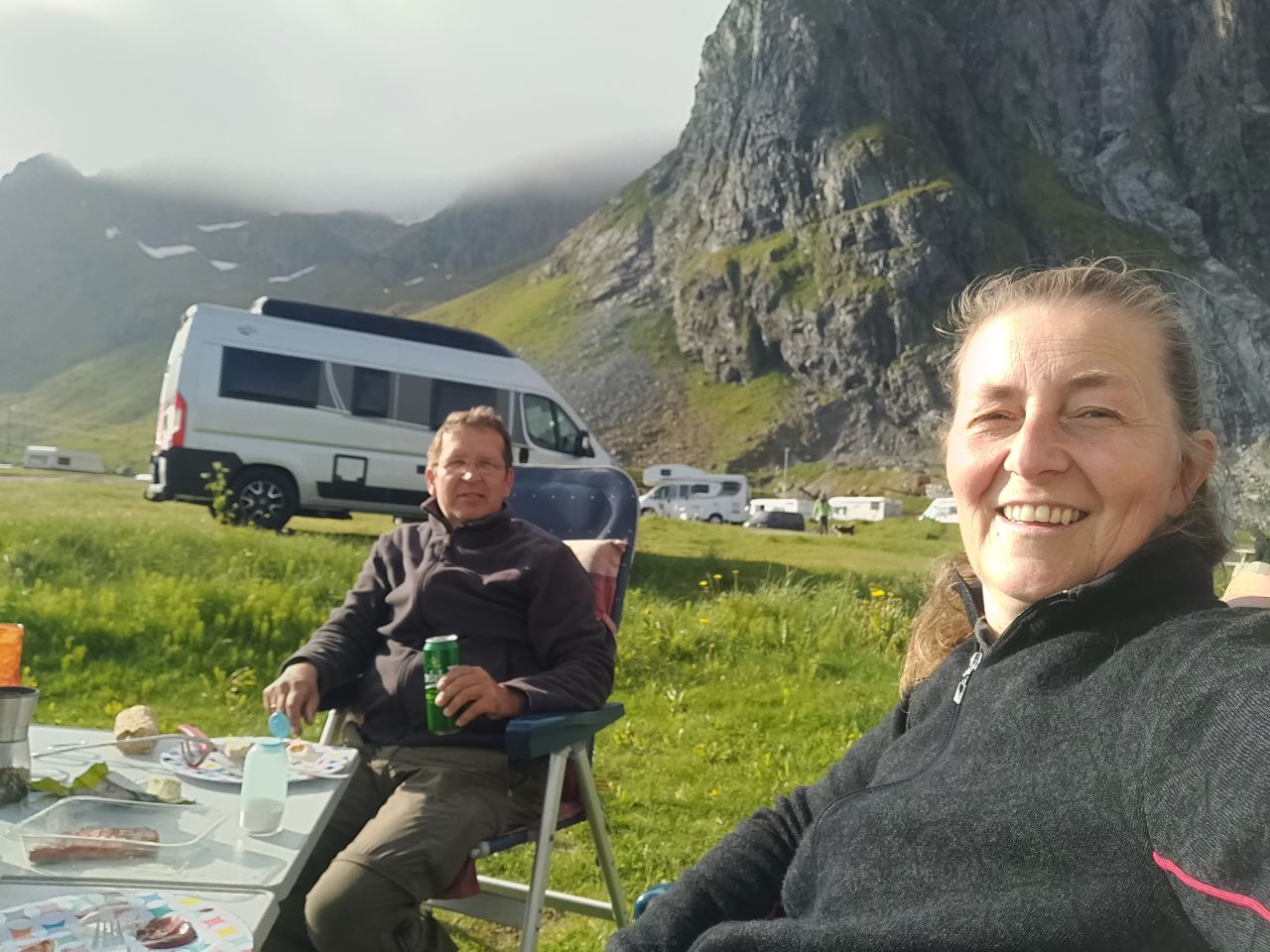 Heute steht eine Tagestour auf den Ytresandheia auf dem Programm. Laut Beschreibung im Internet „familientauglich“, „Schwierigkeitsgrad leicht“… da ich ja immer noch fußlahm bin, aber nicht die ganze Zeit im oder vorm KRÜMEL rumhängen will, erschien diese Wanderung machbar. Leider ist ja immer alles relativ und mir würden hier – auch mit ohne Fußweh – nicht unbedingt die Attribute leicht und familientauglich einfallen, aber gut. Was man anfängt, will man auch zu Ende bringen, also rauf auf den Berg. Im Nachhinein erweist sich dieser Ehrgeiz eher als kontraproduktiv: oben angekommen werden wir leider nicht mit einer phantastischen Aussicht belohnt 😠, sondern mit Schietwetter und Wolken. Tapfer ziehen wir unser Picknick auf dem Plateau durch, bis es uns endgültig zu kalt wird und wir wieder absteigen. So gesehen war der Ausflug fußttechnisch ein Minusgeschäft. Dafür ist es dann abends schön (na toll 😤), so dass wir wenigstens nochmal grillen können 🥩🥖🍻 und ein paar schöne Strandaugenblicke genießen.
