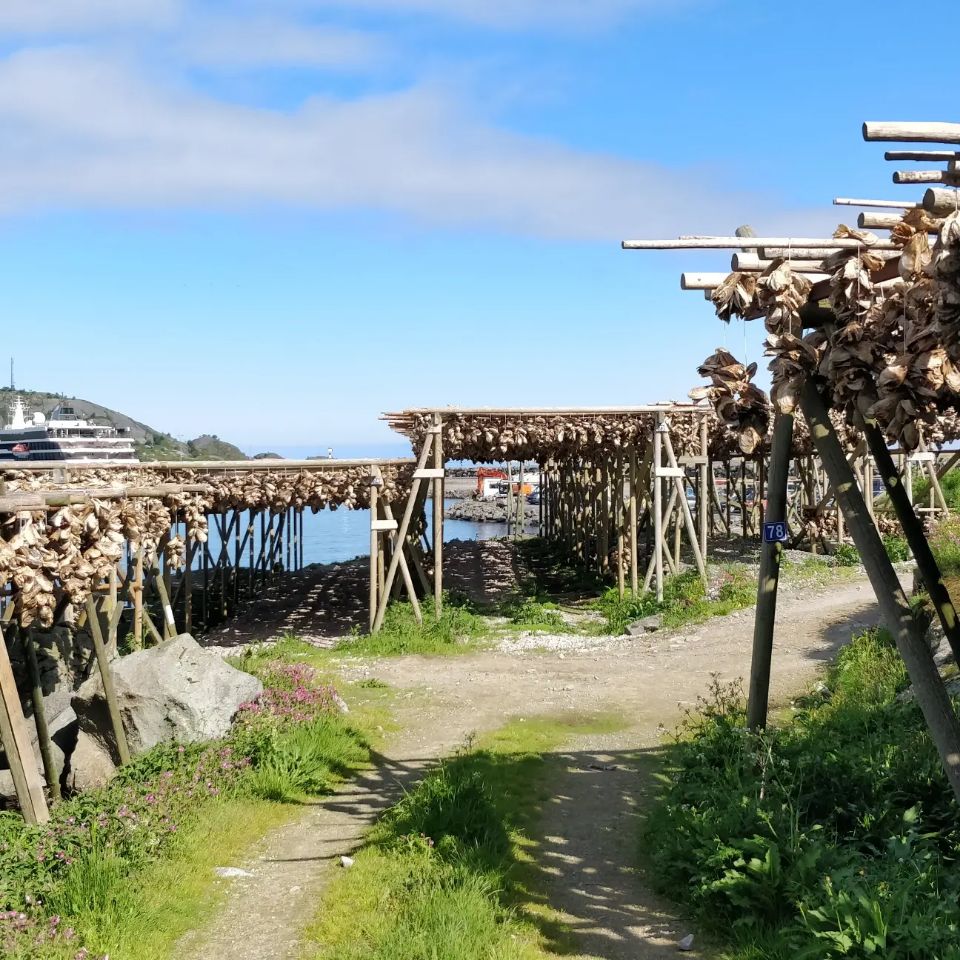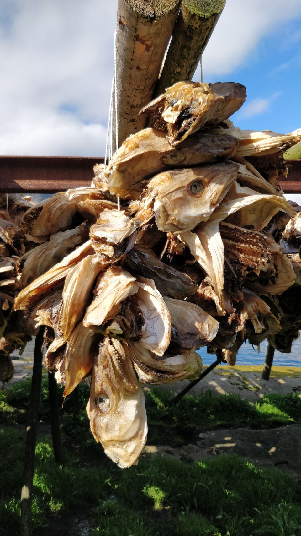 Danach gucken wir uns eine von den „Fisch-Plantagen“ an, die sieht man hier überall: große Gestelle aus Holz, auf denen Fische getrocknet werden. Man riecht sie nicht, bevor man sie sieht …🐟🐟👃…und in Nahaufnahme kommt das schon ein bisschen gruselig rüber 🔎😵‍💫.
