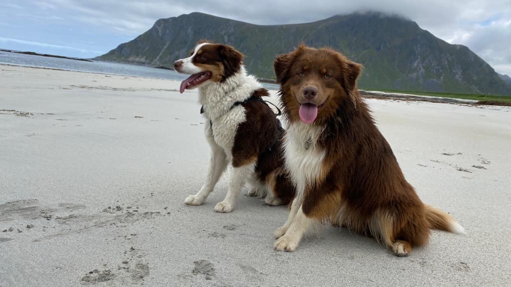 Praktischerweise hat Cuba ja gestern Gioia kennengelernt – das nutzen wir direkt mal aus: heute wollen wir mit der Husky eine Fotosafari über die südliche Insel der Lofoten machen und da wir leider den Beiwagen vergessen haben (🫢) muss Cuba ein paar Stunden im KRÜMEL bleiben. Damit er dafür entsprechend ausgepowert ist, gibt’s erst einmal eine ordentliche Spiel- und Tobesession mit Gioia 🐶🐾🐶🐾. Das können die beiden glaube ich den ganzen Tag machen 😍. Zum Glück für uns verstehen wir uns mit Gioias „Begleitpersonen“ Edith und Pit auch sehr gut, was unseren Spielkindern wiederum zugute kommt….🗣️💬