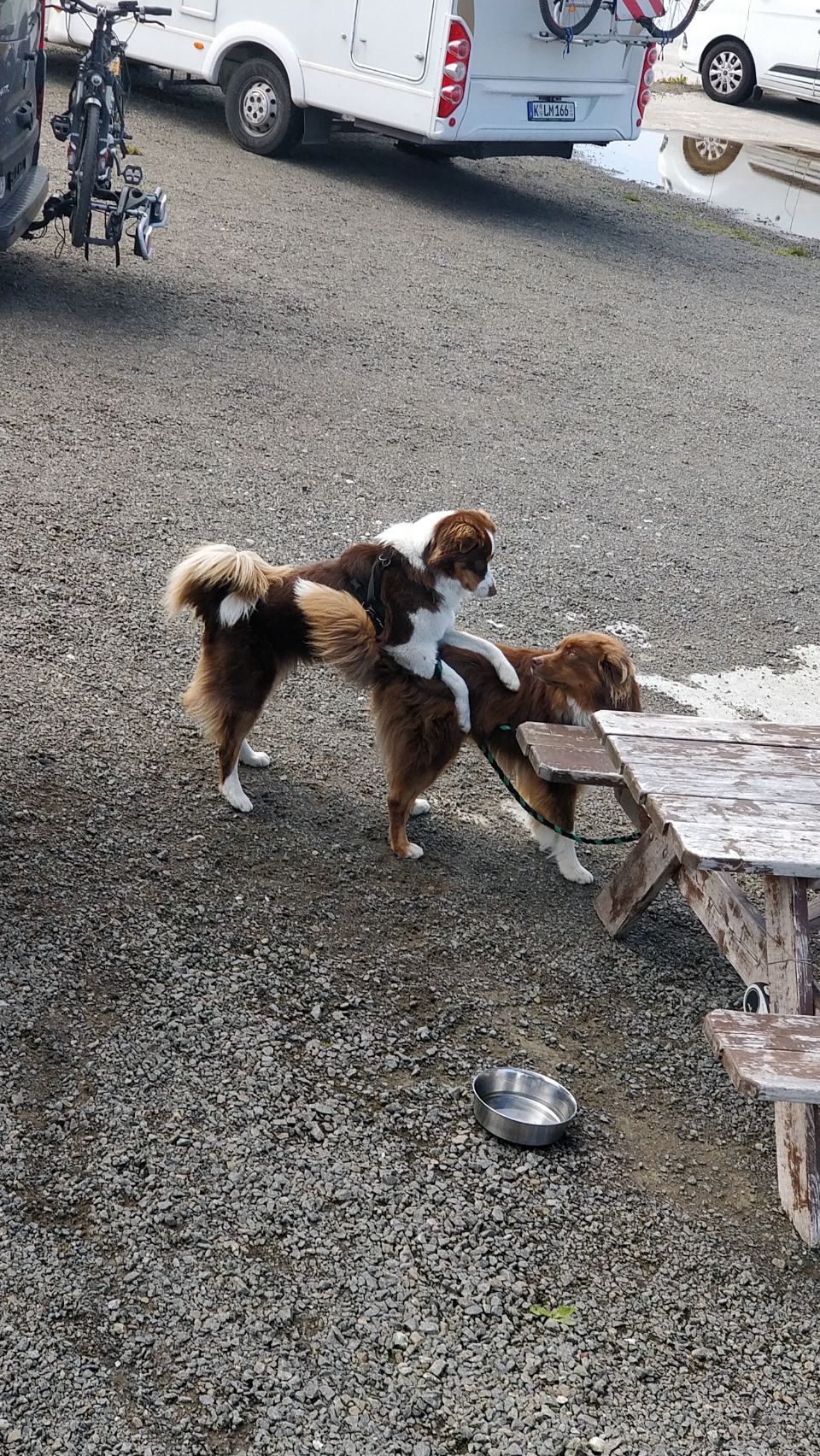 Mit KRÜMEL als Backup (der ist ja schon hier hoch gekommen 🏁) trauen sie sich auch und zur Freude der Fellnasen können die beiden nun den ganzen Abend zusammen rumrennen ohne Leine – hier ist ja keiner außer uns! Abgesehen natürlich von der x-tausend Mücken natürlich 🦟🦟🦟.