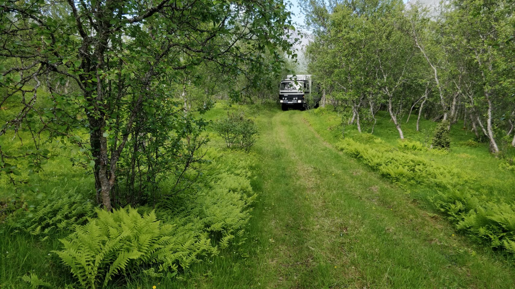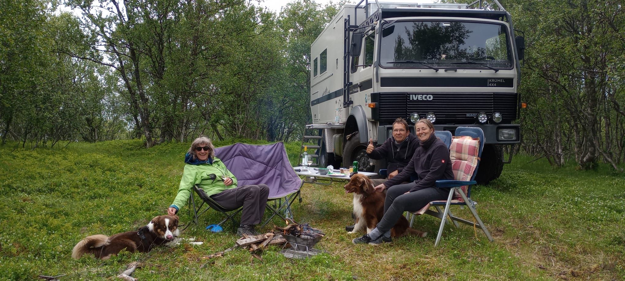 Wir machen uns auf die Suche nach unserem anvisierten und als Offroad-Platz ausgewiesenen Ziel für heute. Zur Sicherheit erkunden wir die Zufahrt durch den Wald erstmal zu Fuß, scheint machbar 👍, ich mache die Kamera klar und Thom holt den KRÜMEL … und wen gabelt er unten an der Straße auf? 3 x dürft ihr raten – 🤔 – es sind natürlich „unsere Schweizer“ 🧍🏼♂️🧍🏼♀️🐕 mit ihrem tollen Bimobil.