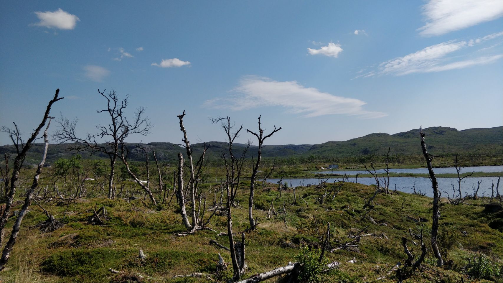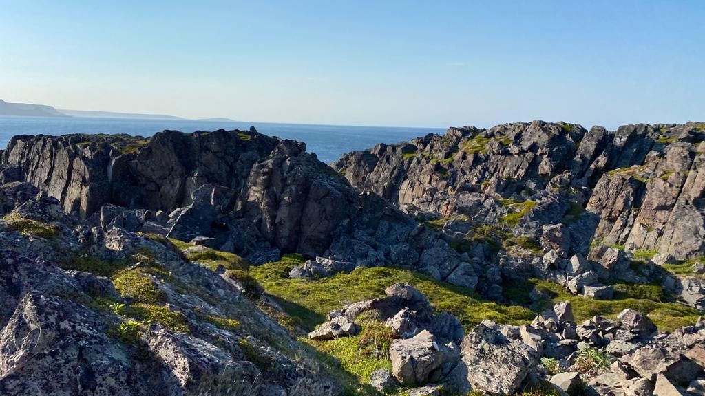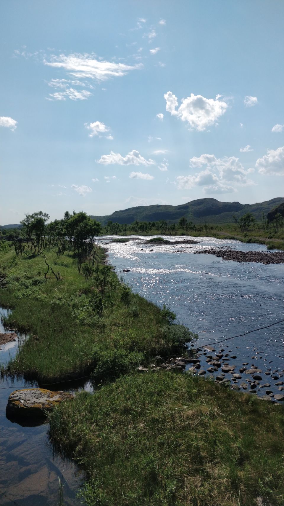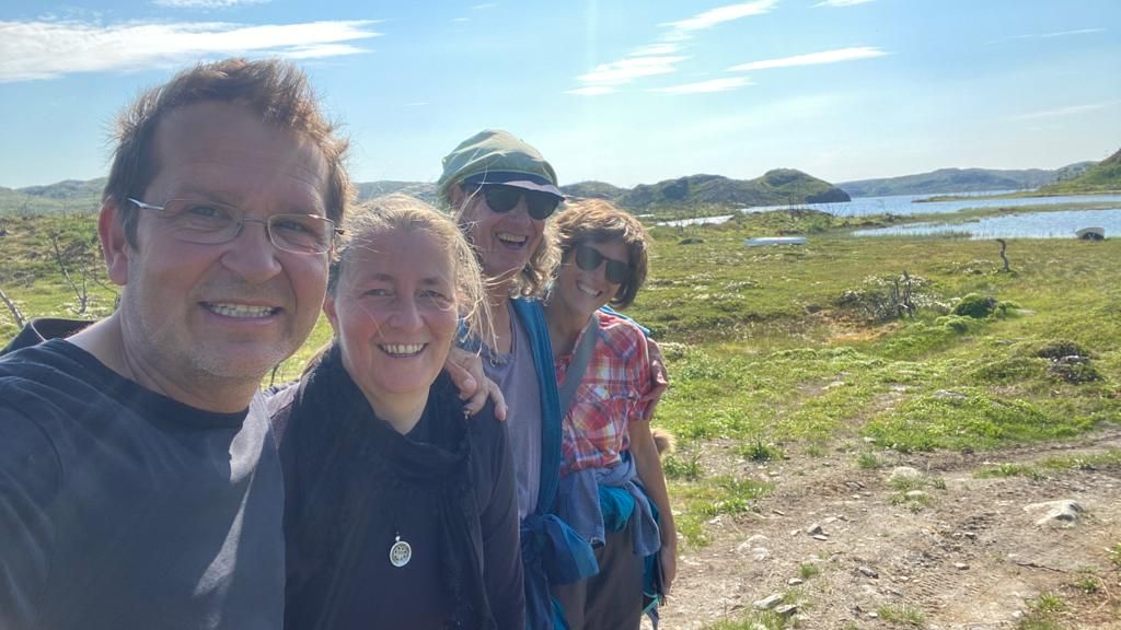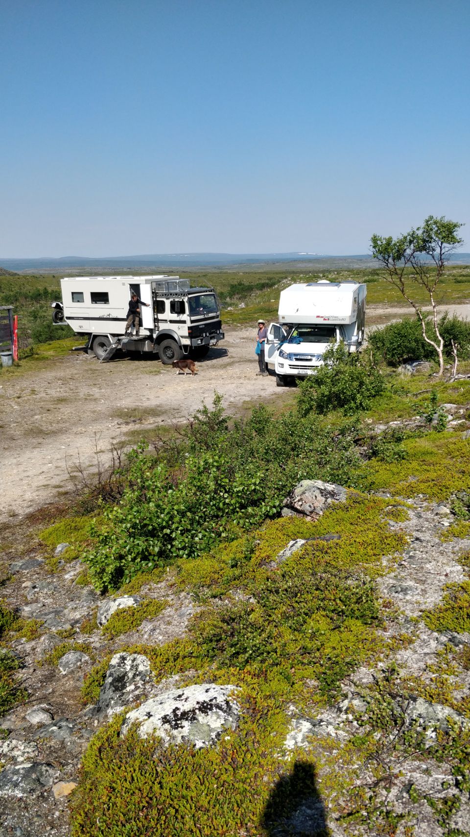 Die Sonne ist zurück und wir können zusammen draußen frühstücken. Cuba und Gioia freuen sich, dass sie hier die ganze Zeit frei rumtoben und spielen können 🐶🐶. Nur wenn mal wieder einer der Angler (das sind nämlich die, die durch den Fluss zu ihrem Angelplatz bzw. zu ihren Booten fahren) müssen wir die beiden einfangen… Und Thom und Edith hadern immer noch mit der verpassten Flussdurchquerung 😤😥. Zum Trost machen wir alle zusammen nochmal eine schöne kleine Wanderung durch die phantastische Landschaft. Es ist wie in Afrika, ein kleines Flussdelta mit Hügeln, Wiesen und Felsen drum herum – super schön 🤩.