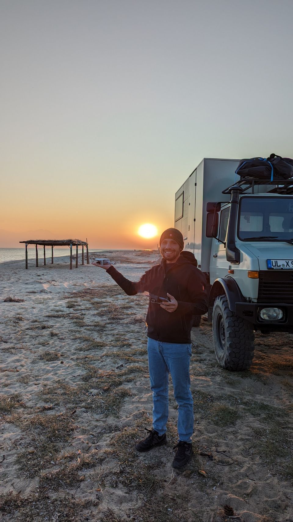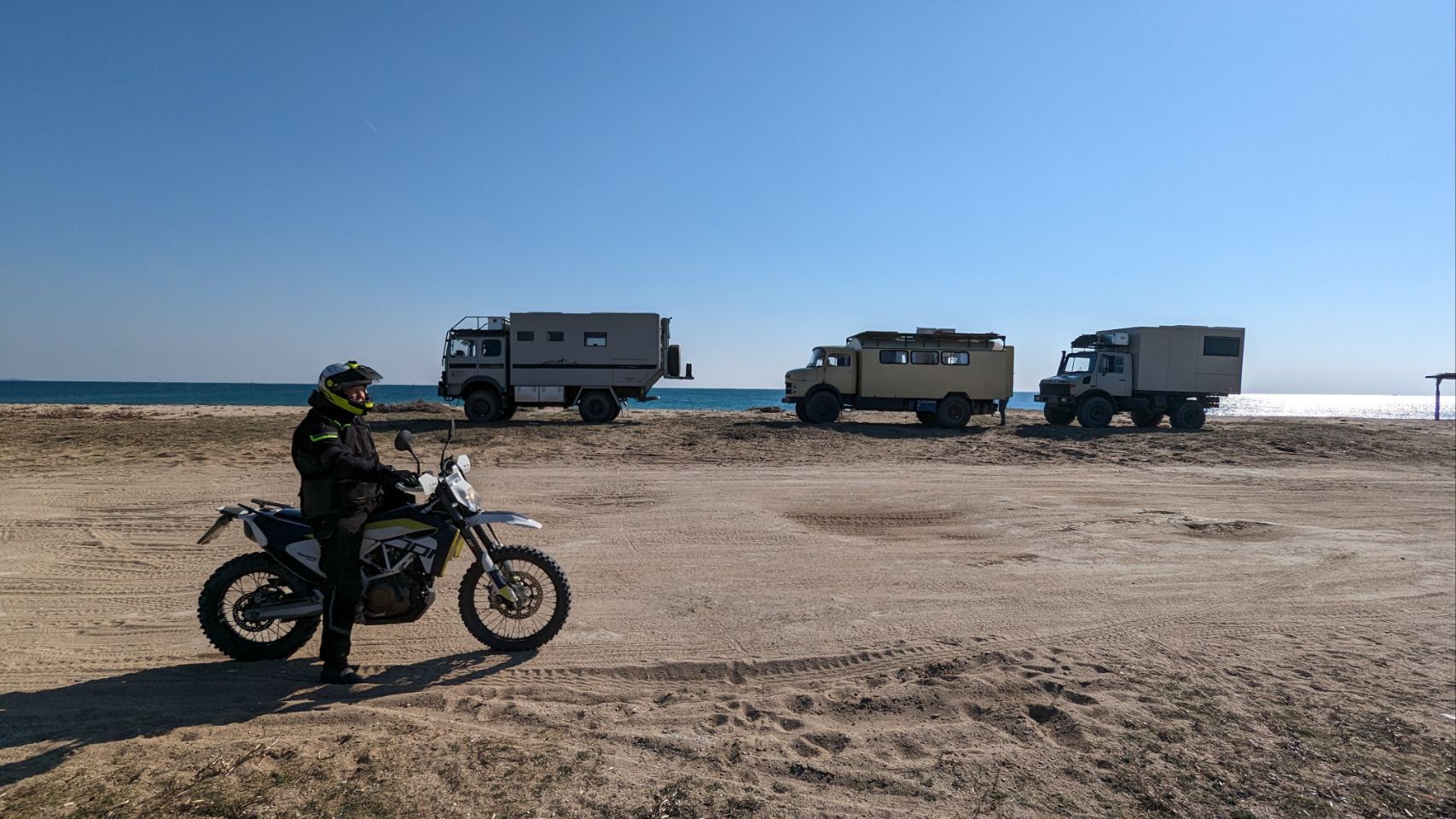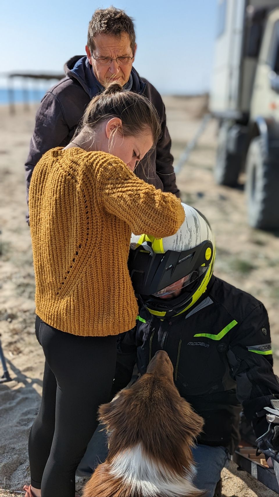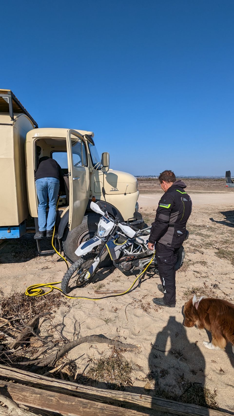 Es geht los mit einer kleinen Runde Motorrad fahren im Sand: nach kleinen Startschwierigkeiten bei der Husky (🪫 Batterie komplett leer – keine Idee warum 🤔) und Starthilfe von Niklas und dem old.truck (🔋) kann es endlich losgehen 🏍️💨. Niklas fühlt sich auch ziemlich wohl auf Thoms Mopped (oh,oh, Maybrit 🙈), Thom sowieso, und das Gelände macht beiden Spaß!