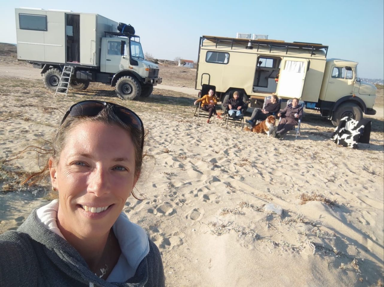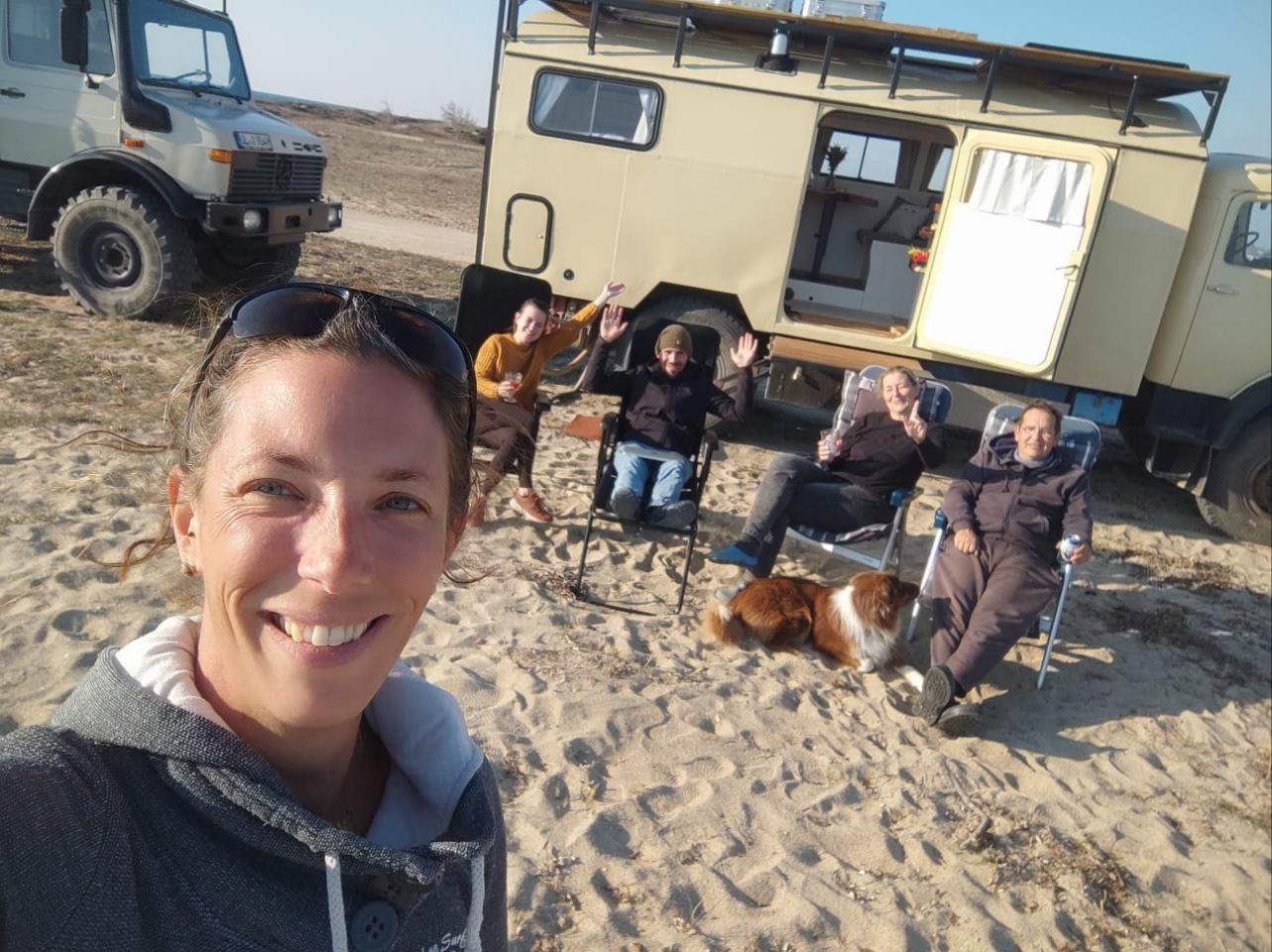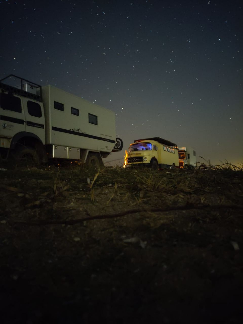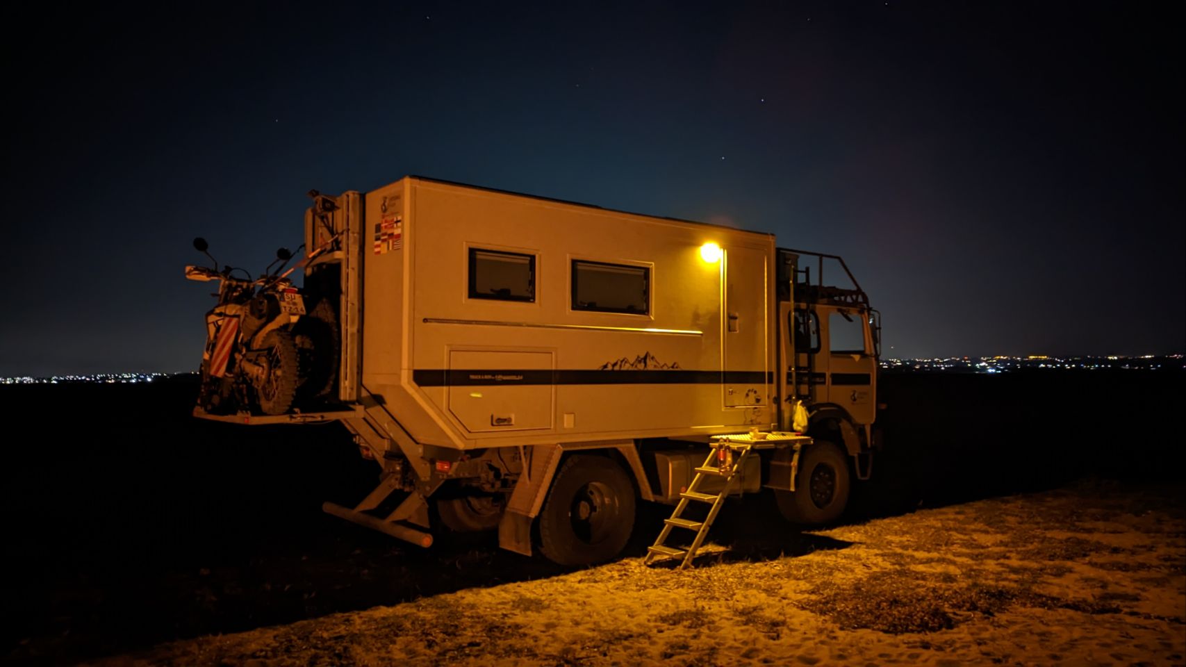 Es geht los mit einer kleinen Runde Motorrad fahren im Sand: nach kleinen Startschwierigkeiten bei der Husky (🪫 Batterie komplett leer – keine Idee warum 🤔) und Starthilfe von Niklas und dem old.truck (🔋) kann es endlich losgehen 🏍️💨. Niklas fühlt sich auch ziemlich wohl auf Thoms Mopped (oh,oh, Maybrit 🙈), Thom sowieso, und das Gelände macht beiden Spaß!