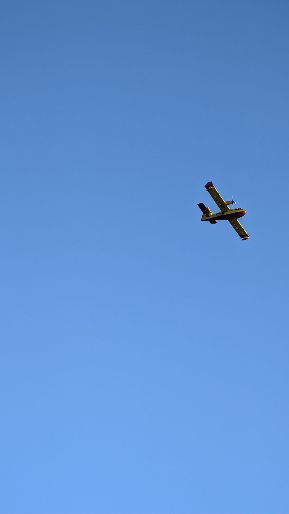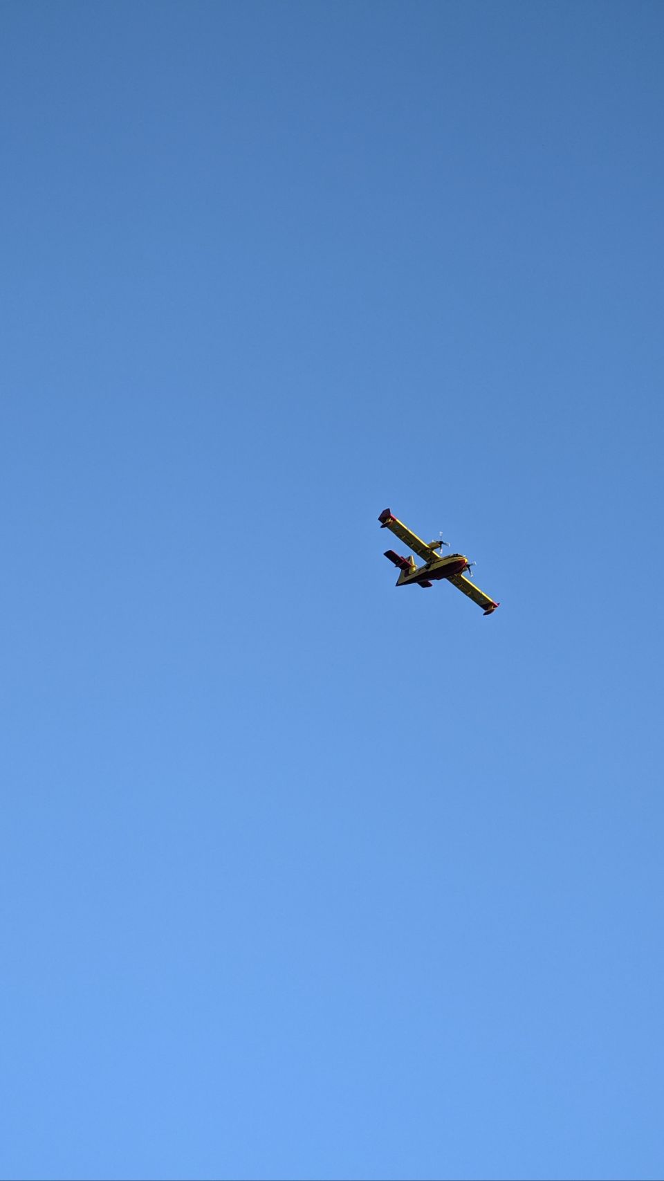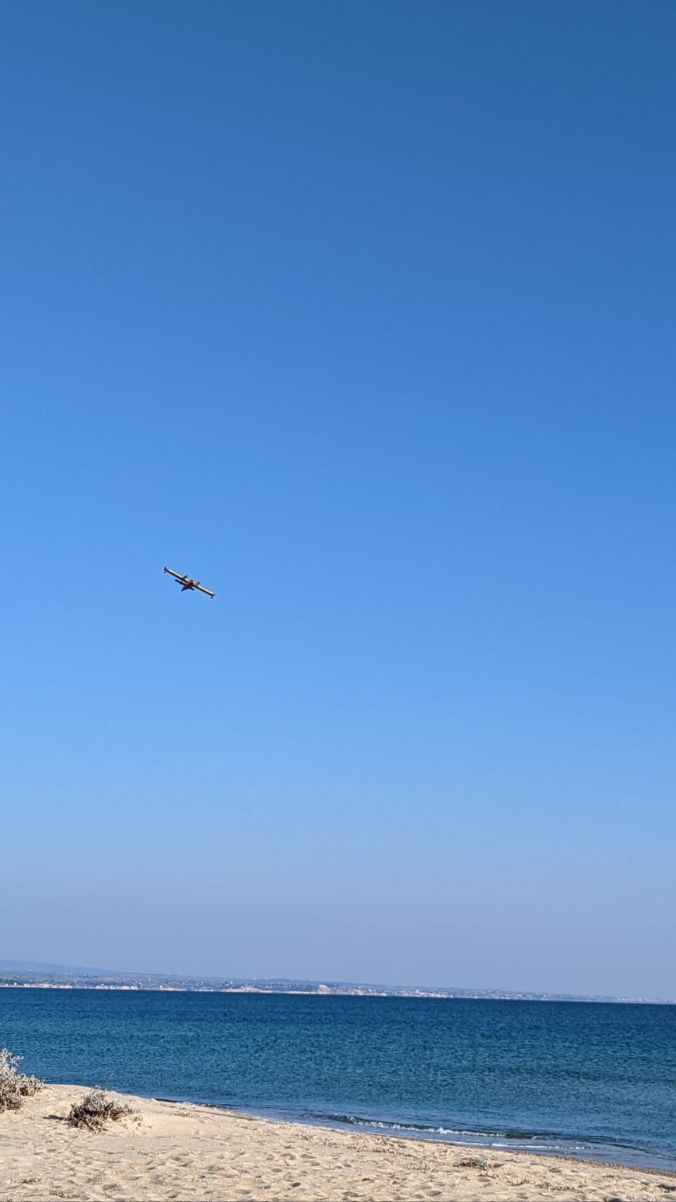 Wir genießen den schönen Tag gemeinsam mit Julia, Maybrit und Niklas hier am Strand als – wie für uns bestellt – ein Löschflugzeug über dem Meer auftaucht und Wasser abwirft 🛩️💦… Schnell wird klar, dass hier das Wasser aufnehmen und abwerfen für den Ernstfall geübt wird und als der Pilot mitbekommt, dass ein dankbares Publikum das Spektakel gespannt verfolgt, sorgt er dafür, dass wir auch ja alles gut sehen können und die Abwürfe quasi in der ersten Reihe mitbekommen. Nach der letzten Runde „winkt“ er mit den Flügeln zum Abschied und signalisiert, dass die Show jetzt vorbei ist 🙏👋.
