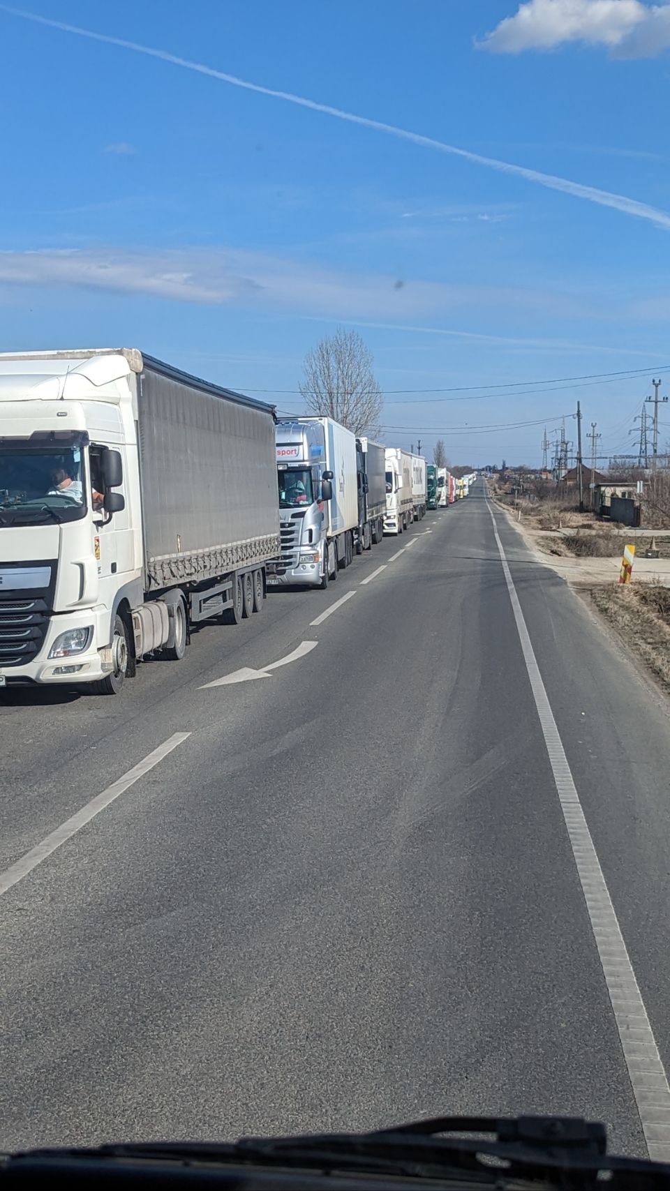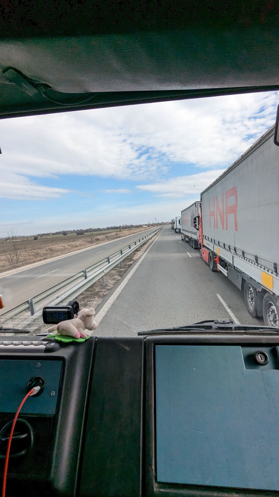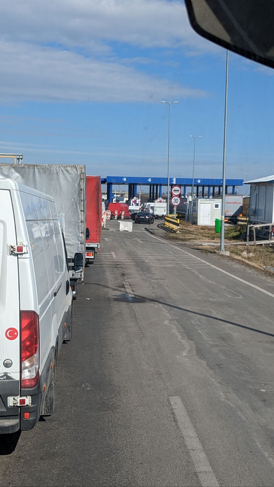 Die letzten (ca 8 ?) Kilometer vor der Grenze fahren wir vorbei an Hunderten von LKW, die bestimmt ewige Stunden auf ihre Grenz- und Zollabfertigung warten. Wir sind sehr gespannt, wie wir mit unserem „LKW“ auf der „PKW-, Spur“ durchkommen 🚙🚗🚚🚗🚙