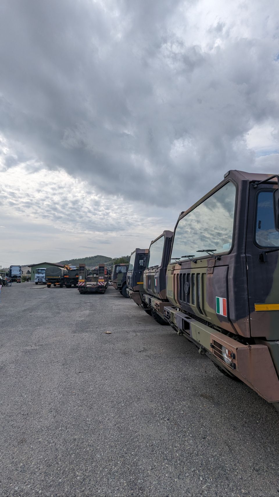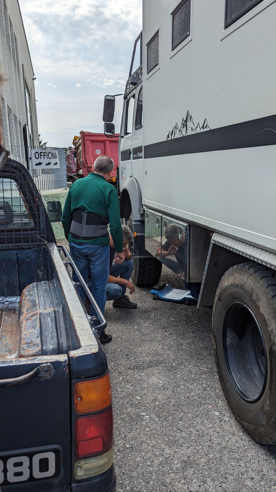 Die Leute bei GTS General Truck Service sind super nett, hilfsbereit und interessiert und definitiv sind wir hier richtig, denn der ganze Hof steht voll mit alten italienischen Militärfahrzeugen, die aber noch im Dienst sind (deswegen dürfen wir keine Bilder und Videos davon machen). Mit Hilfe von Rossella, die halbwegs Englisch spricht, Google Übersetzer und der definitiv besser geschulten Nase des Mechanikers wird dann klar: das Problem ist ein undichter Radbremszylinder 🙁.