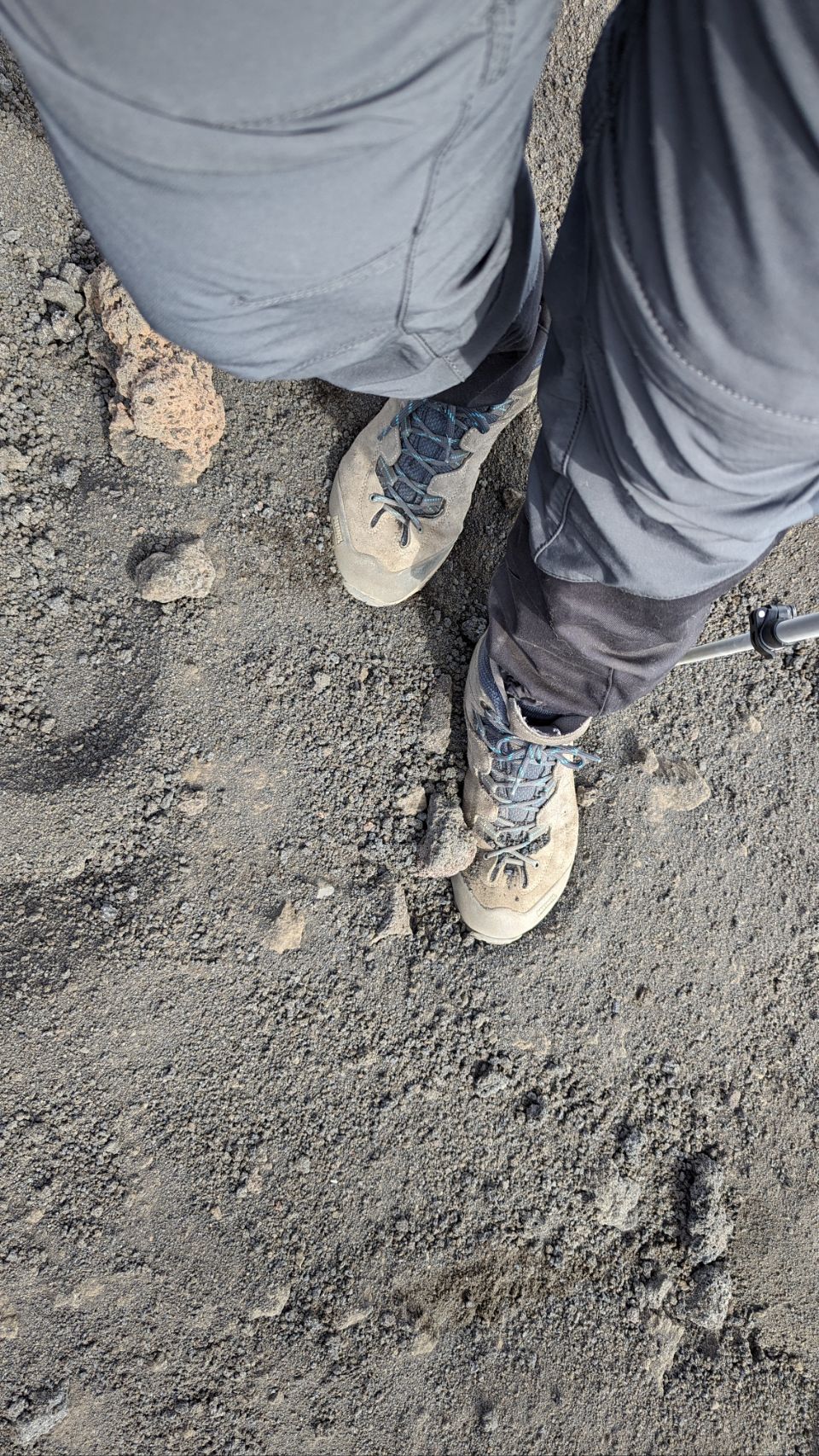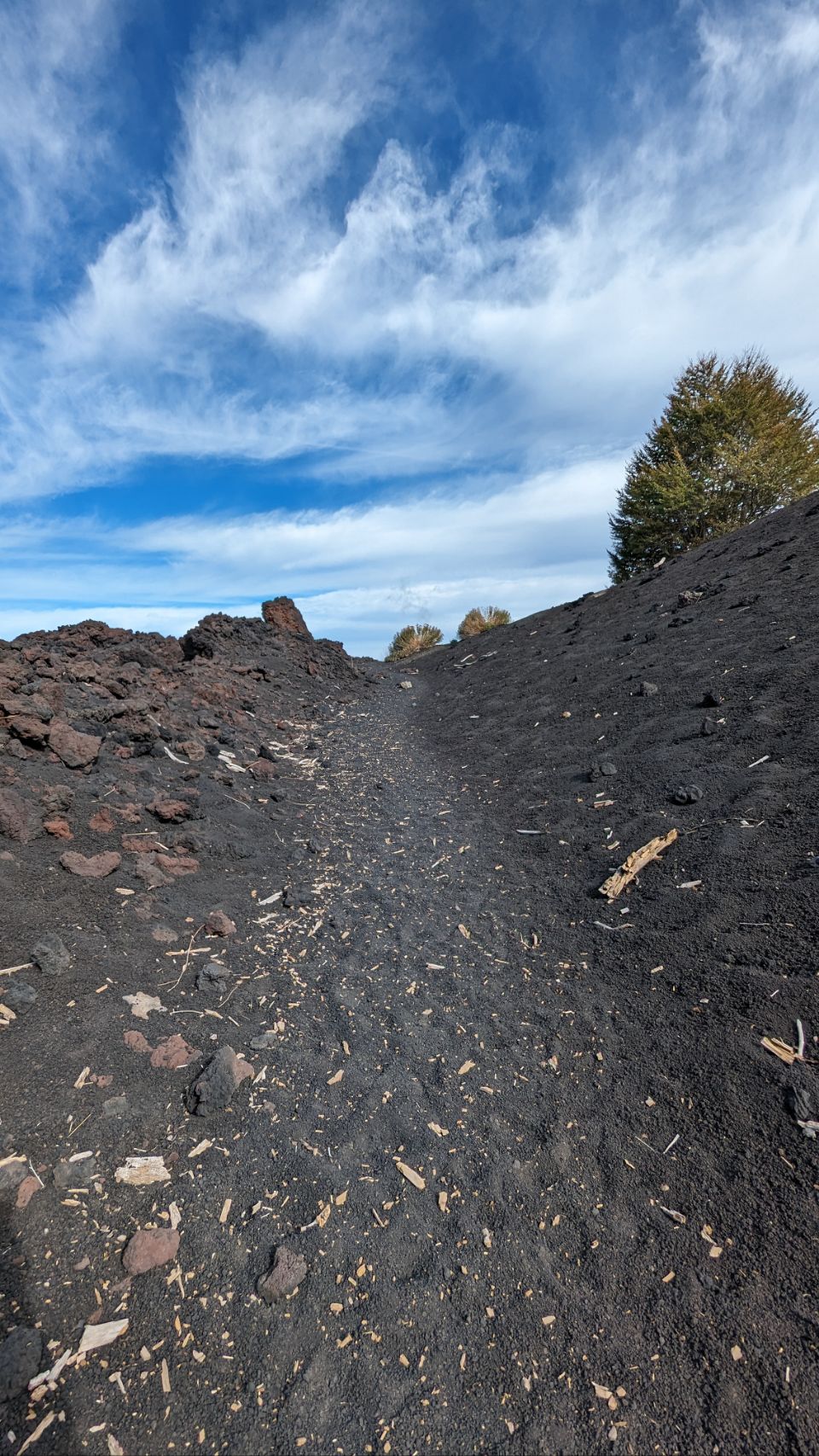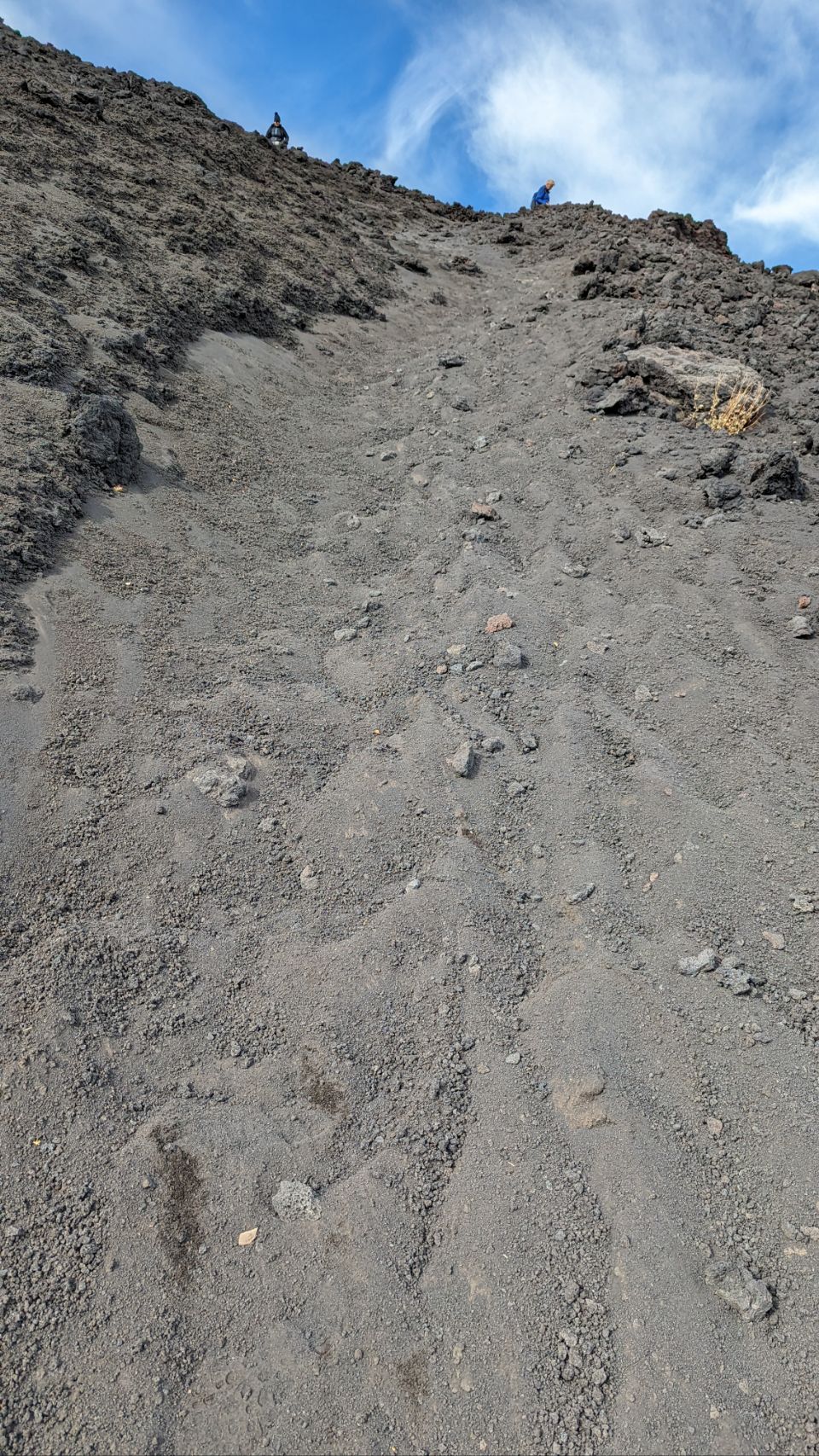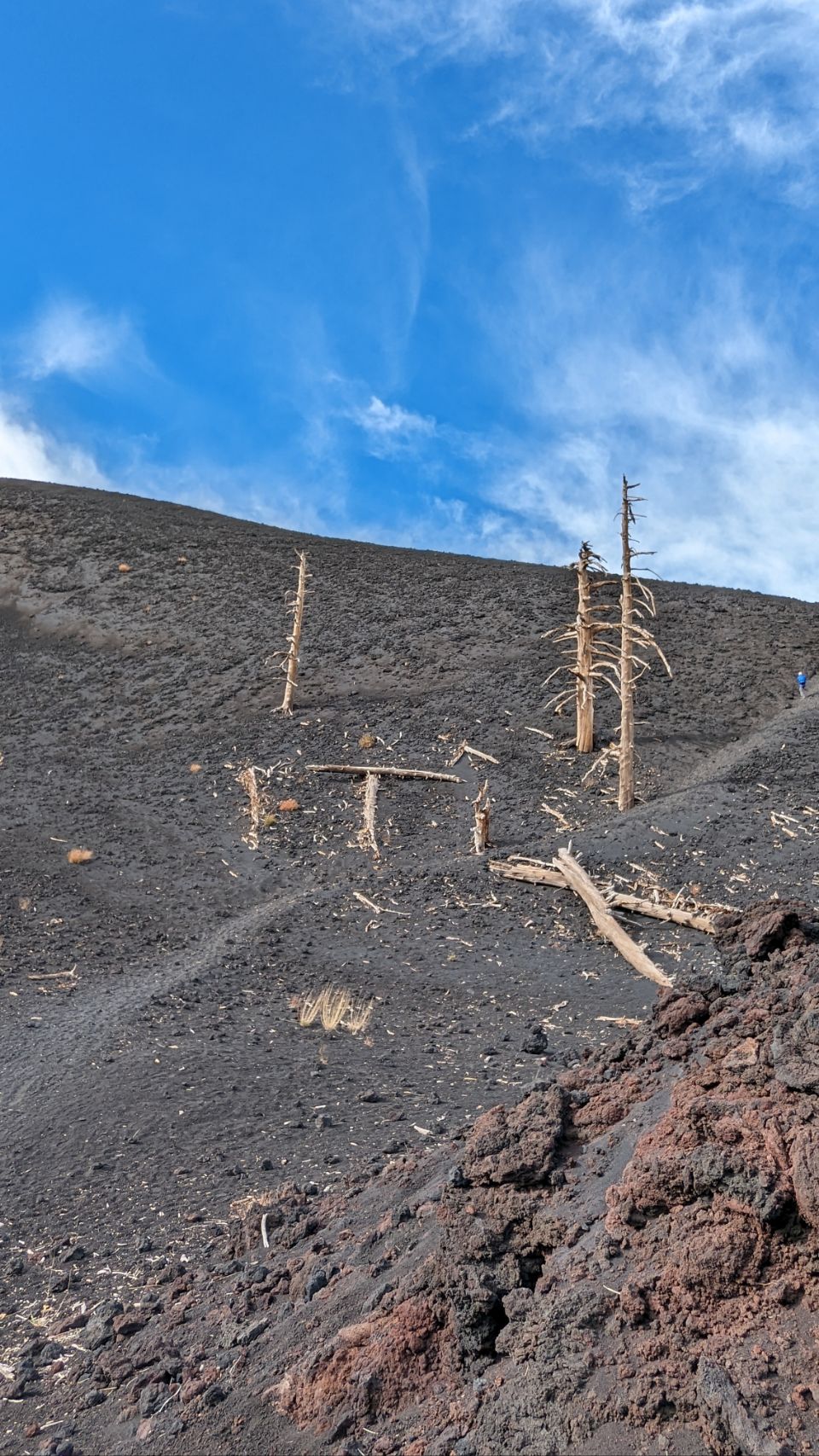 Vom Krater von 2002 aus entscheide ich mich, statt zu fahren, den letzten Teil zu Fuß bis zur Station runterzugehen, das wird dann doch nochmal ein bisschen anspruchsvoller und meine Wanderstöcke kann ich hier dann auch noch gut gebrauchen (doch nicht umsonst im Rucksack mitgeschleppt), denn es geht zwar bergab, aber mitten durchs Gelände über scharfkantige Lava und weiche rutschige Vulkanasche.