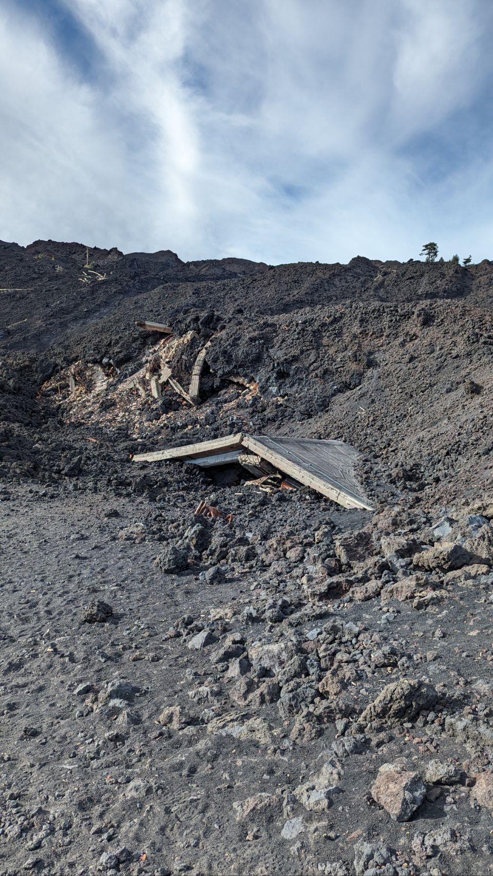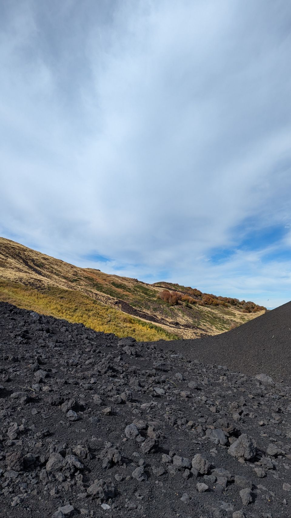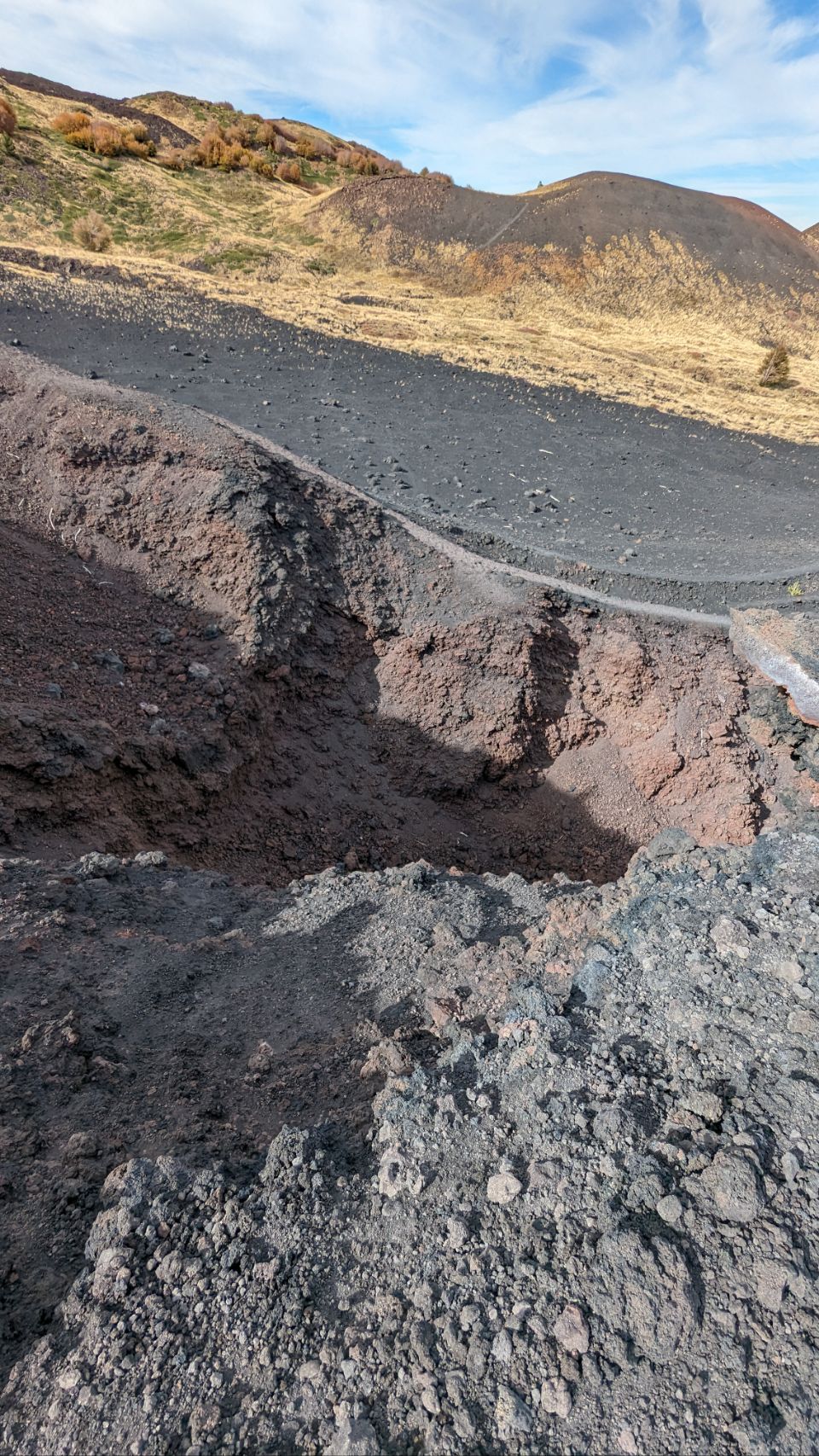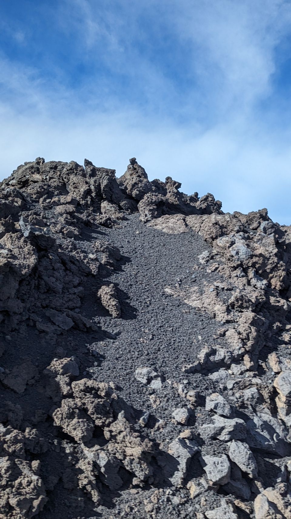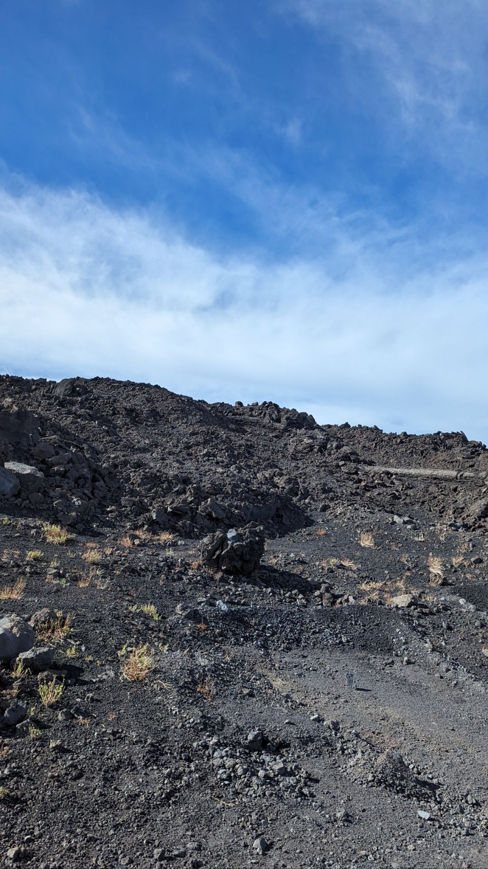 Vom Krater von 2002 aus entscheide ich mich, statt zu fahren, den letzten Teil zu Fuß bis zur Station runterzugehen, das wird dann doch nochmal ein bisschen anspruchsvoller und meine Wanderstöcke kann ich hier dann auch noch gut gebrauchen (doch nicht umsonst im Rucksack mitgeschleppt), denn es geht zwar bergab, aber mitten durchs Gelände über scharfkantige Lava und weiche rutschige Vulkanasche.