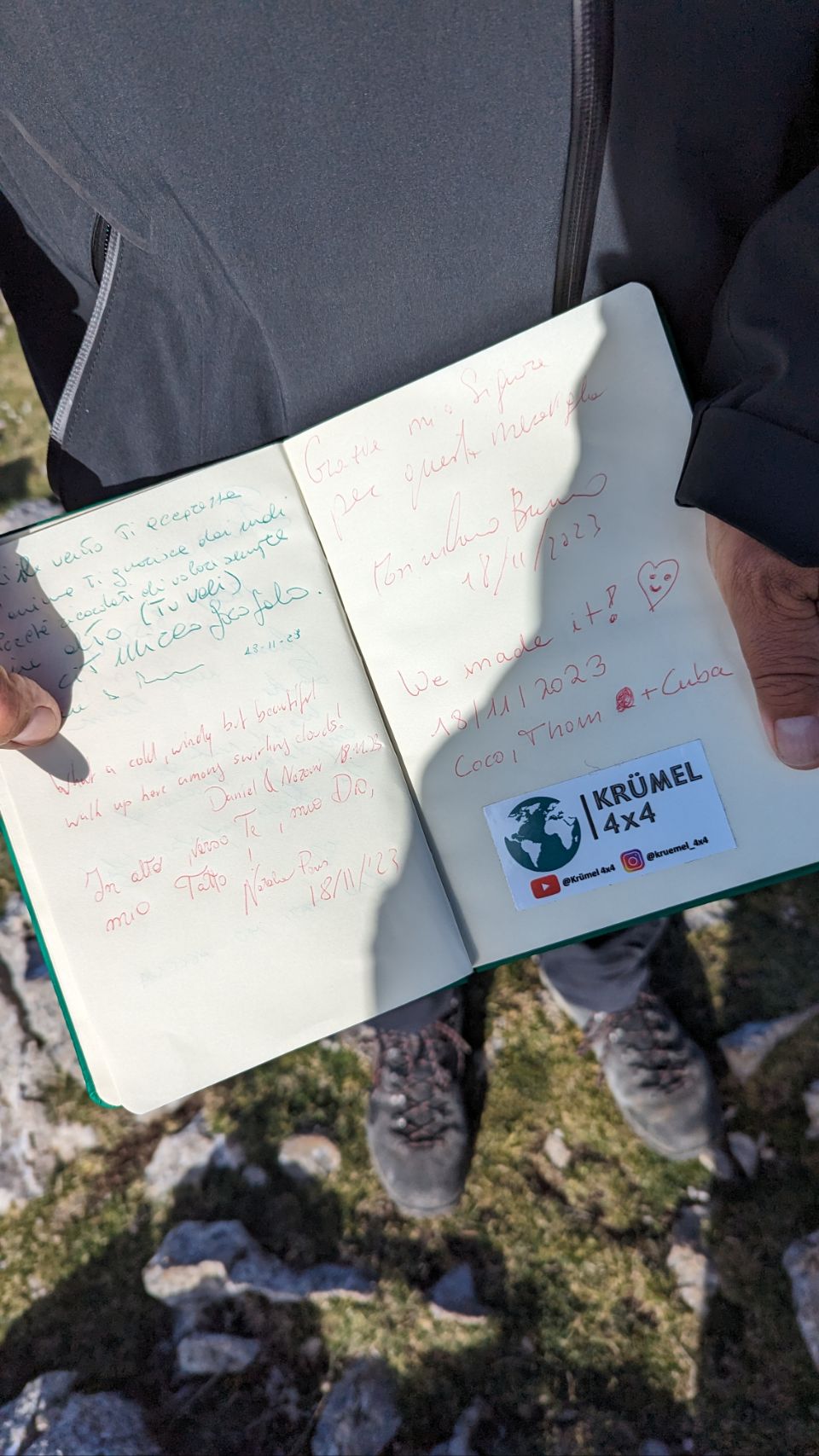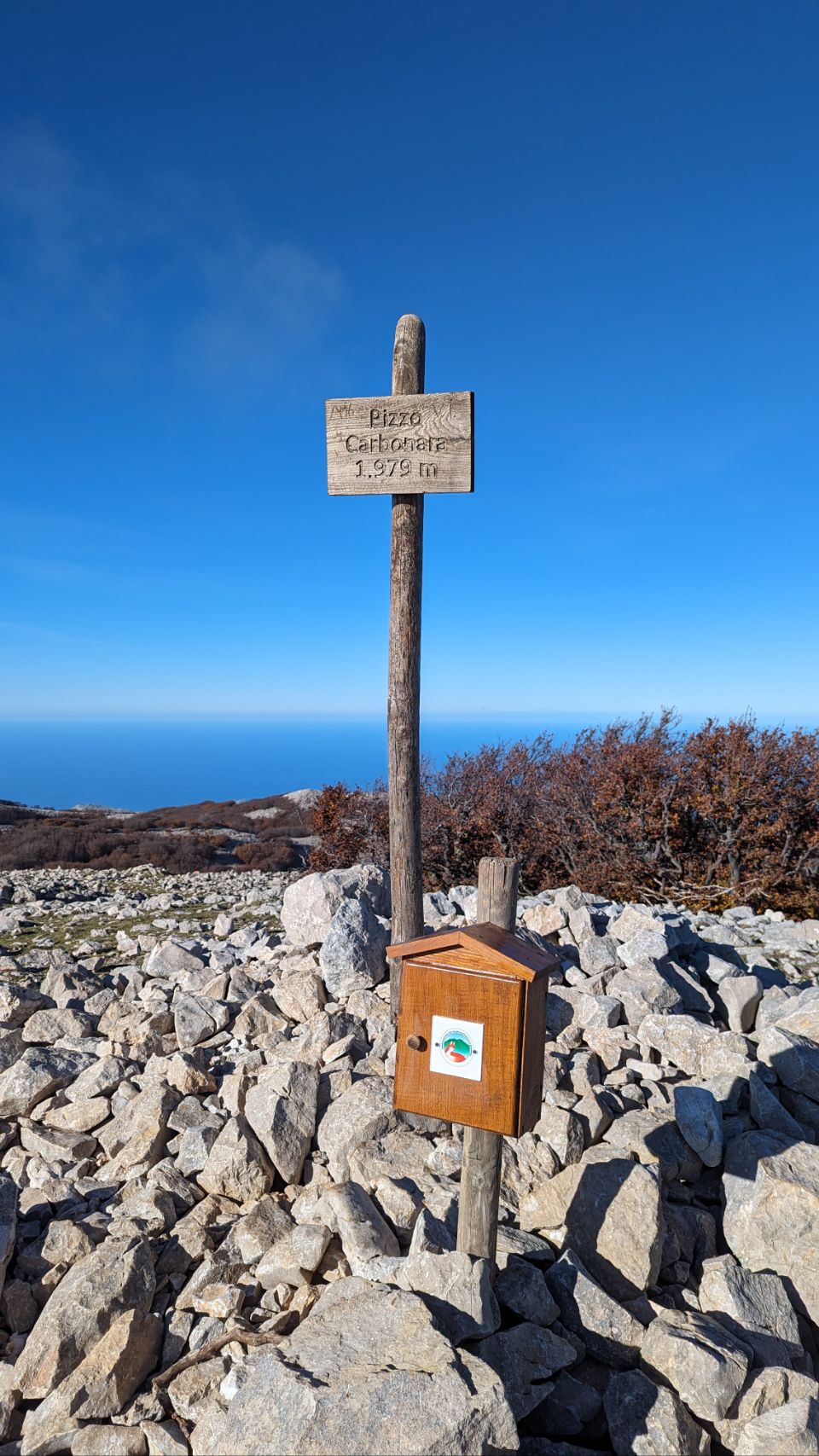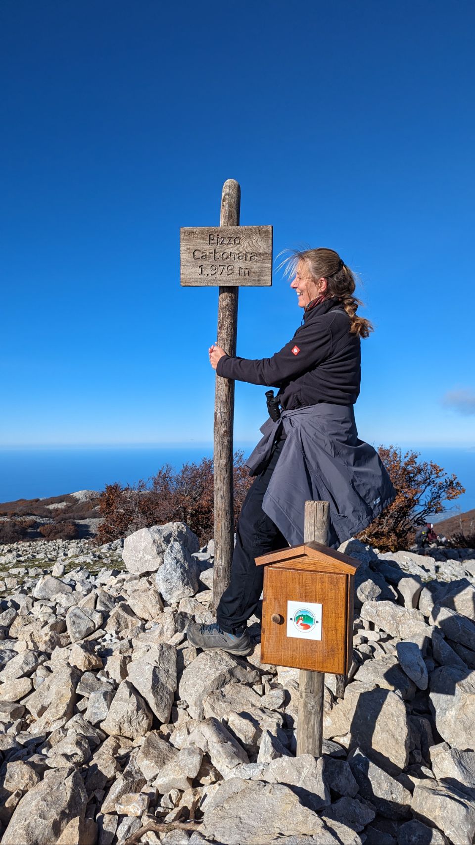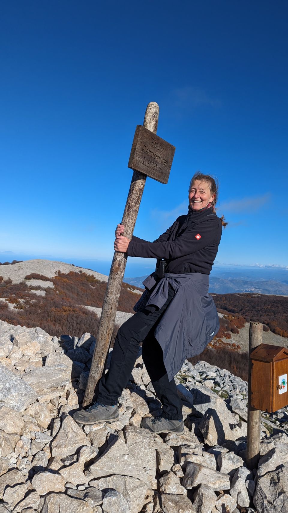 Geschafft! Wir haben den Gipfel des Pizzo Carbonara erreicht. Eine ziemlich anstrengende (besonders für mich, Coco), aber sehr schöne Wanderung über Stock und Stein. Besonders toll sind die Farben der Bäume, zumal wir bisher von Herbststimmung eher nichts mitbekommen haben 🍂🍃. Den passenden Herbstwind gibt es auch und je höher wir kommen, auch richtig frostige Temperaturen 🥶.