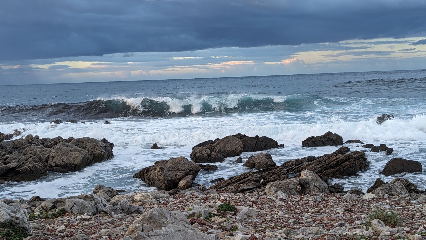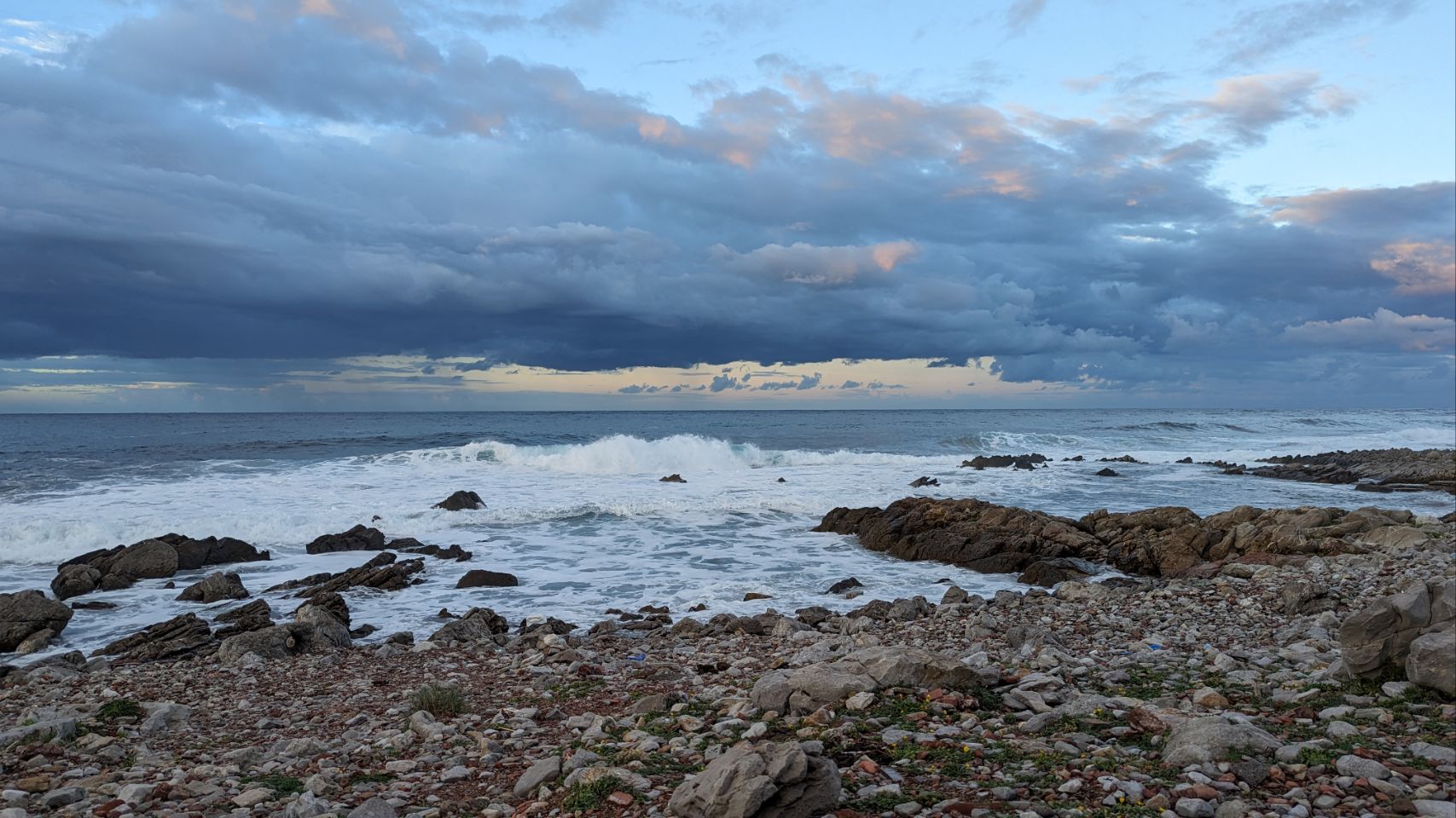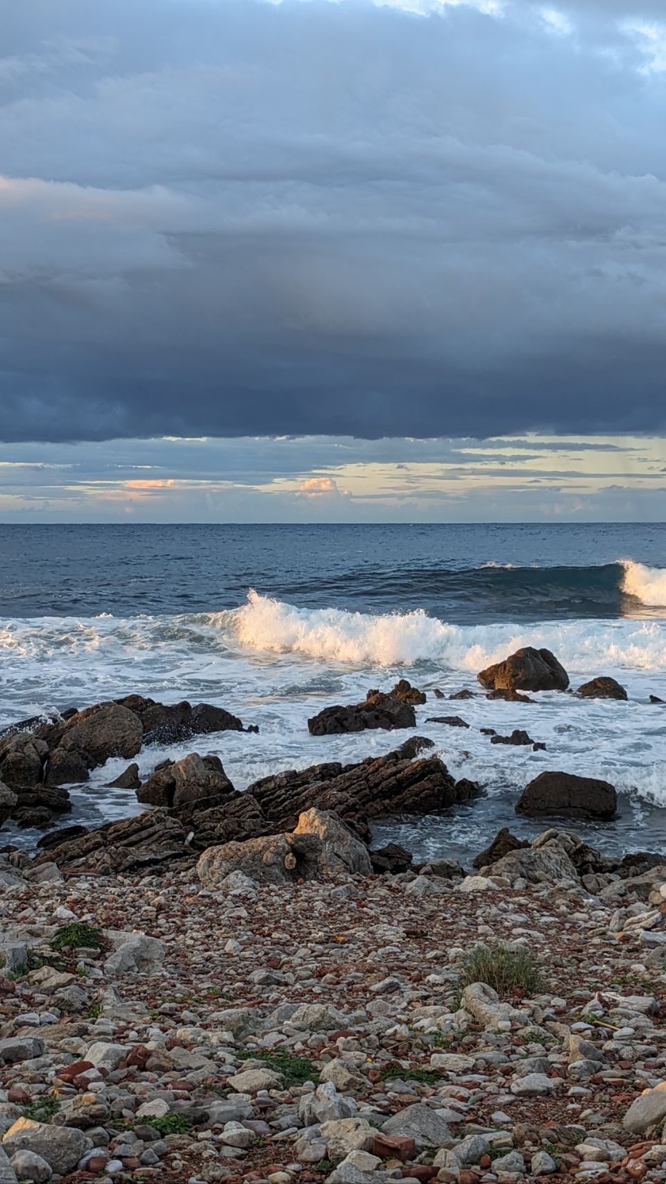 Der Sturm kommt näher, es regnet, wird windiger. Heute bleiben wir noch hier (und machen ganz viele Wellen- und Wetterfotos – das Pixel muss ja ordentlich getestet werden 😉), morgen soll es richtig heftig werden, dann verziehen wir uns irgendwo hin, wo es windgeschützt ist.