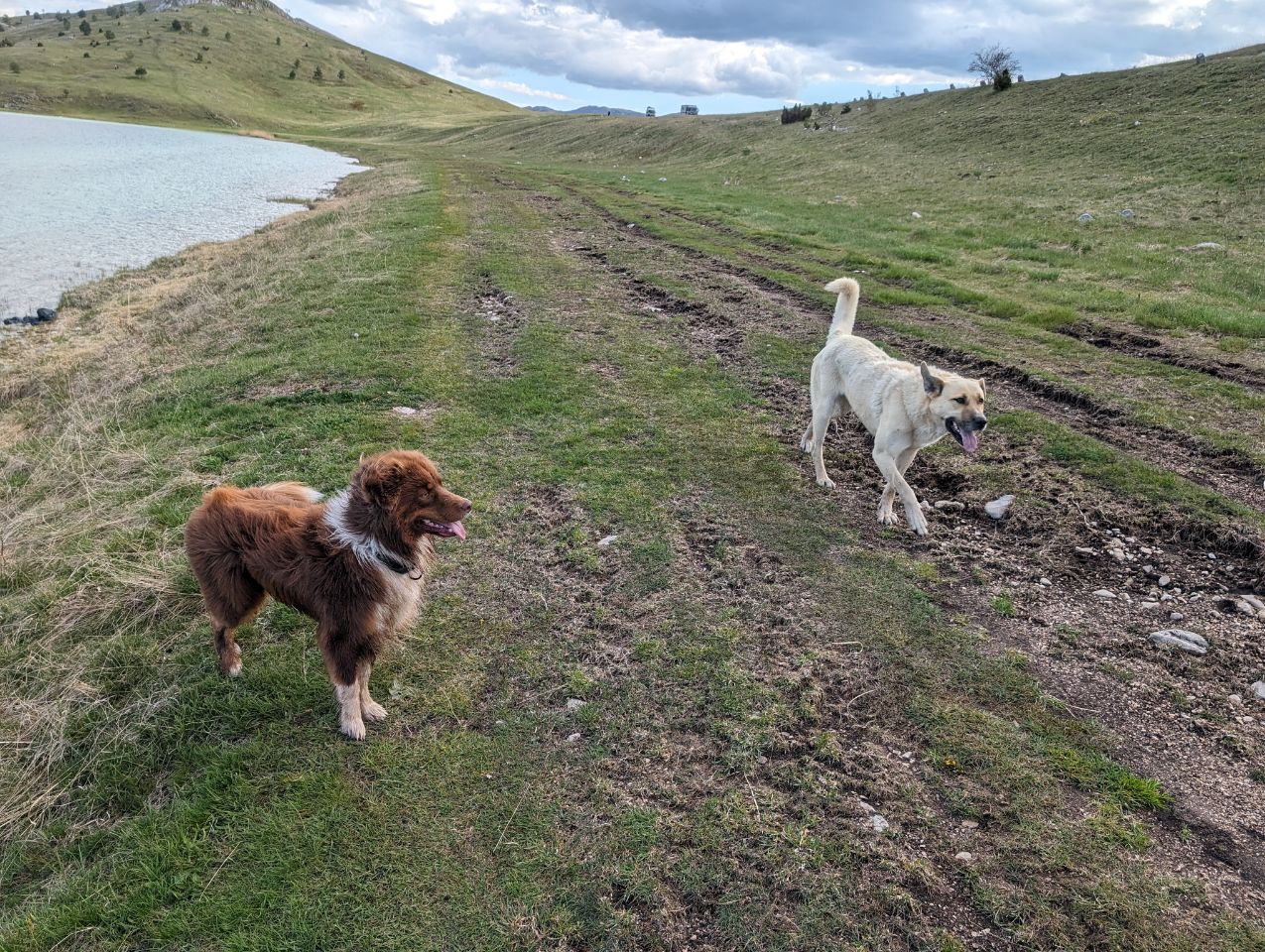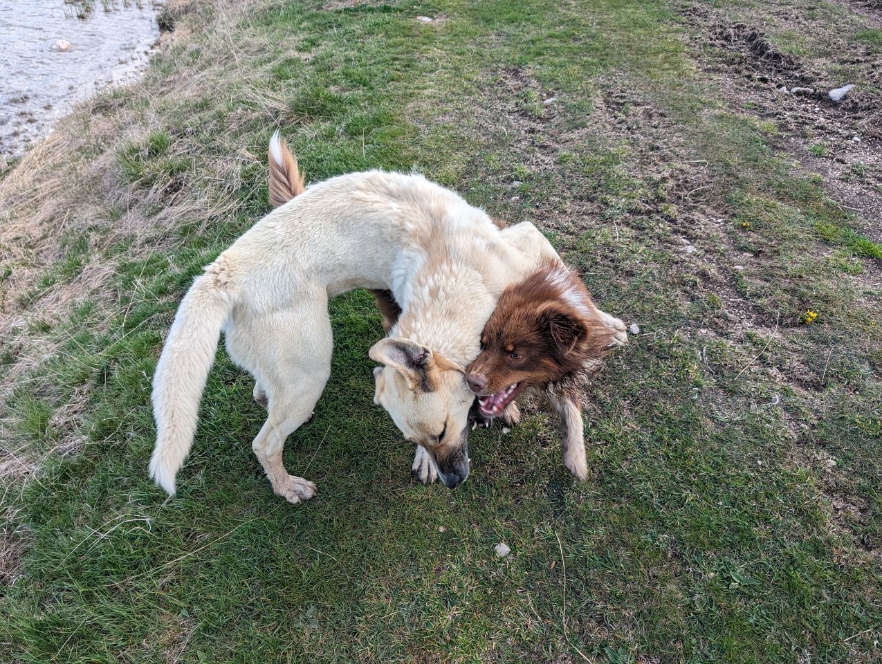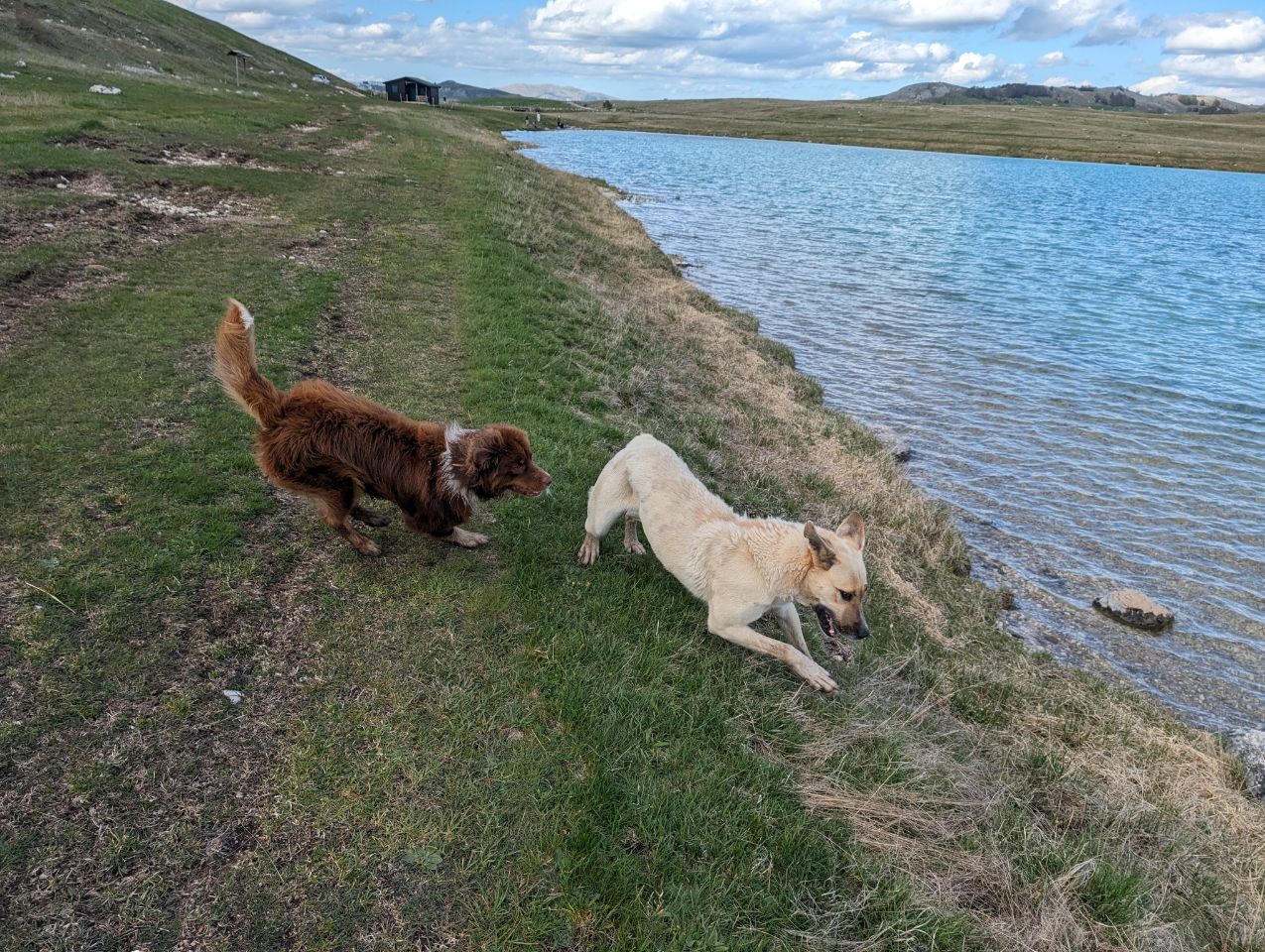 Ich genieße die Sonne am See ☀️📖 und Cuba findet eine neue Freundin (die scheint hier zu leben – wahrscheinlich freilebend), die uns dann auch bei der Nachmittagsrunde um den See begleitet 🐕🐕.
