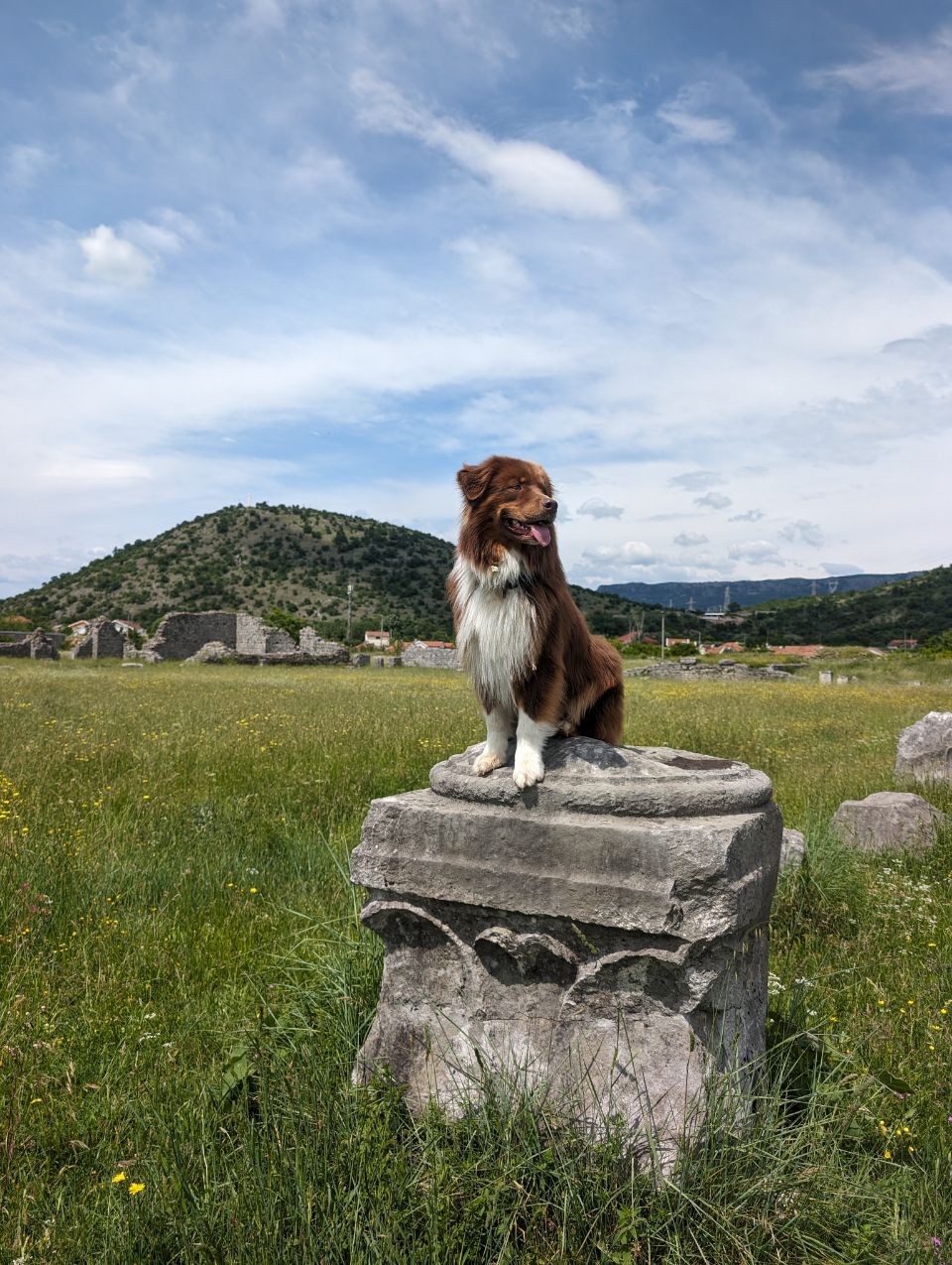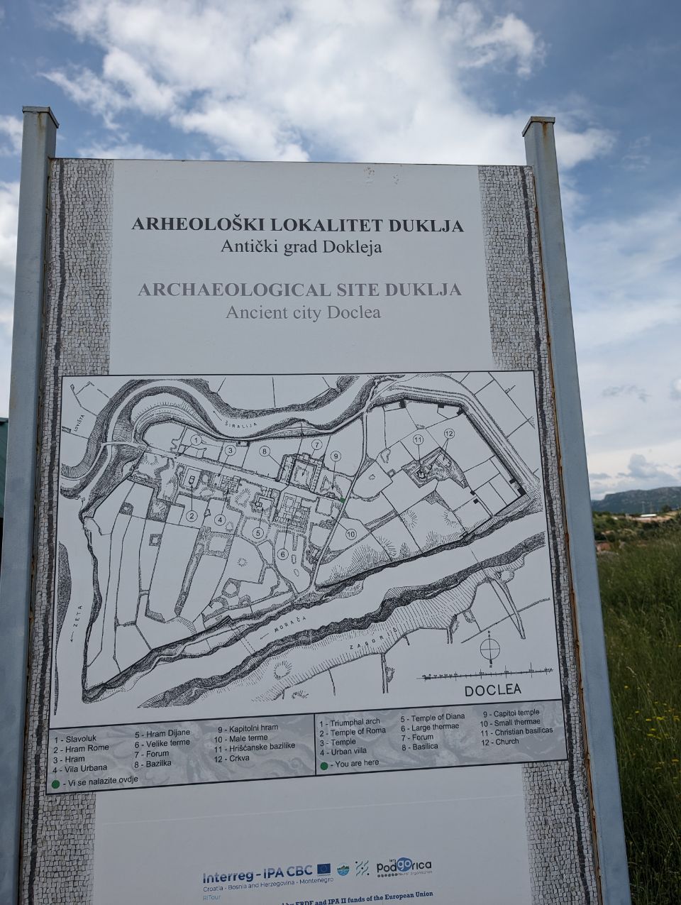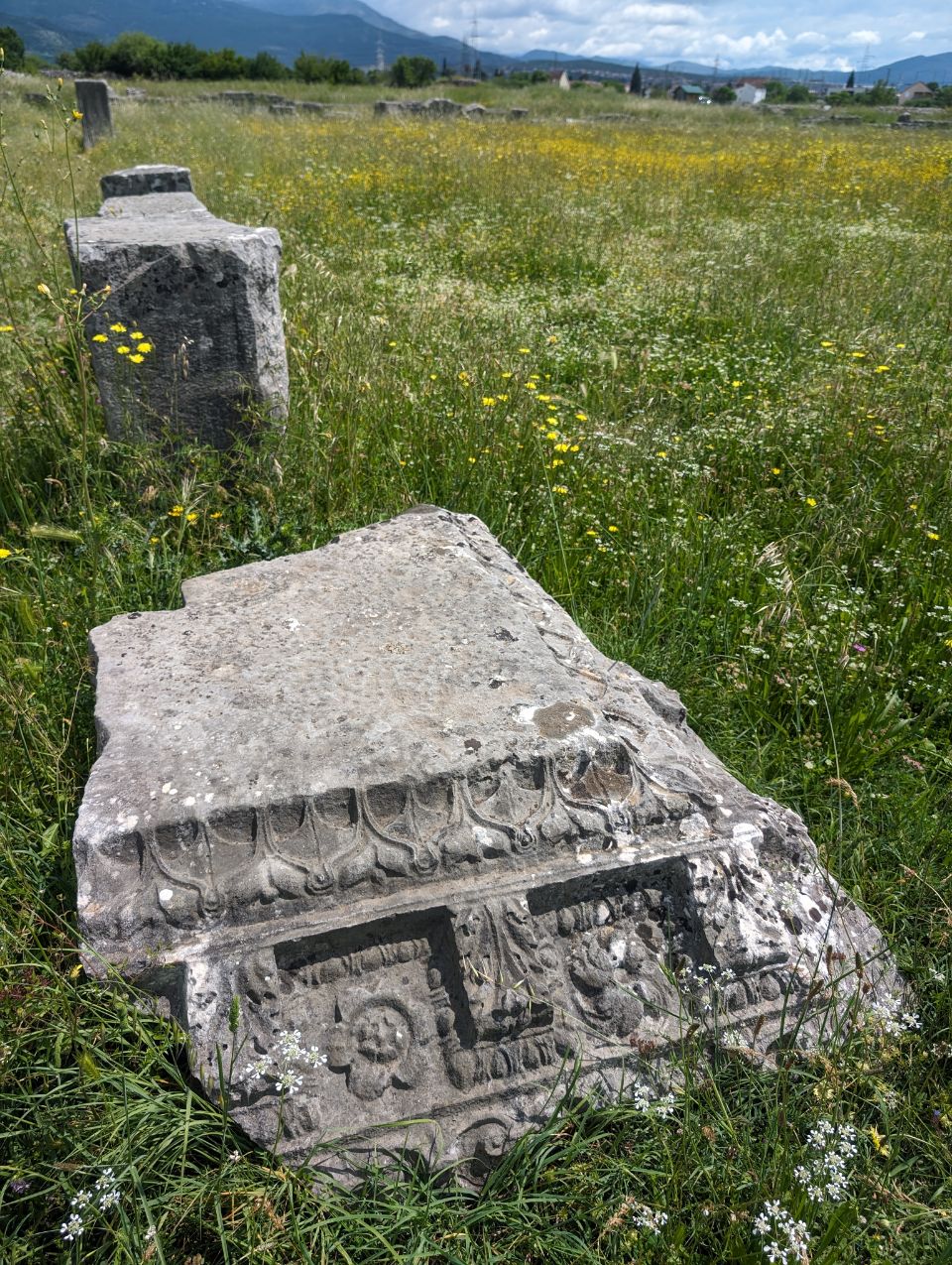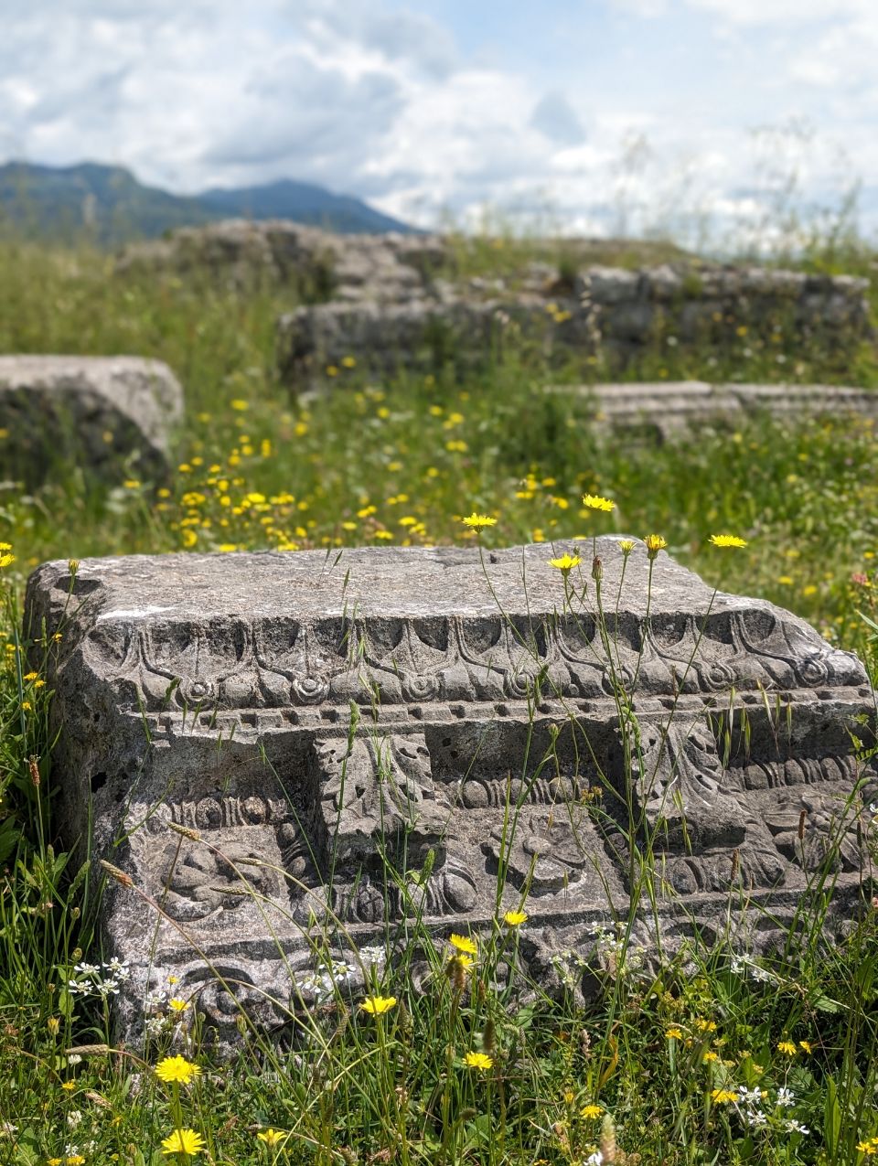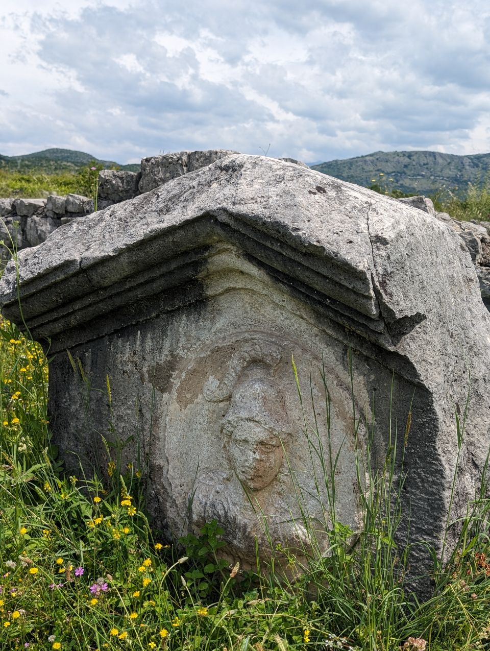 In der Tat eine aufgegebene Schönheit. Die Site ist eingezäunt und es gibt eine kleine verschlossene Ticketbude am Eingang, aber das Tor ist offen und die Natur arbeitet daran, die letzten Überreste von Doclea zu überwuchern🌱🪻🌿. Thom ist ja nicht so der Fan von alten Steinen, aber ich fand’s irgendwie stimmungsvoll. Besonders den steinernen „Löwen“ fand ich cool 😎…