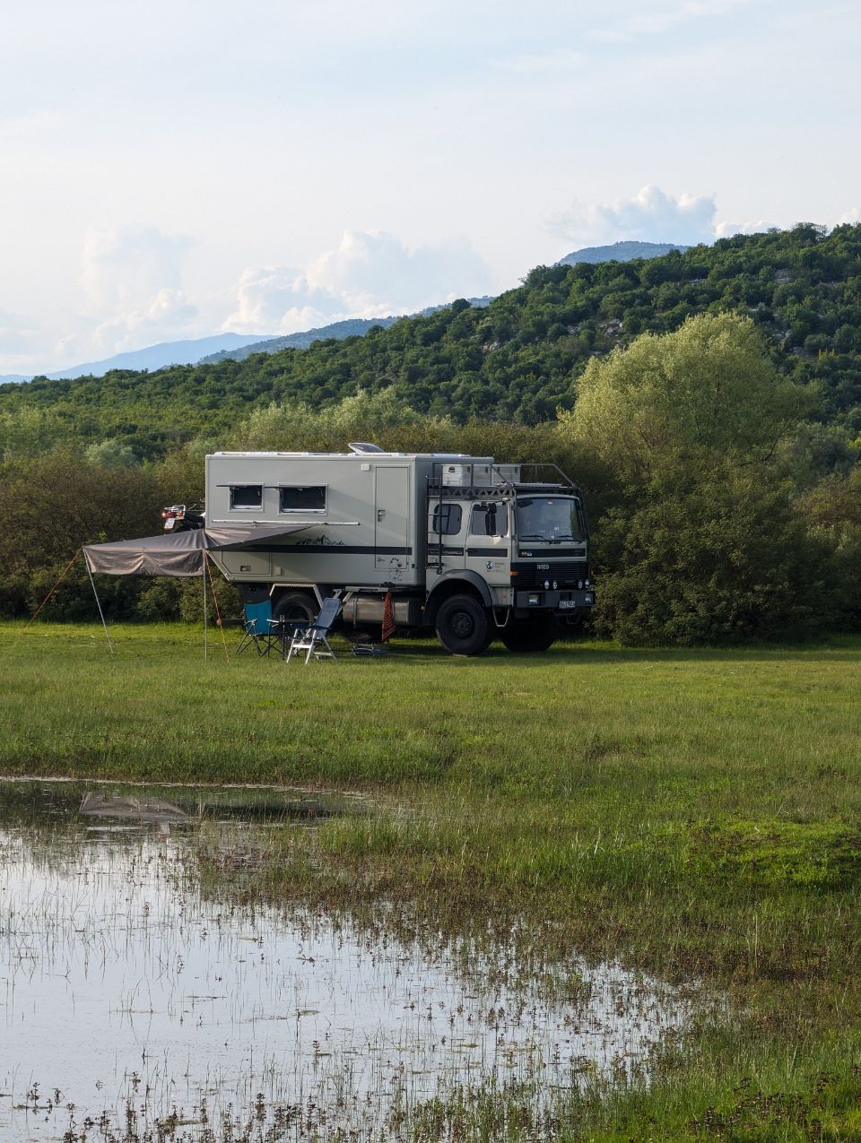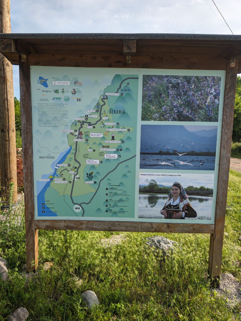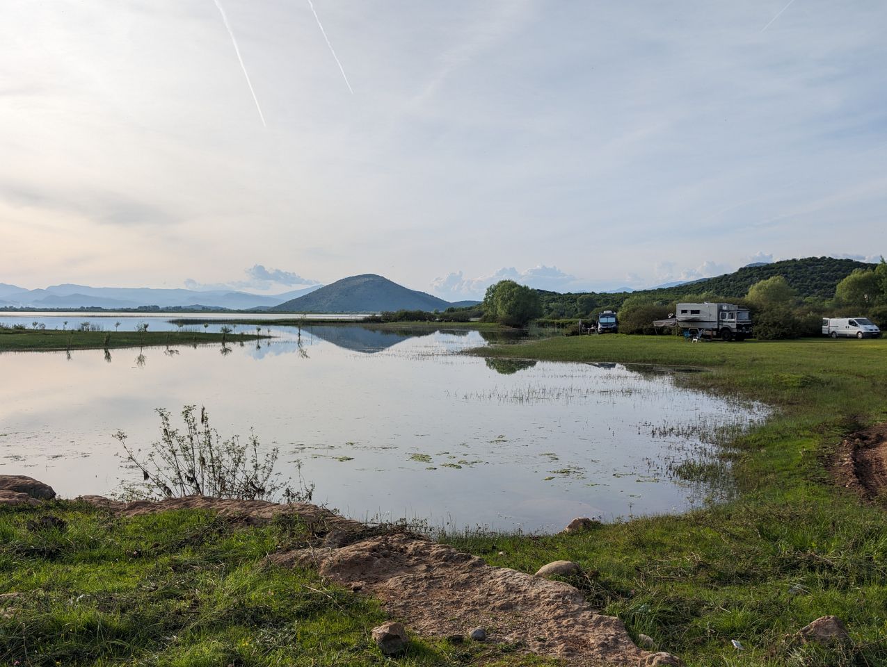 Zu unserem ersten Ziel in Albanien ist es gar nicht weit und so sitzen wir schon zum späten Frühstück an einem wunderschönen Spot direkt am Skutarisee. Das Gebiet nennt sich bzw. gehört zum Naturschutzgebiet Lake Shkodar und hier gibt es sehr viele Vögel und offensichtlich auch Frösche (siehe unten).