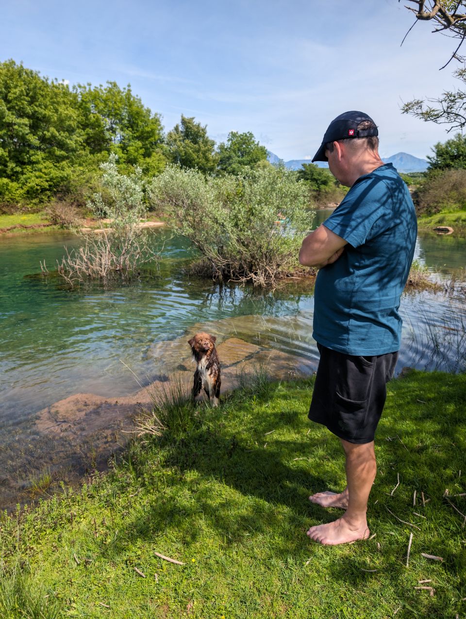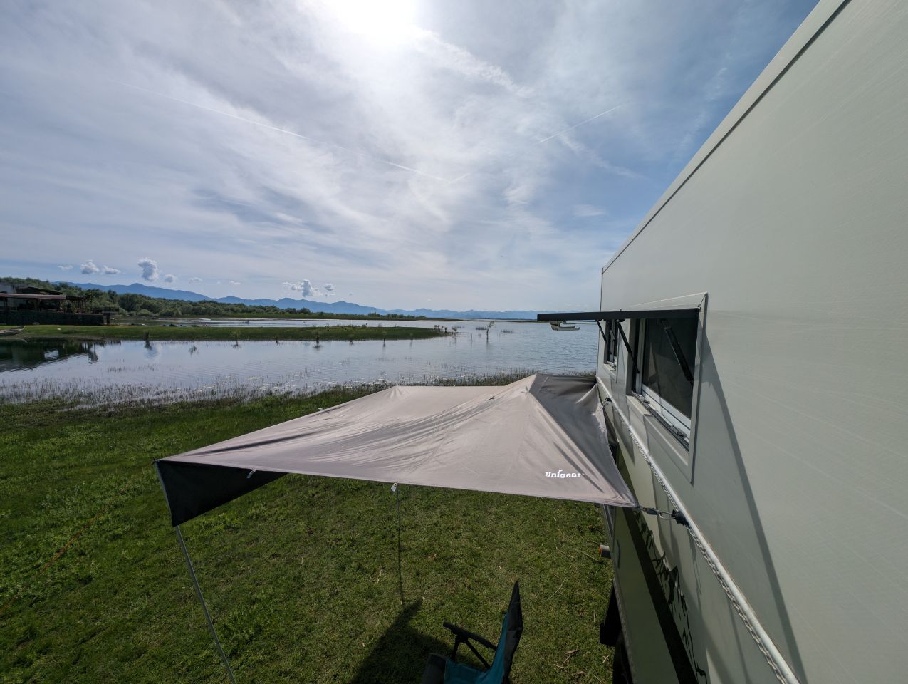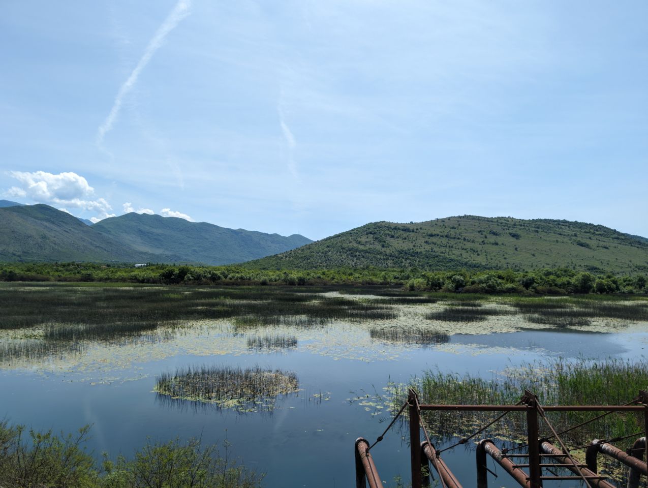Zu unserem ersten Ziel in Albanien ist es gar nicht weit und so sitzen wir schon zum späten Frühstück an einem wunderschönen Spot direkt am Skutarisee. Das Gebiet nennt sich bzw. gehört zum Naturschutzgebiet Lake Shkodar und hier gibt es sehr viele Vögel und offensichtlich auch Frösche (siehe unten).