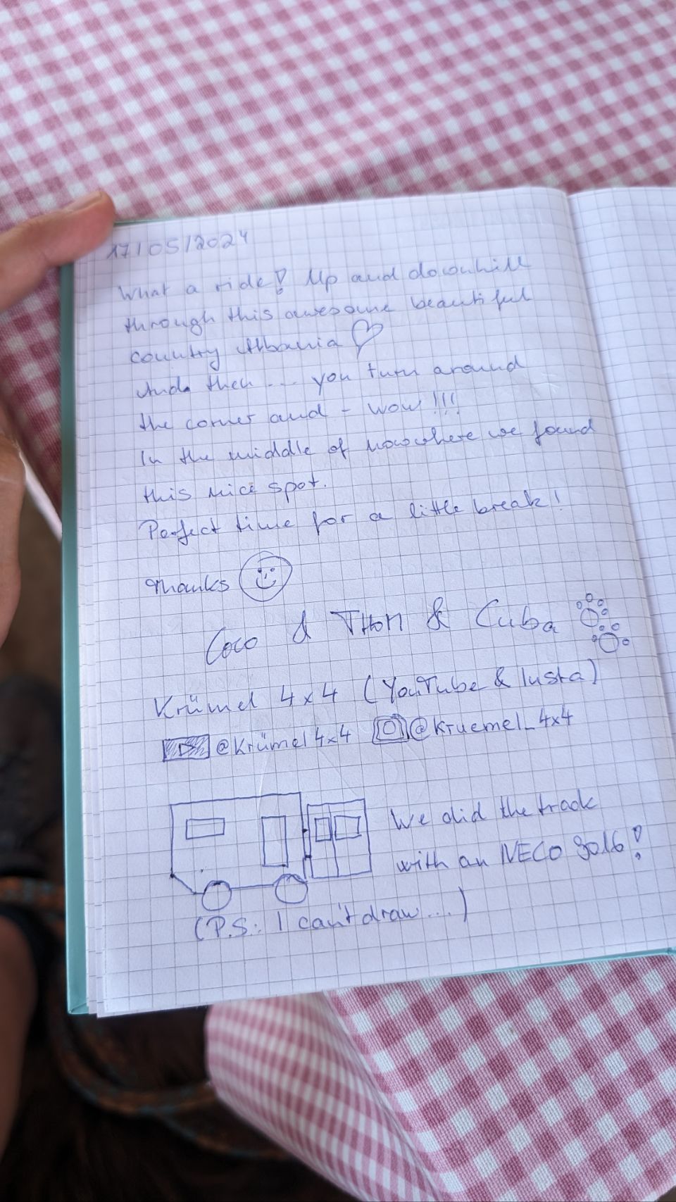 Wie alle Durchreisenden vor uns (und das sind tatsächlich mehr als man erwartet) wird auch uns stolz das Gästebuch präsentiert – zusammen mit der Aufklebersammlung eine beeindruckende Dokumentation einer multinationalen Gästeschar 😎!