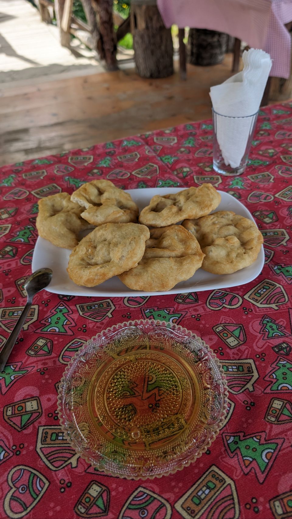 Die Zeit für einen Gipfelsnack nehmen wir uns natürlich gerne, die Dame serviert uns frischen Saft und Krapfen mit Honig. Mega lecker 😋!!!