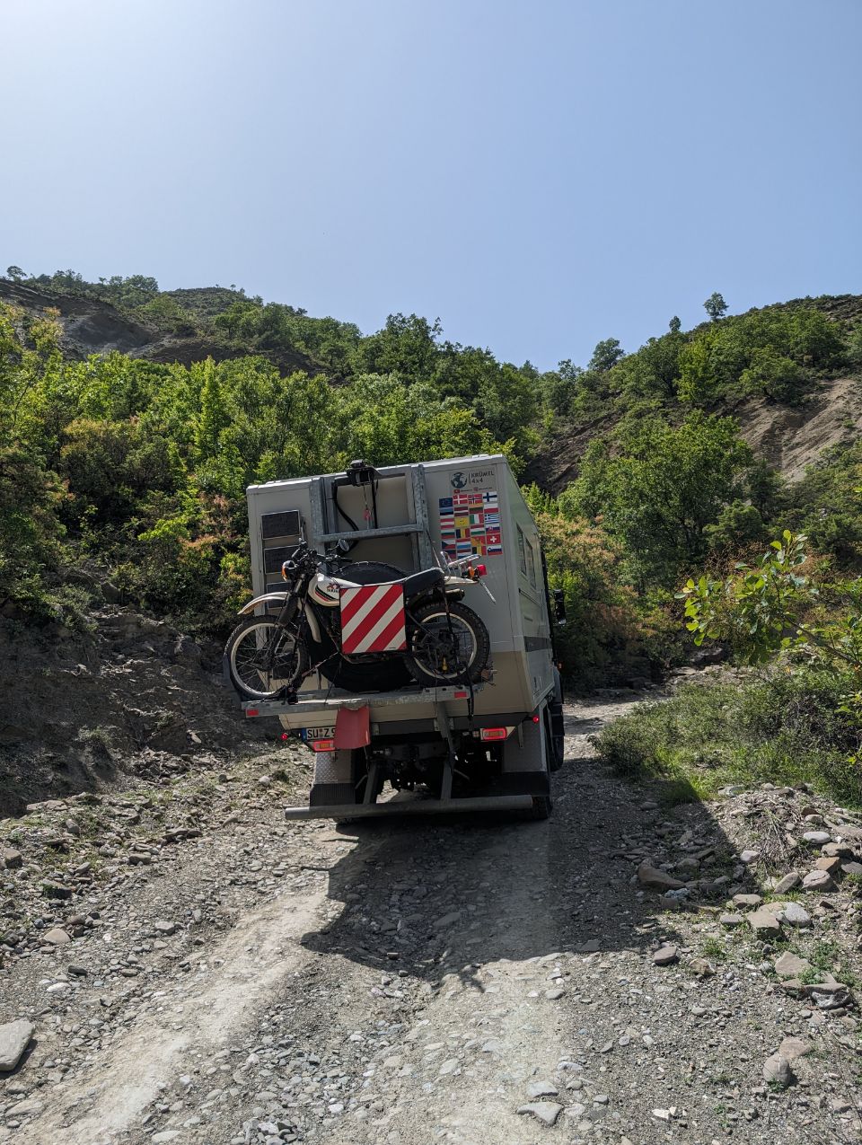 Die „Straße“ ist stellenweise ganz schön schmal oder mit kleinen seitlichen Abrutschen, links und rechts geht es manchmal schwindelerregend in die Tiefe – aber Krümel bleibt sicher auf Spur und ruckelt uns locker bis oben hin ⛰️.