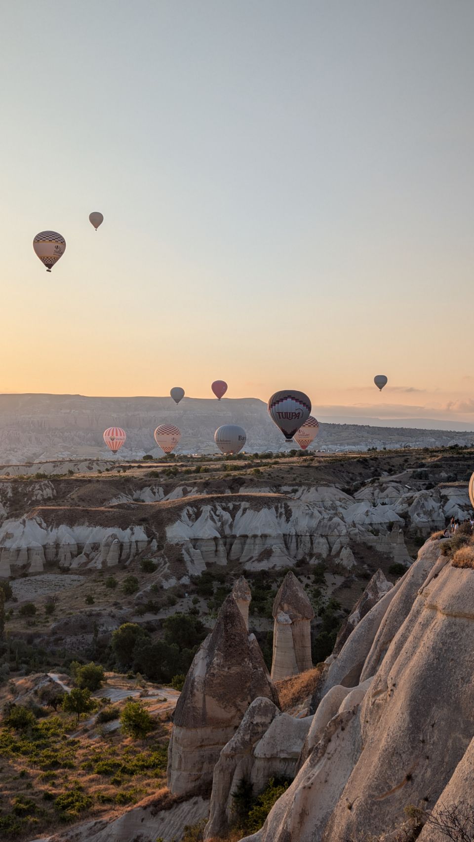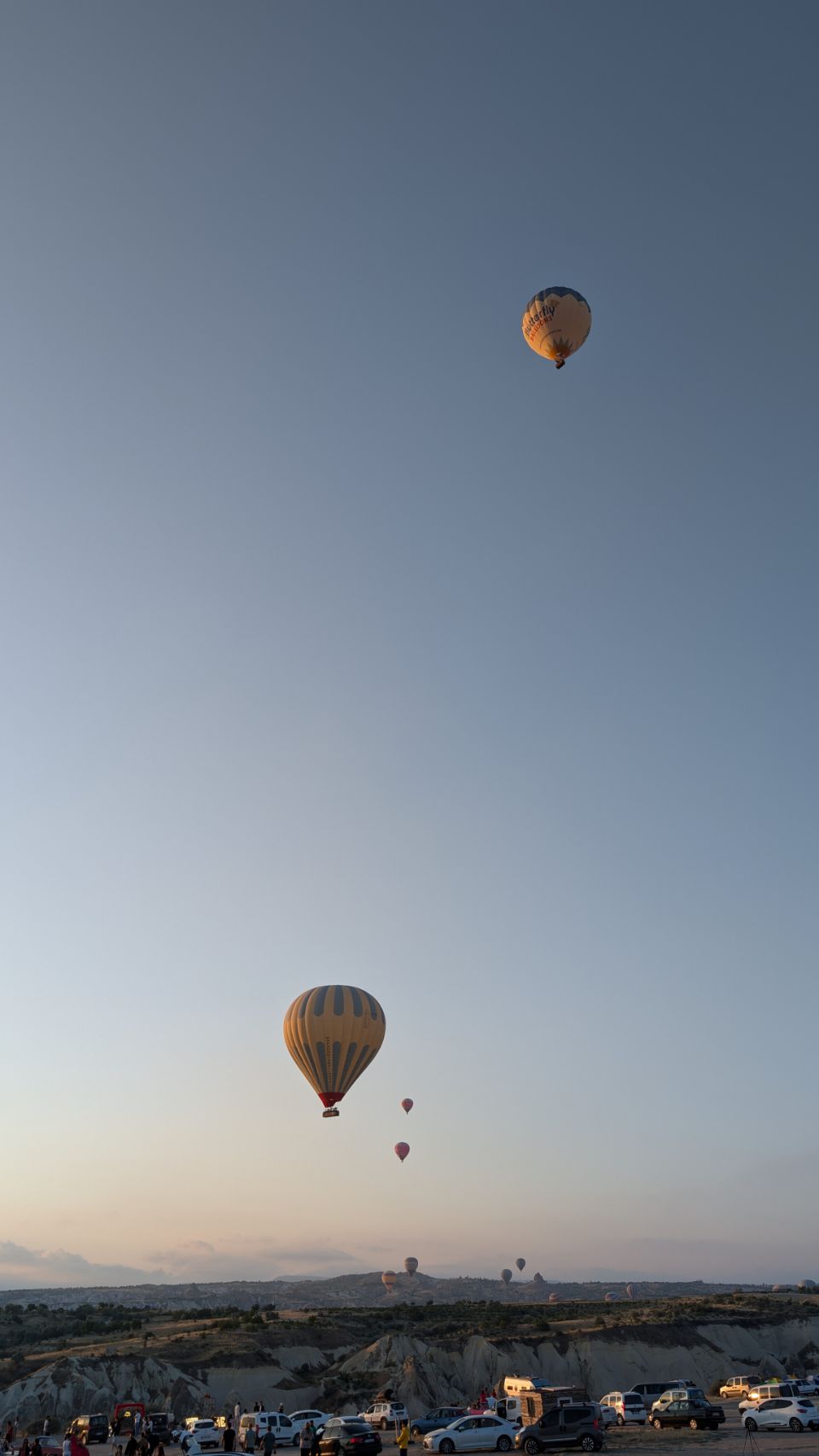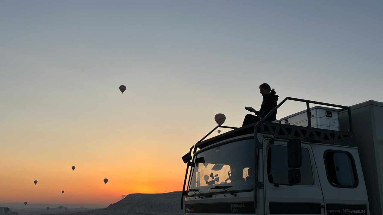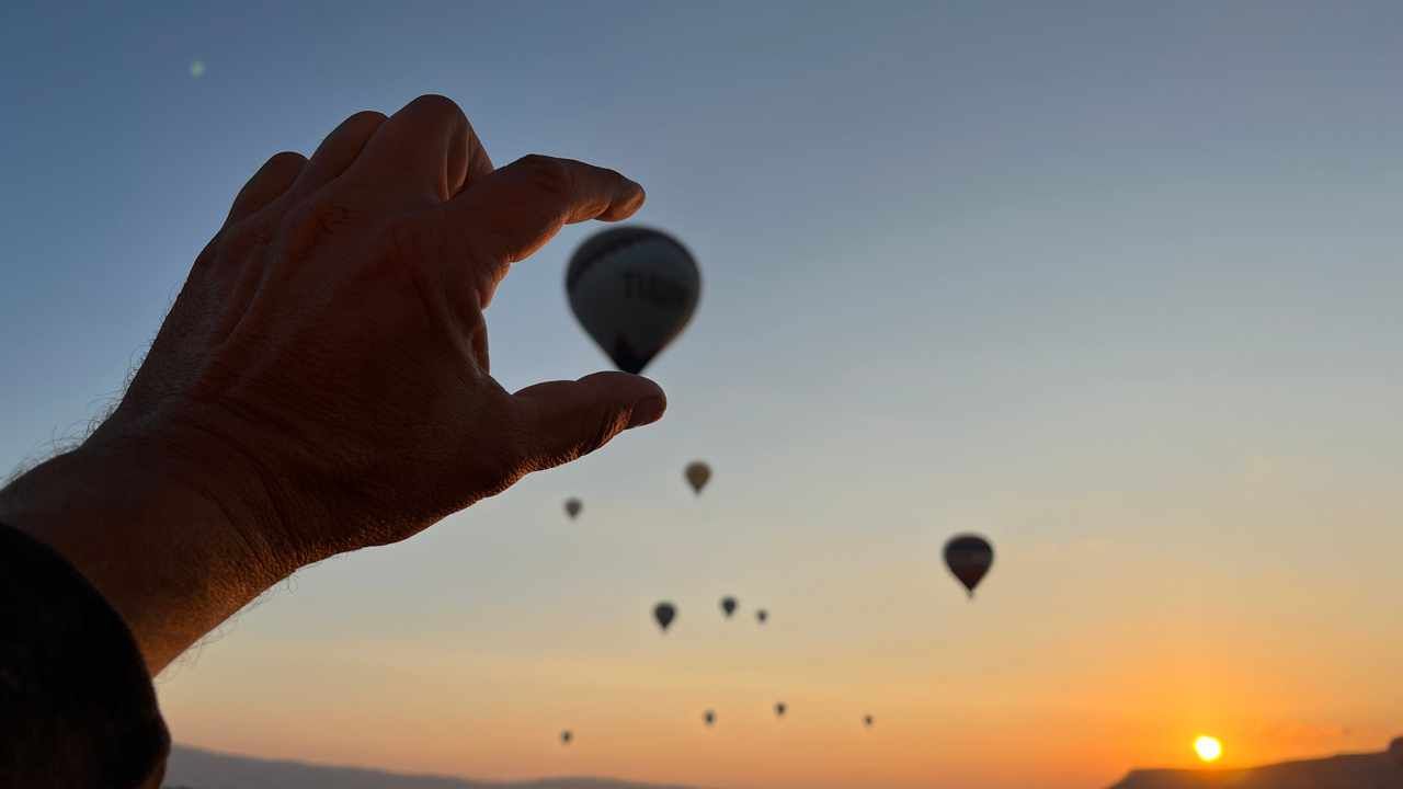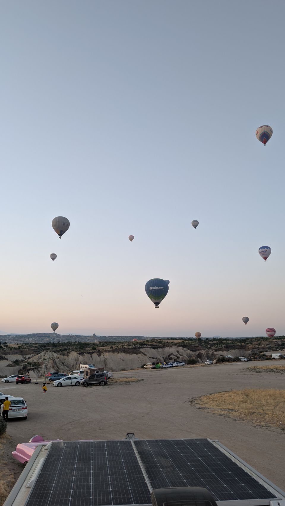 Und dann geht’s los! Wir sehen die ersten Ballons, die im Tal mit Heißluft gefüllt werden, man hört das typische „Fauchen “ der Brenner und dann steigen sie auf. Erst einzelne, dann werden es immer mehr – bis der ganze Himmel voller Ballons ist! Und die Sonne geht auch langsam auf 🌄…