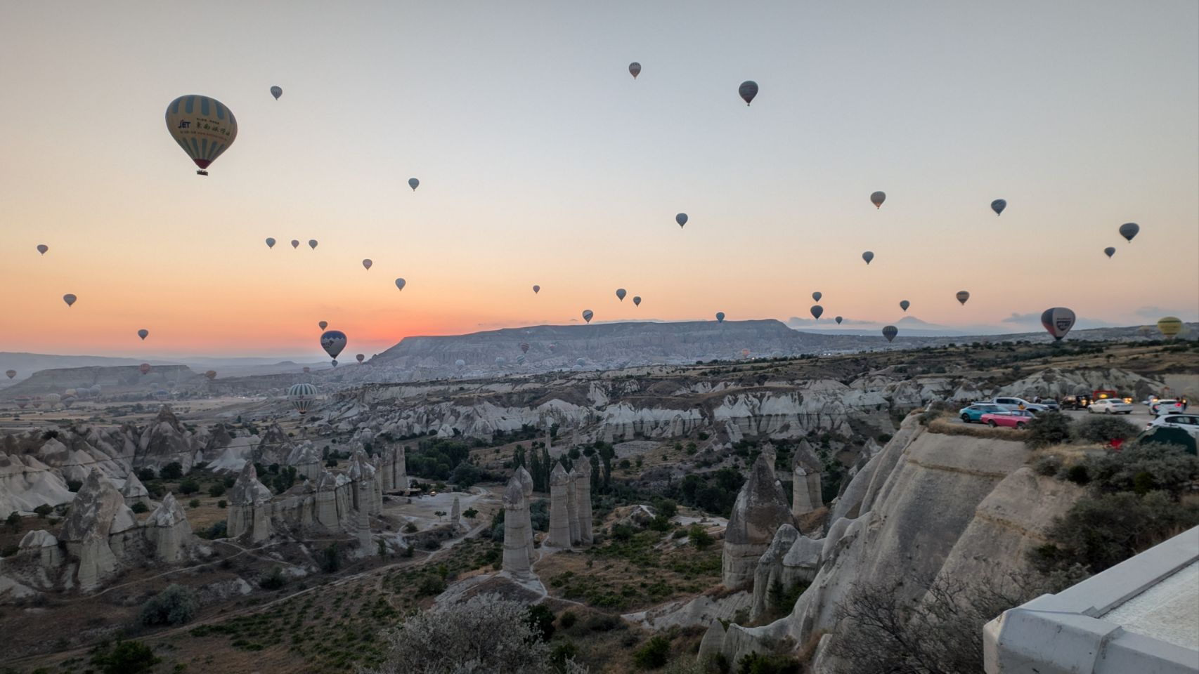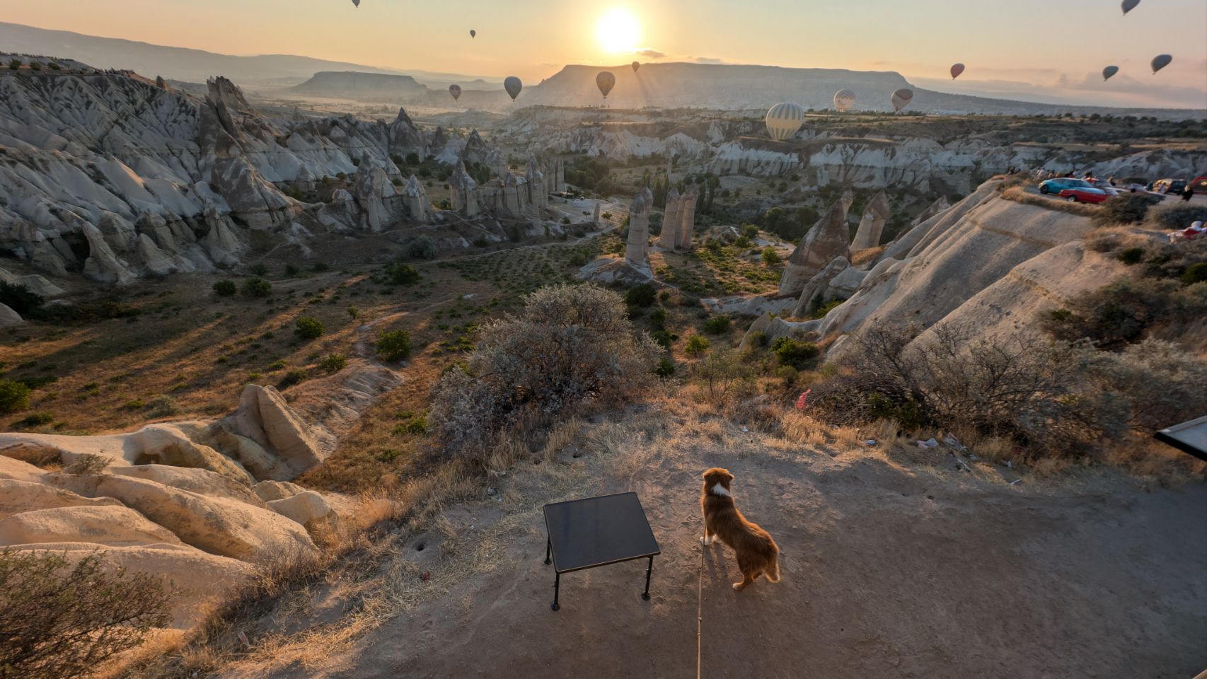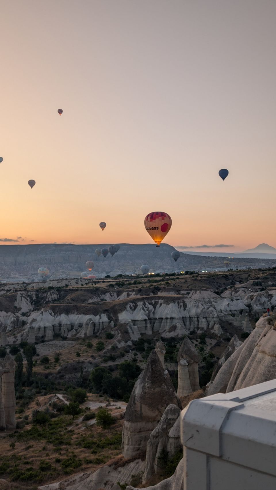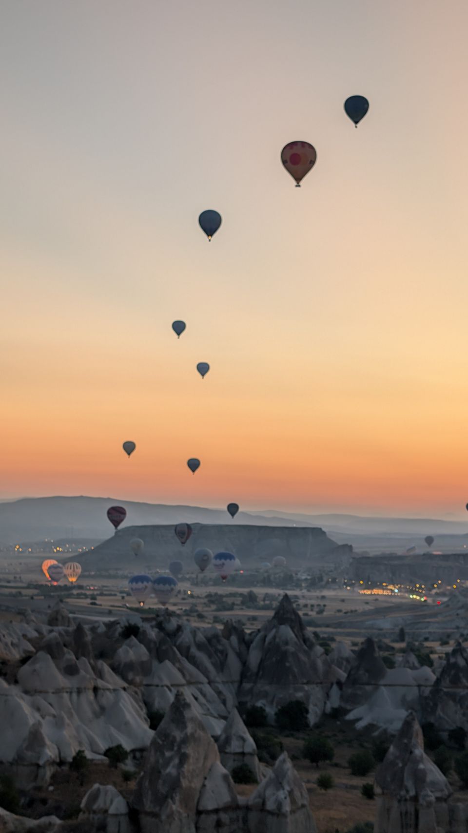Und dann geht’s los! Wir sehen die ersten Ballons, die im Tal mit Heißluft gefüllt werden, man hört das typische „Fauchen “ der Brenner und dann steigen sie auf. Erst einzelne, dann werden es immer mehr – bis der ganze Himmel voller Ballons ist! Und die Sonne geht auch langsam auf 🌄…