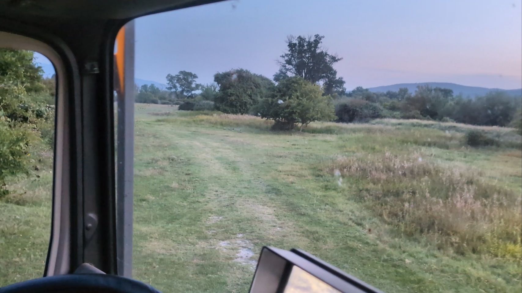 Wir starten direkt durch in Richtung Norden und erreichen knapp nach Sonnenuntergang den ersten Nachtplatz der gemeinsamen Tour. Gar nicht so schlecht für nur einen Overnight Stay und auch gar nicht so trivial zu erreichen… Im letzten Tageslicht geht es über eine ziemlich steile und steinige Rampe in Richtung Wiese am Fluss.