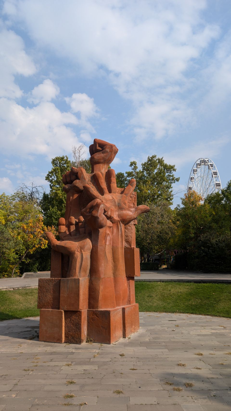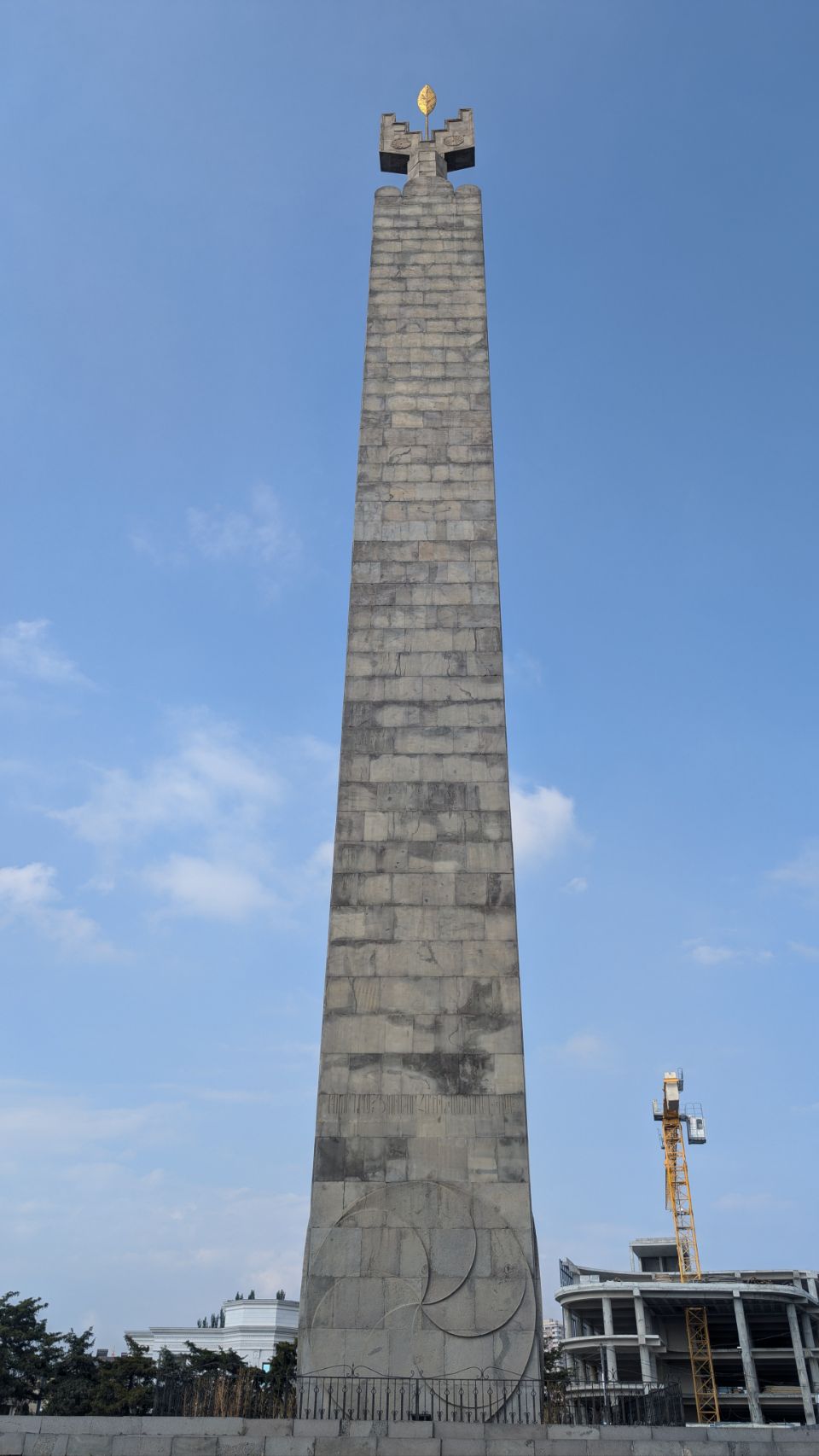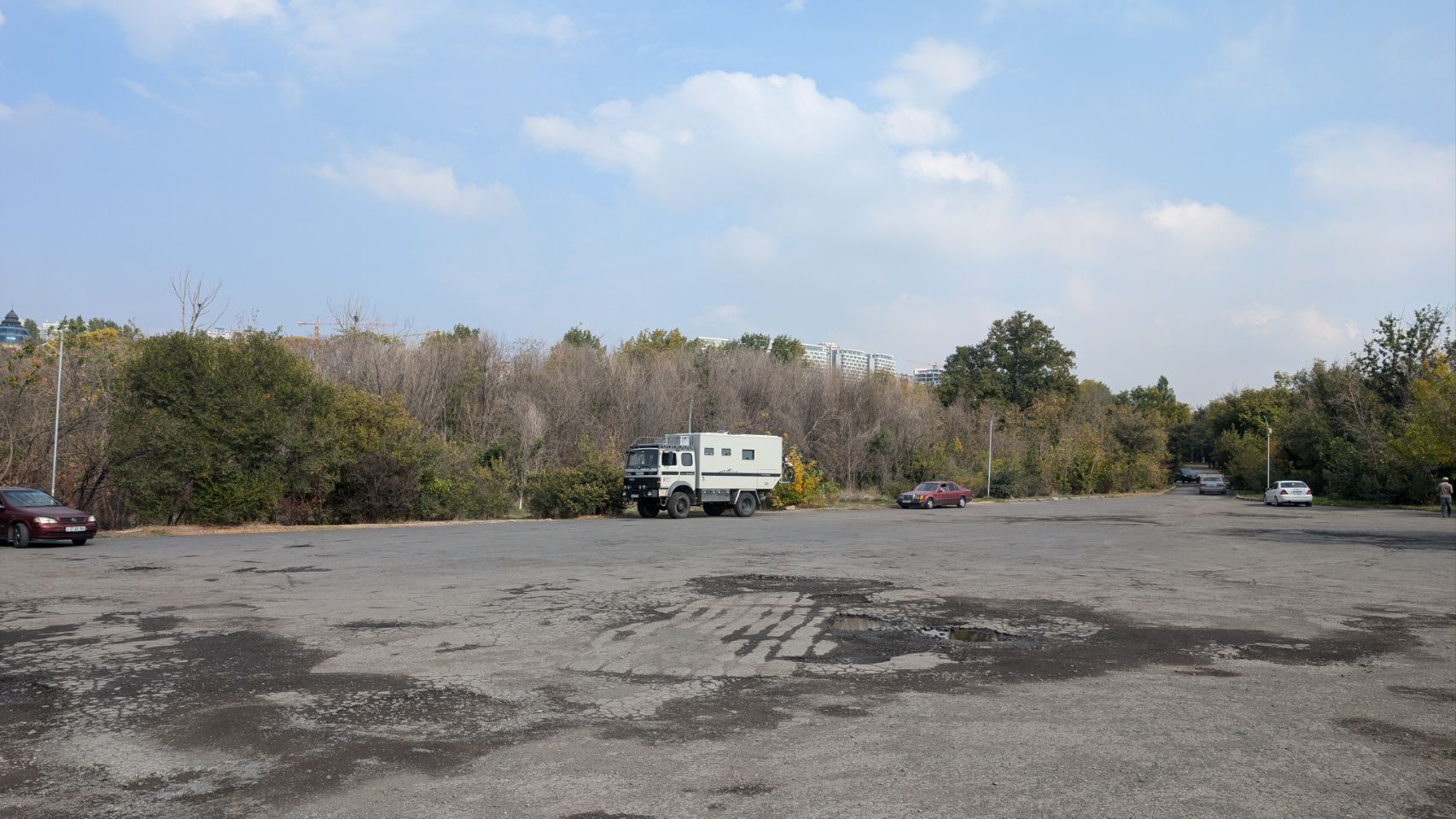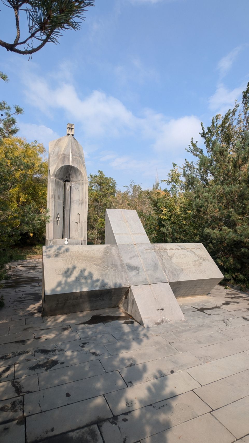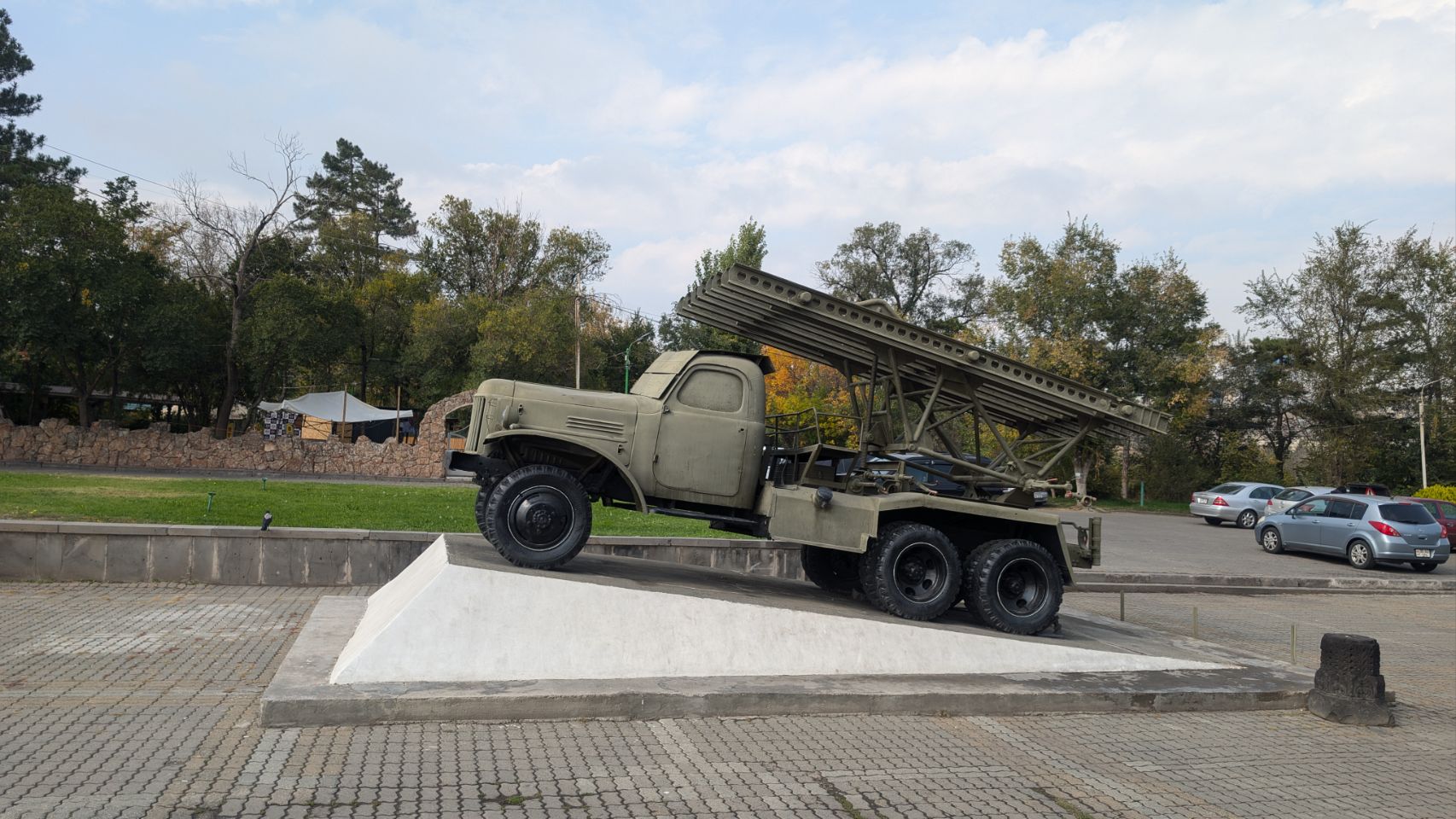 Als Overlander hat man die Möglichkeit, auf einem großen Schotterparkplatz an der Zufahrt zum Denkmal zu übernachten. Von hier aus gehen wir dann zu Fuß, vorbei am etwas vernachlässigt wirkenden Monument of the 50th Birthday of the October Revolution und über den Cascade Complex (dazu siehe nächster Step) runter in die Stadt.