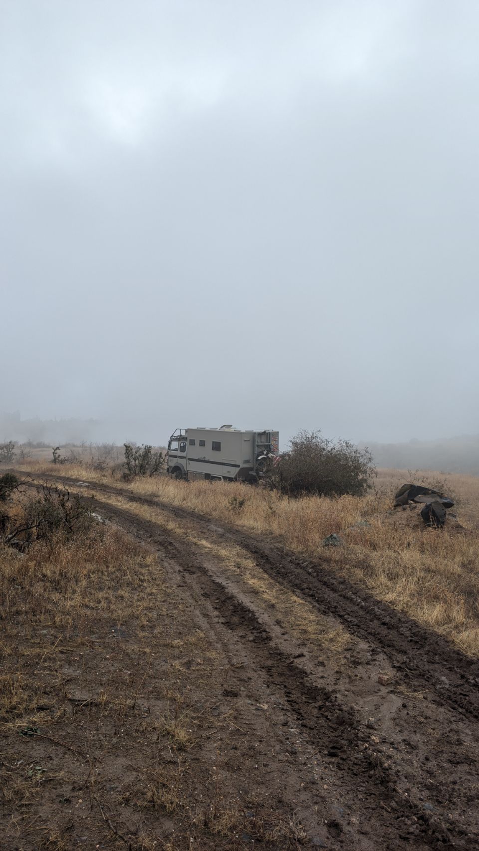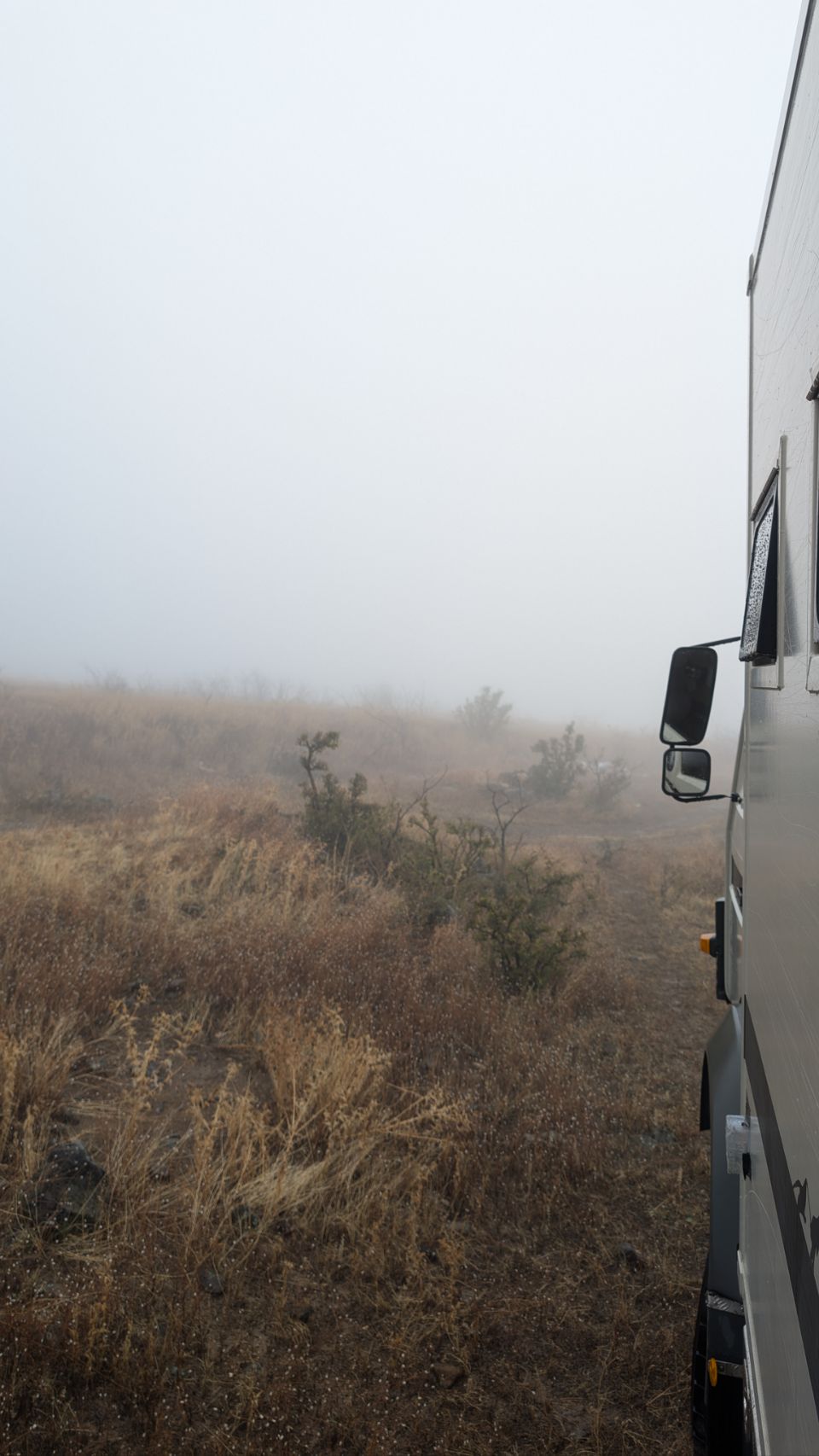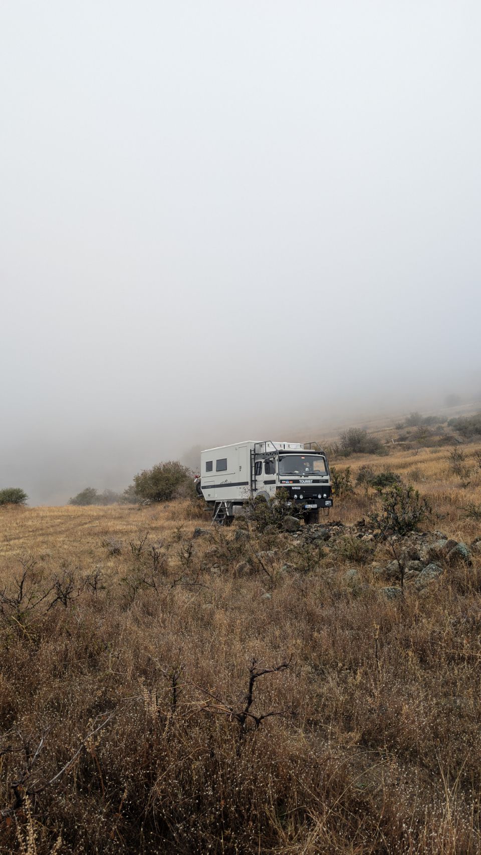 Irgendwie kommen wir aber heil unten an und schreiben kurz an die Tippgeber, dass wir den Platz gefunden haben und in welchem Zustand er gerade ist. Kommt die Antwort zurück: „Wir stehen selber noch da, wo seid ihr denn???“ Die beiden stehen mit ihrem Robur keine 100 m entfernt – so dick ist die Suppe, dass wir sie und sie uns nicht sehen konnten 😆.