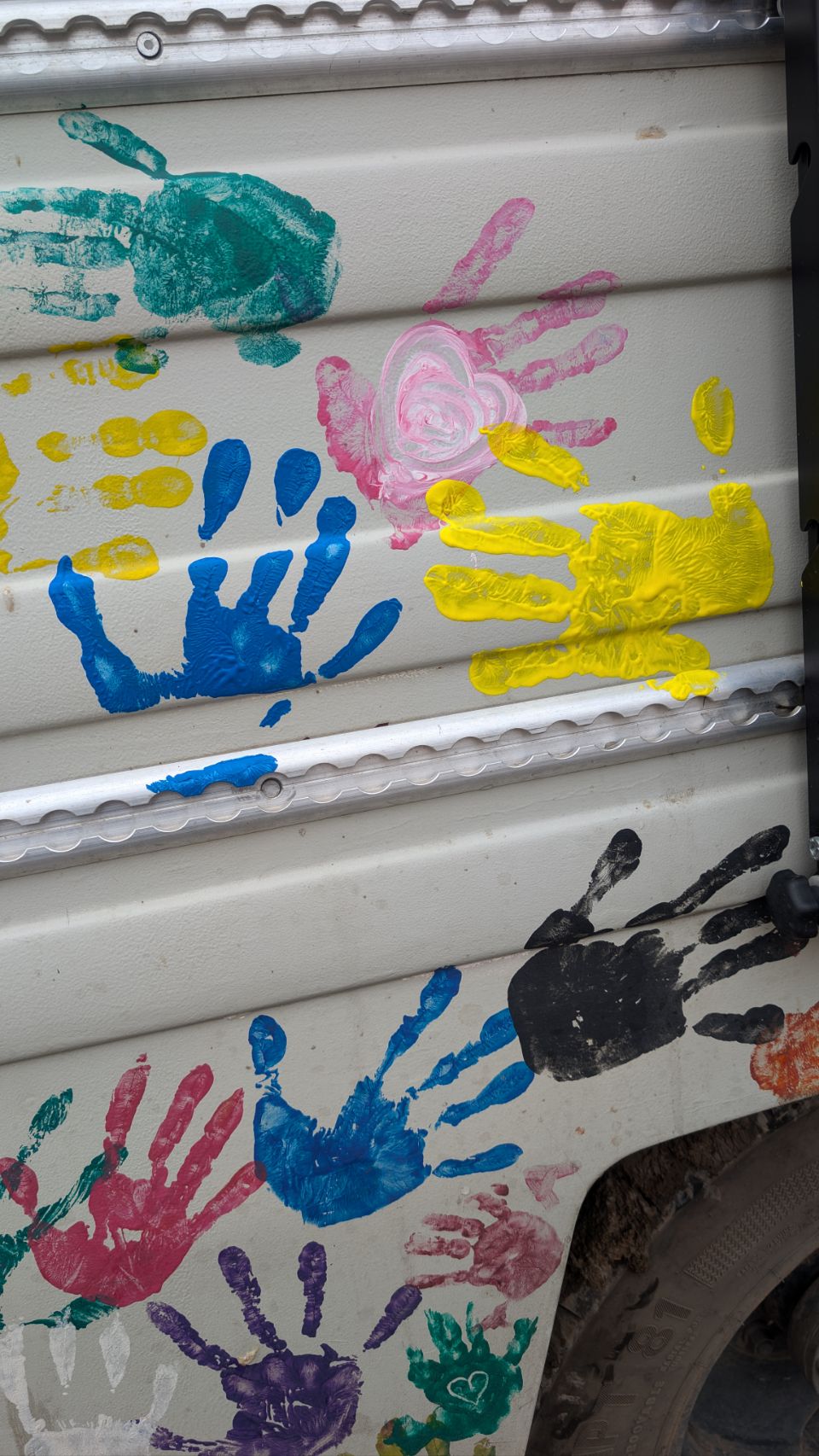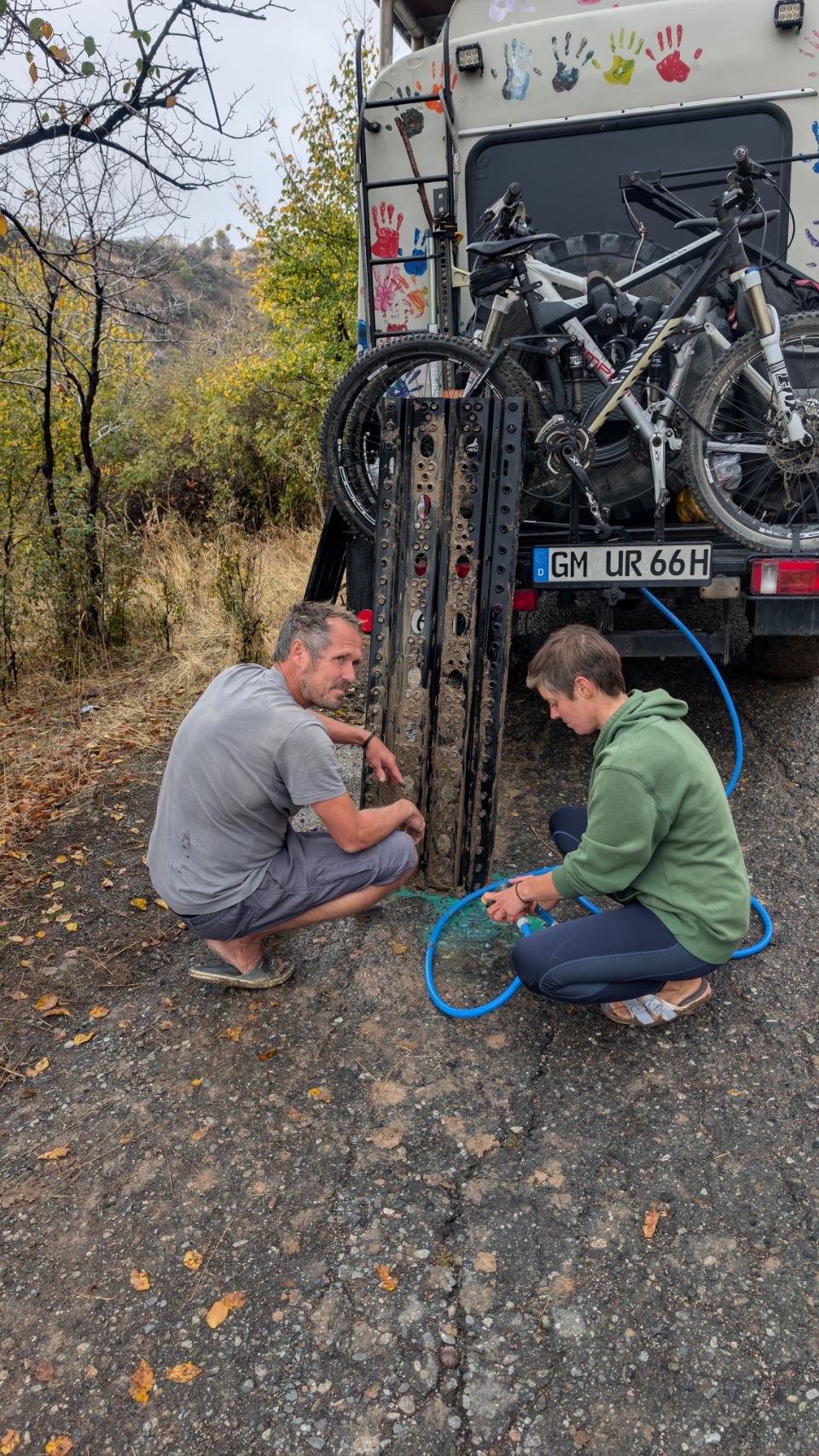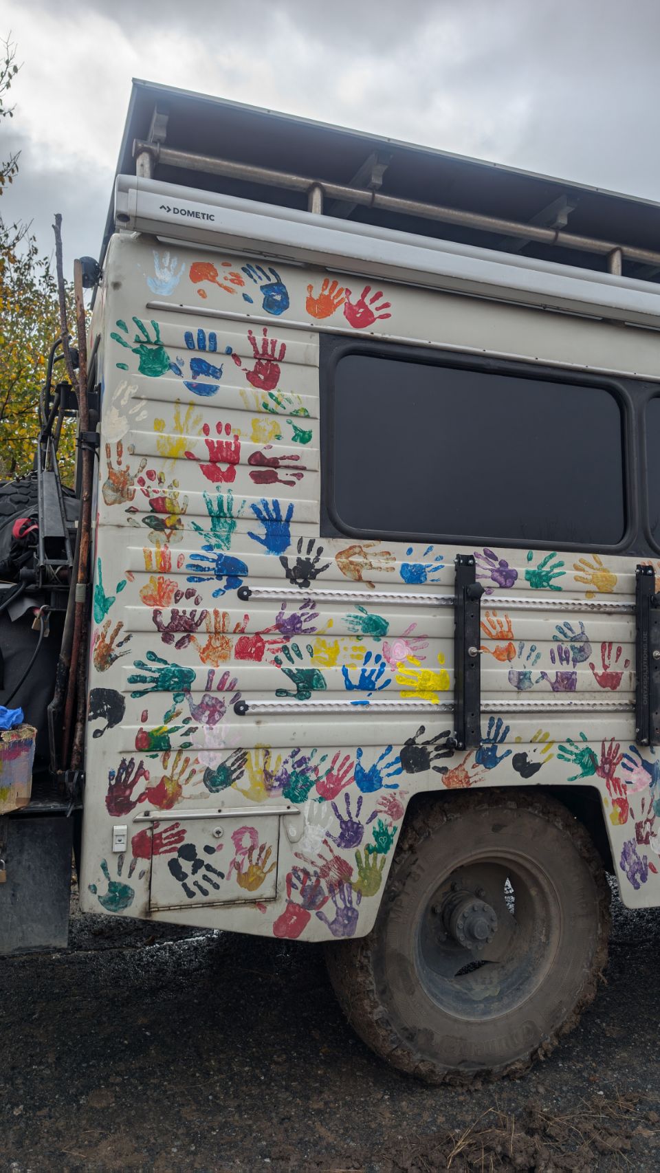 Letztlich haben sie aber festen Boden unter den Füßen und dann müssen „nur noch“ die Sandbleche wieder entmatscht werden. Genug Zeit, damit wir – unter der strengen Aufsicht von Mr. Linguini 🐶 – noch unsere Handabdrücke auf dem Robur verewigen können 🙌🏻! Das Reisemotto der beiden lautet nämlich „Hände verbinden“ 🥰.