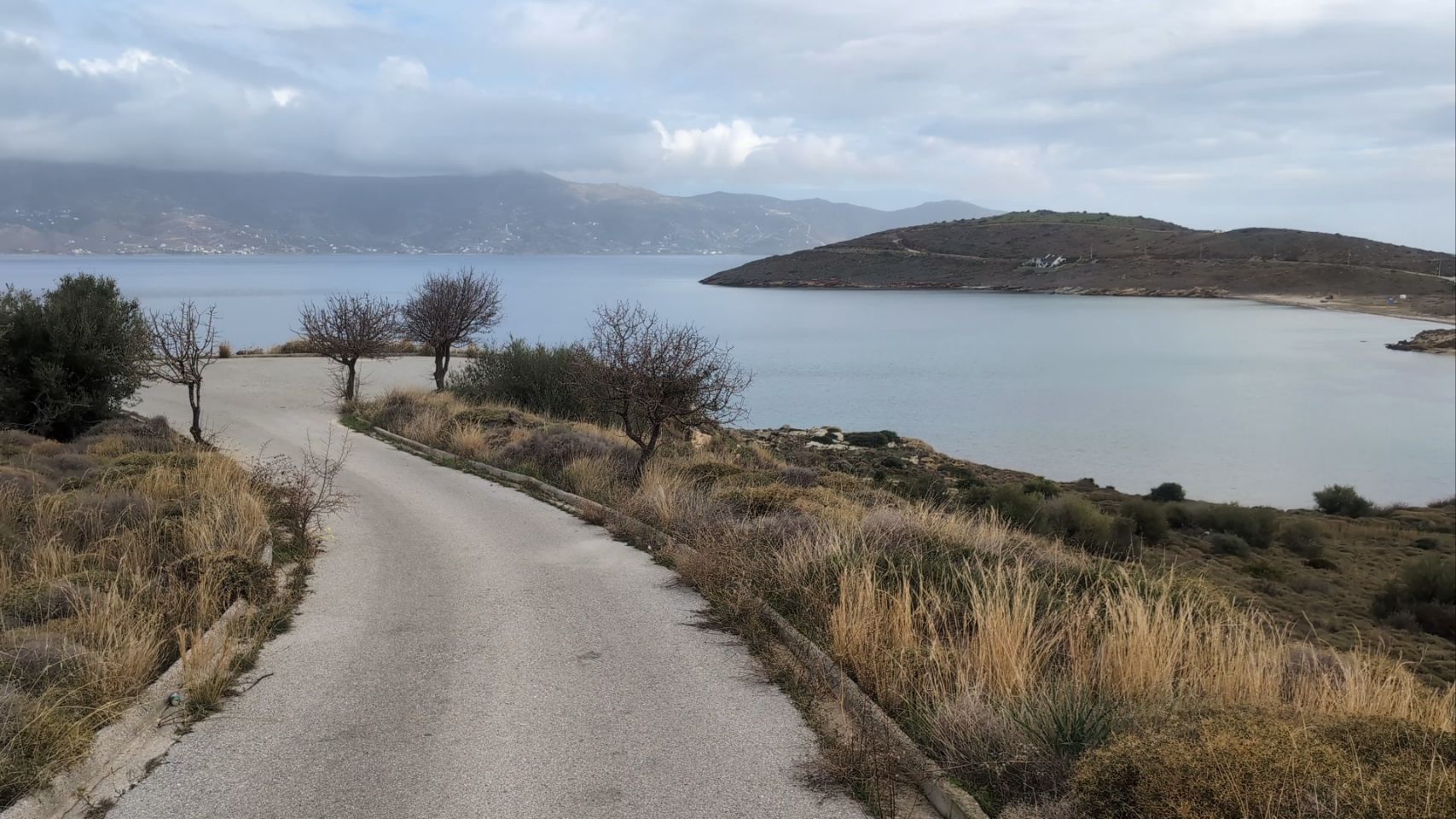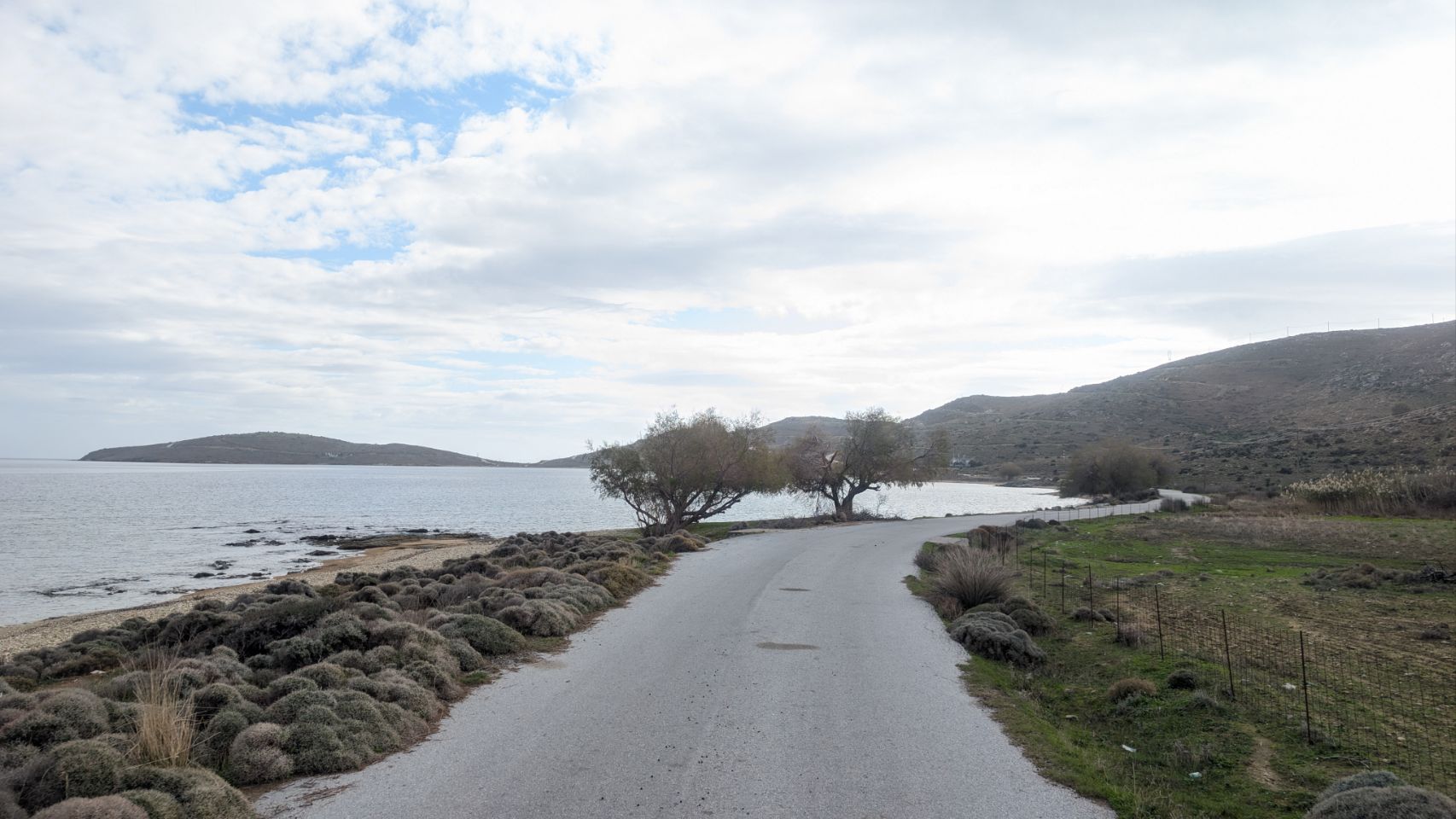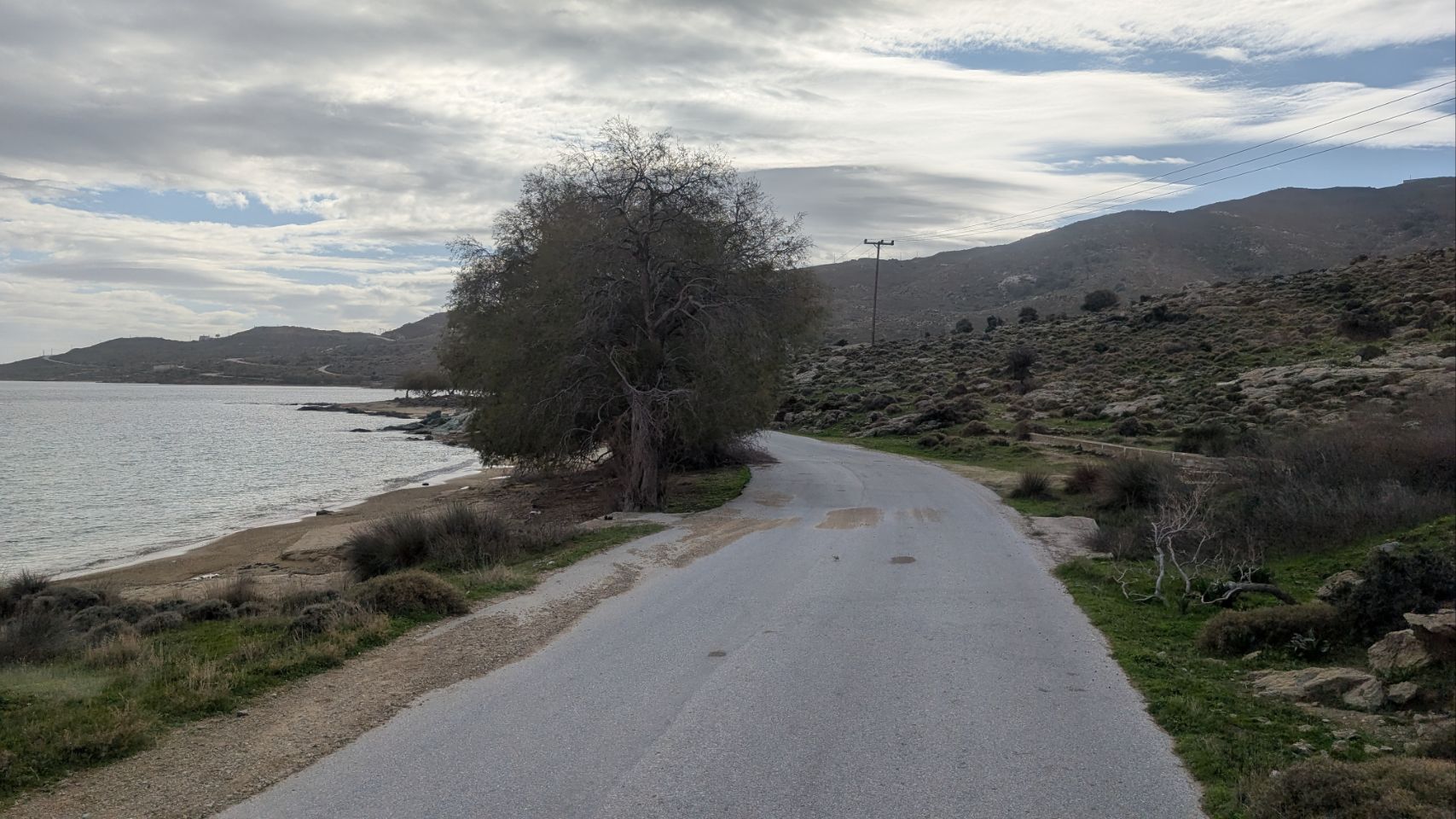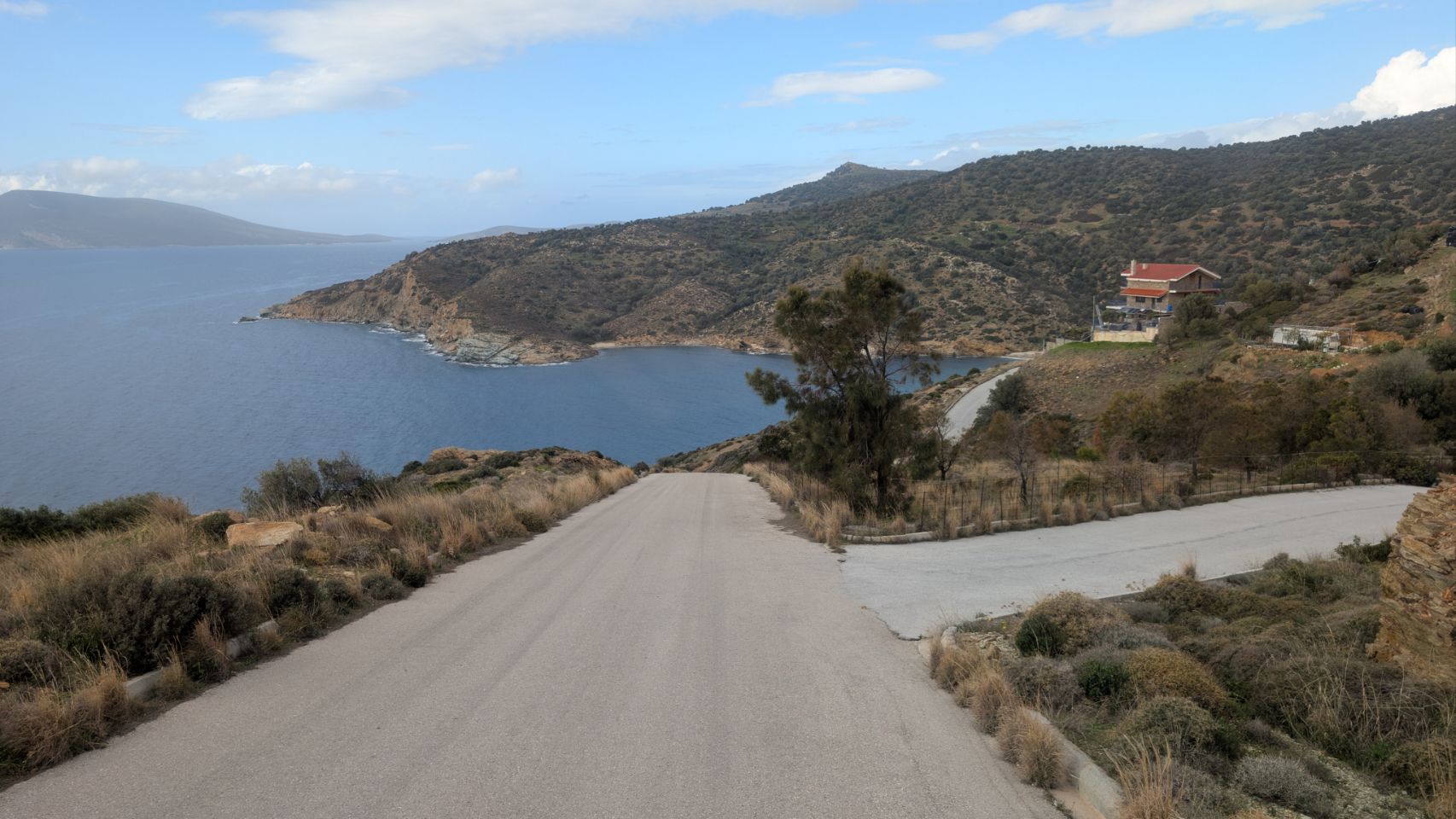 Von Agios Dimitrios sind es nochmal knapp 60 km bis zur Südspitze, die Strecke führt hauptsächlich an der Küste lang. Nachdem wir den Schwerlast-Konvoi in Nea Styra losgeworden sind, geht es auch wieder ein bisschen flotter voran.