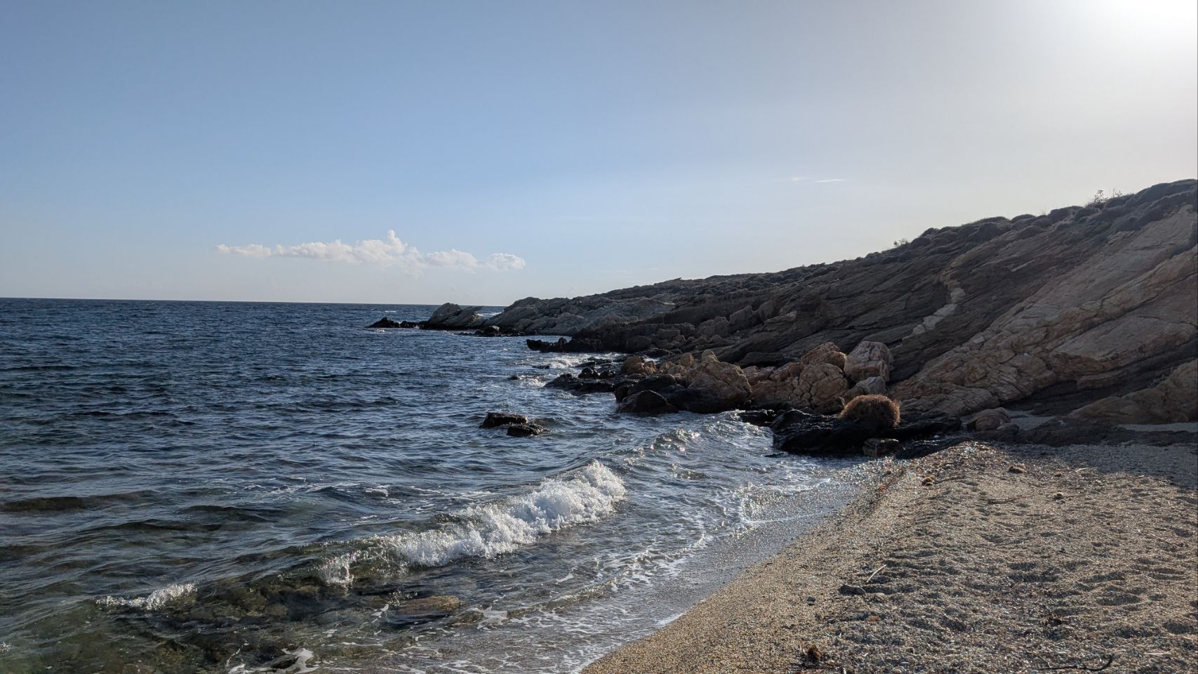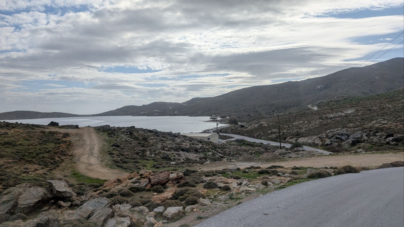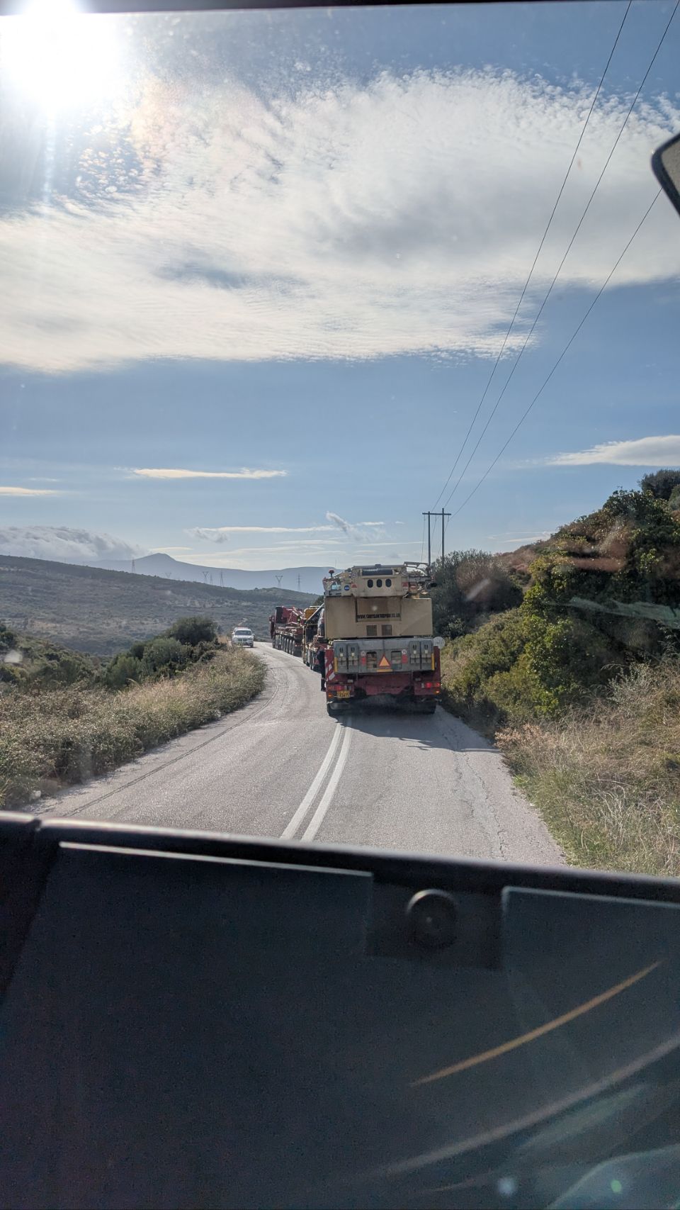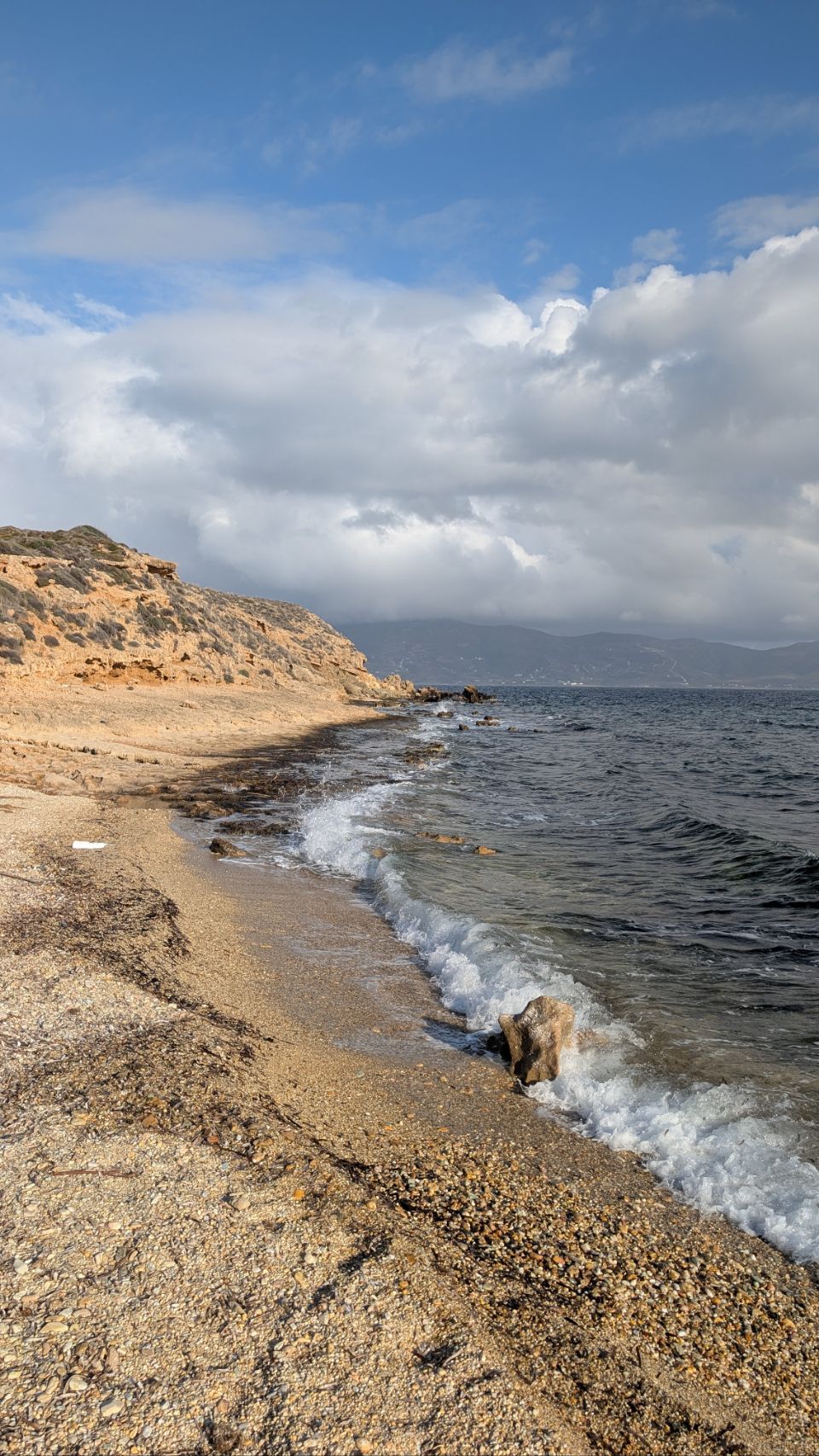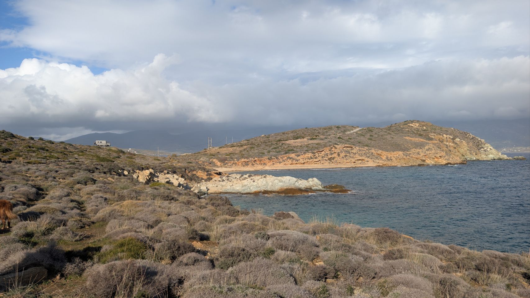Von Agios Dimitrios sind es nochmal knapp 60 km bis zur Südspitze, die Strecke führt hauptsächlich an der Küste lang. Nachdem wir den Schwerlast-Konvoi in Nea Styra losgeworden sind, geht es auch wieder ein bisschen flotter voran.