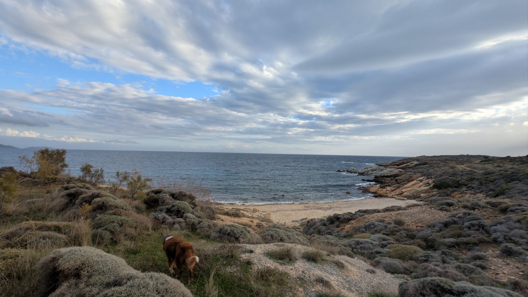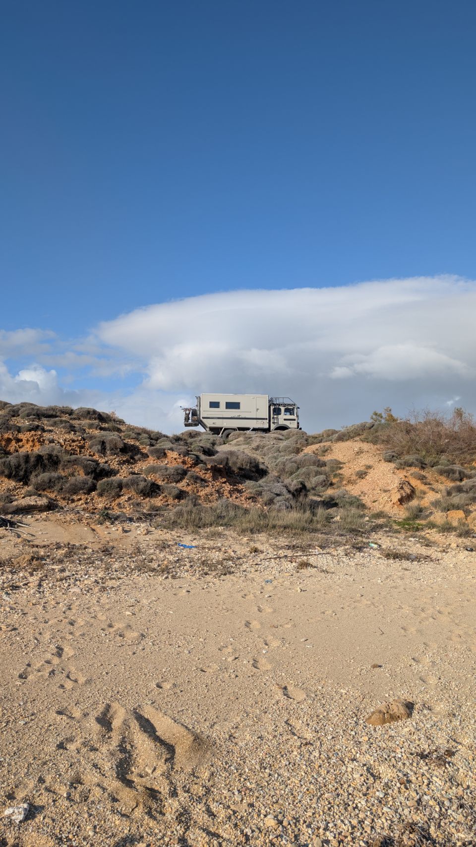 Jetzt ist es allerdings noch leer hier und nachdem wir bestimmt eine Stunde durch diesen Irrgarten gefahren sind (übrigens haben die Straßen z. T. Steigungen/Gefälle bis zu 25 % … das schafft der Krümel im 1. Gang so gerade, aber – was hat man sich denn dabei gedacht? 🤔), finden wir ein schönes Plätzchen für uns mit eigenem Privatstrand. Echt schade, dass für die nächsten 2 bis 3 Tage Dauerregen angesagt ist 🌨️🌨️🥺.