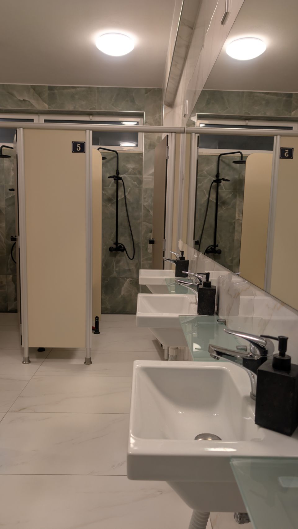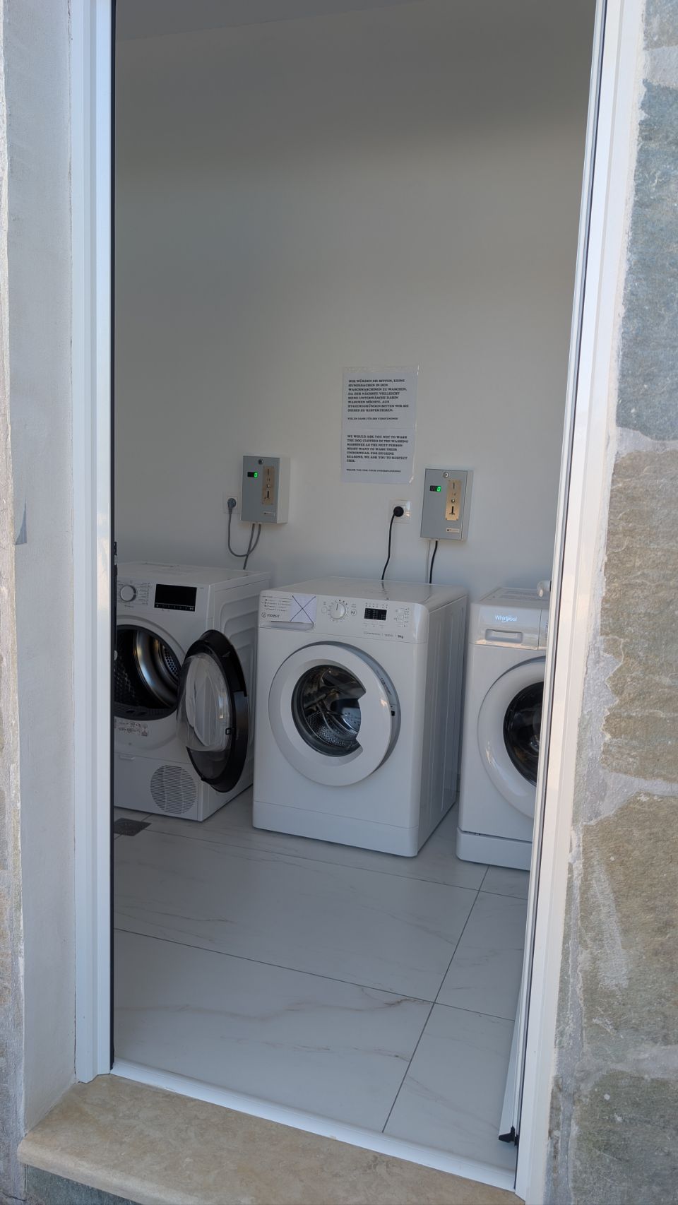 Es gibt 2 Waschmaschinen und einen Trockner (2 € pro Nutzung), richtig gute Sanitäranlagen (Regendusche 🤩), Strom, Wasser, Abwasser und ein nettes Café oben im Gebäude. Also alles da, was selbst das Freisteher-Herz manchmal begeistert, für 16 € pro Nacht (+ Strom, wenn man den braucht).