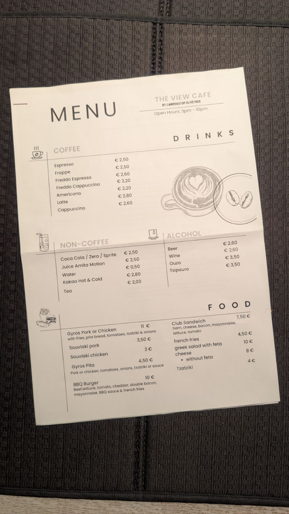 Zurück im Camperstop gönnen wir uns heute ein Abendessen im platzeigenen Café „The View Café“: zugegebenermaßen wird hier zwar nicht selbst gekocht sondern beim Lokal des Vertrauens im Dorf bestellt, aber Gyros und Burger sind echt lecker 😋  und auch nicht teuer. Der Cappuccino ☕ wird allerdings vor Ort zubereitet und ist – mhhhh – sehr gut!