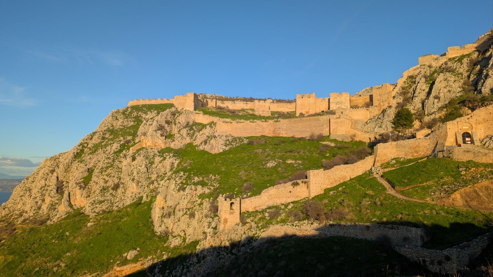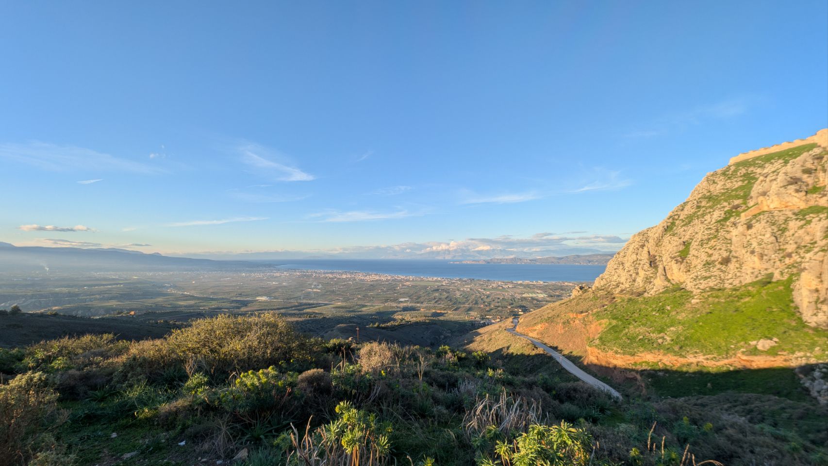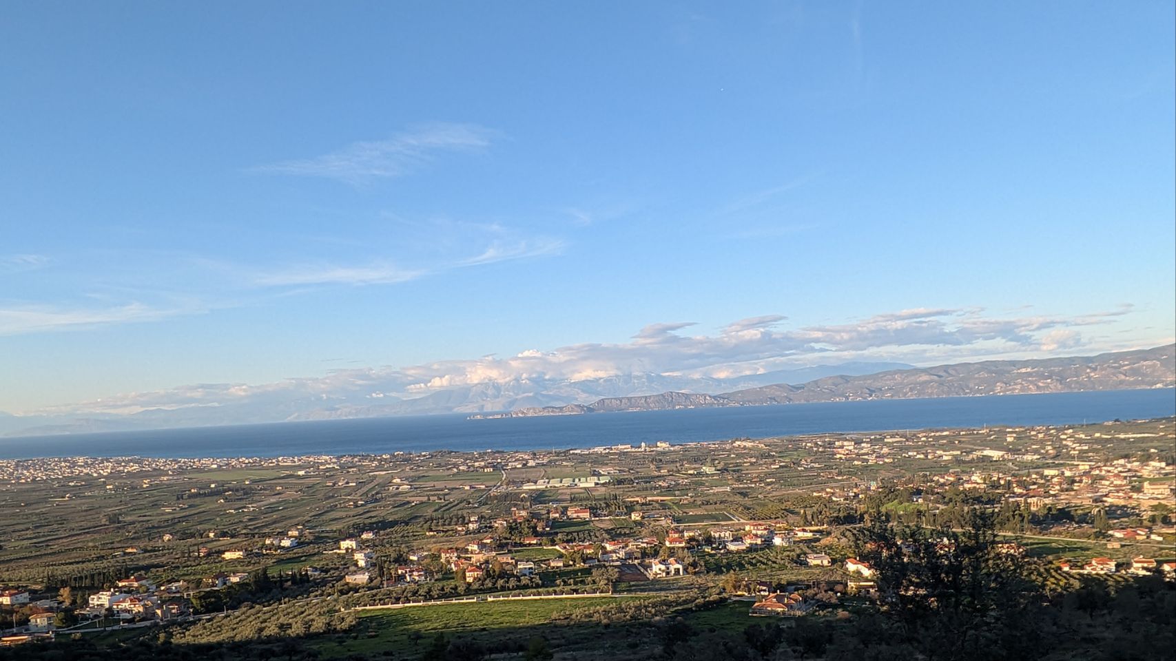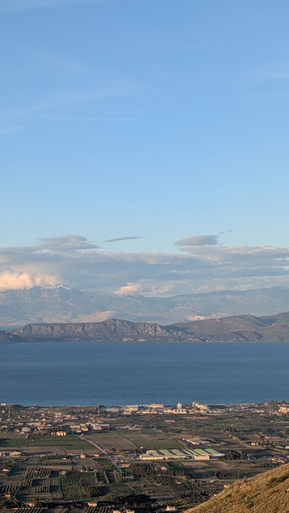Macht nix, wir inspizieren die Umgebung und genießen aus der Ferne den Anblick der alten Gebäude in der Sonne und die Aussicht auf den Golf von Korinth.