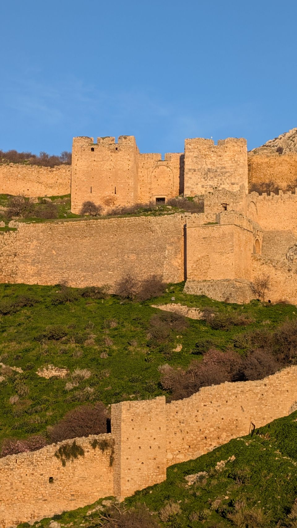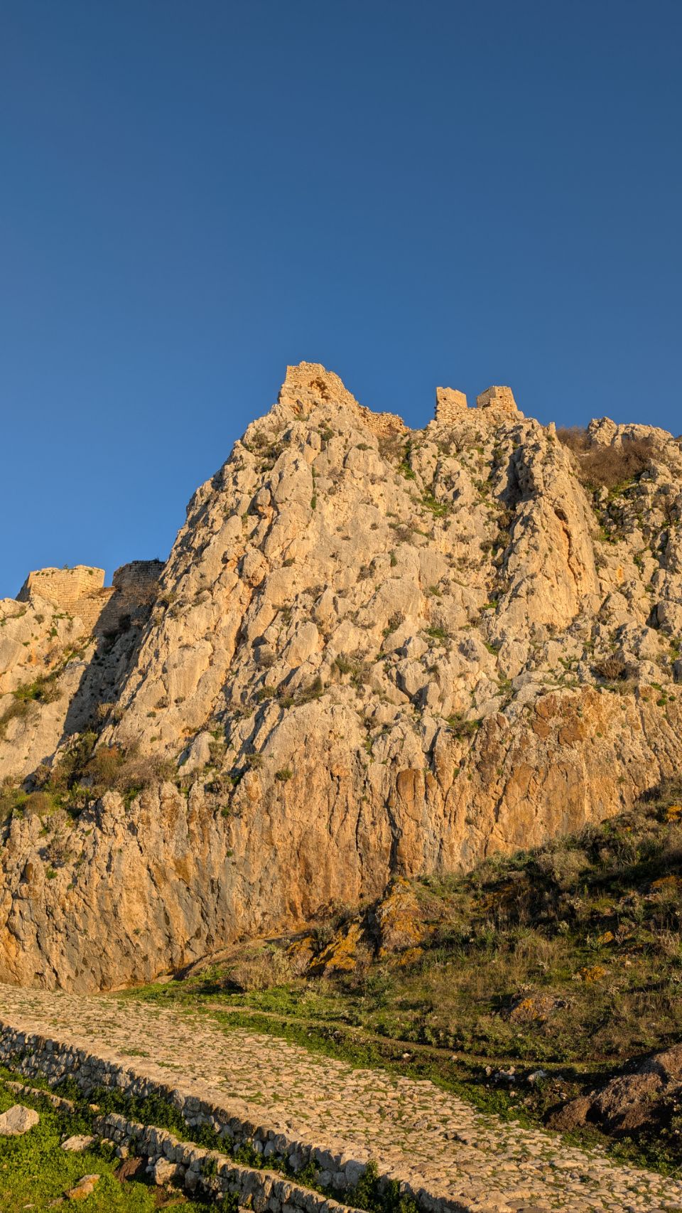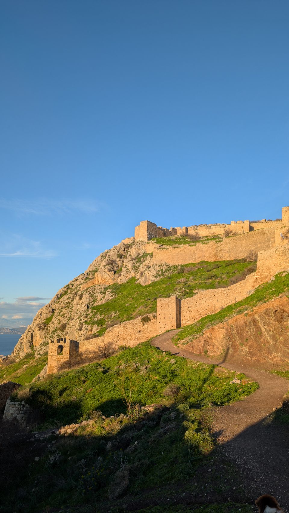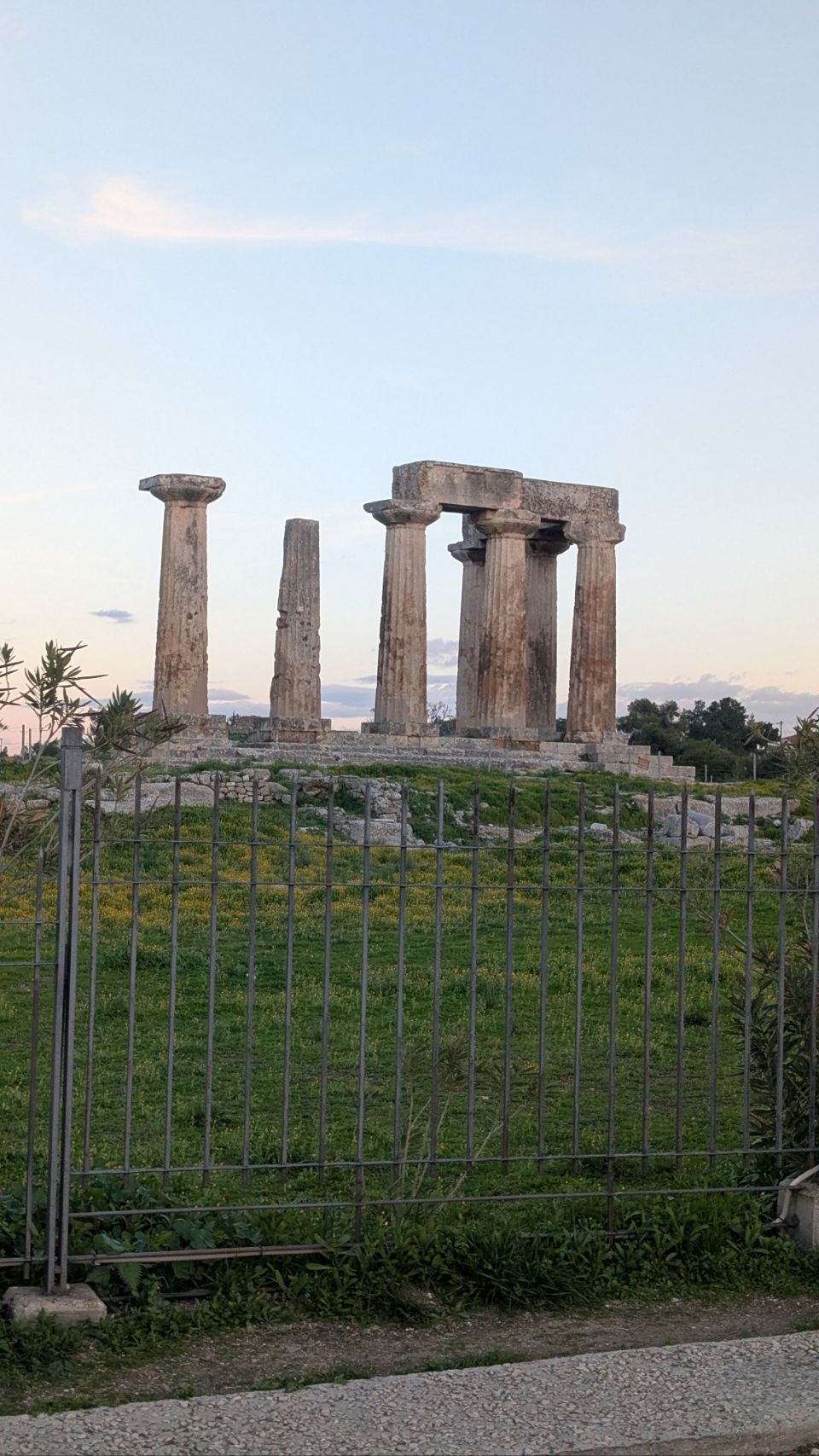 Macht nix, wir inspizieren die Umgebung und genießen aus der Ferne den Anblick der alten Gebäude in der Sonne und die Aussicht auf den Golf von Korinth.
