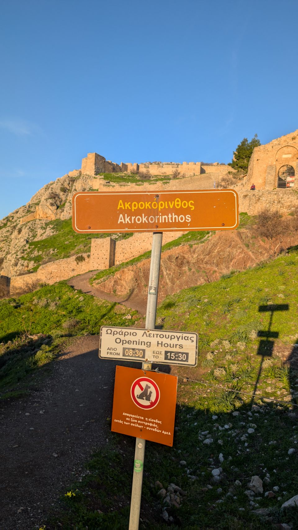 Als zweiten Punkt auf unserer kleinen Tour fahren wir spontan noch zur Festung Akrokorinthos. Leider ist diese – nicht spontan sondern regulär – wie auf dem Schild zu lesen ist, für heute schon geschlossen.