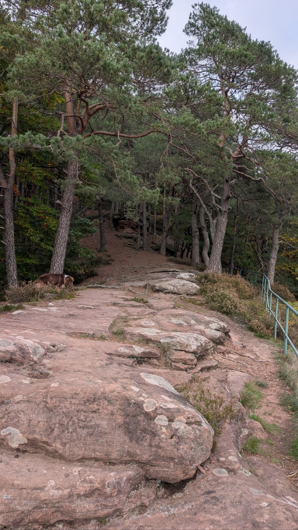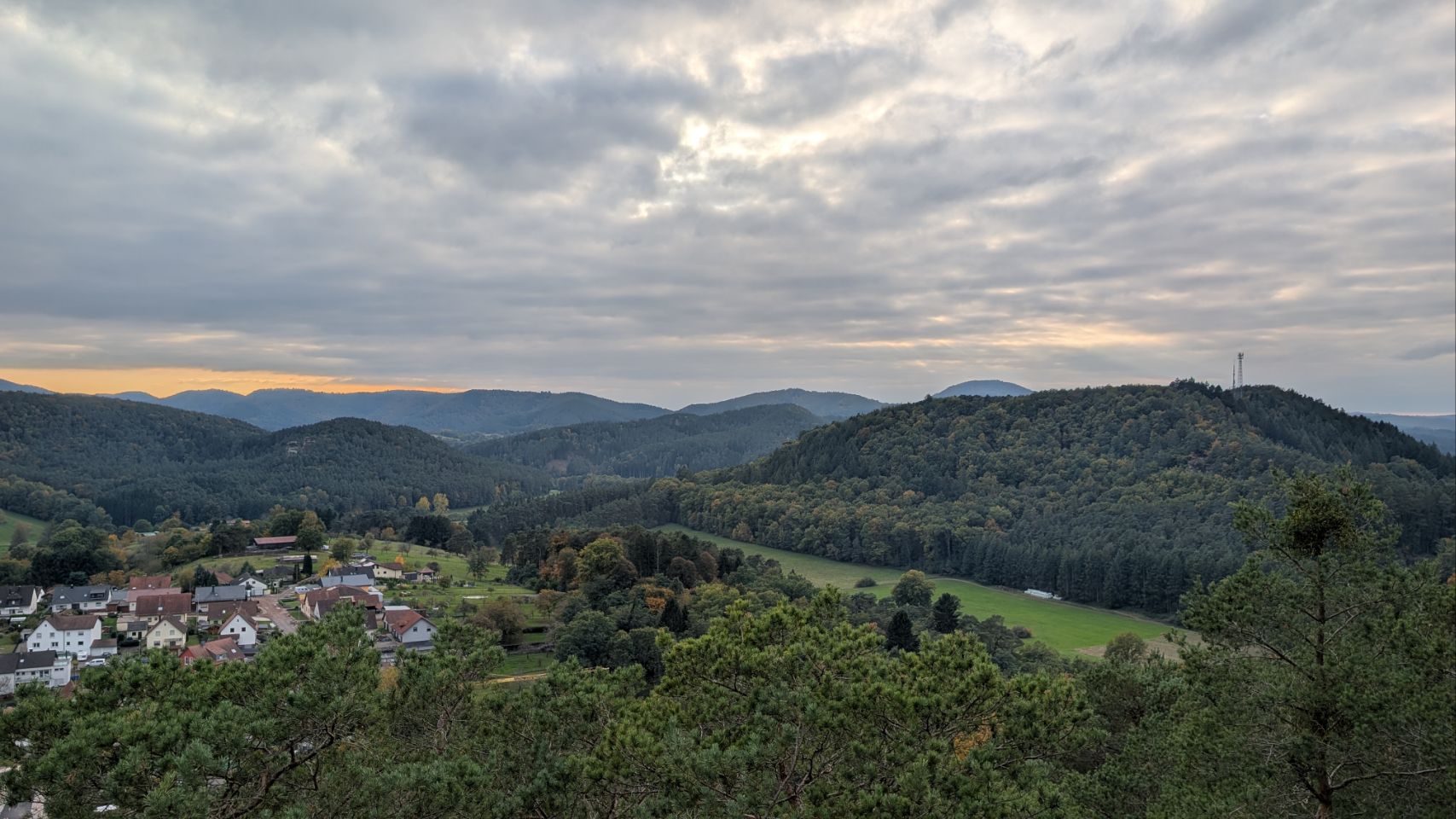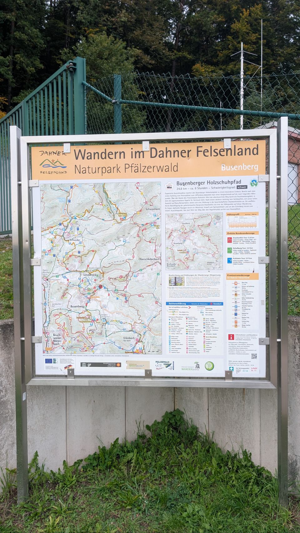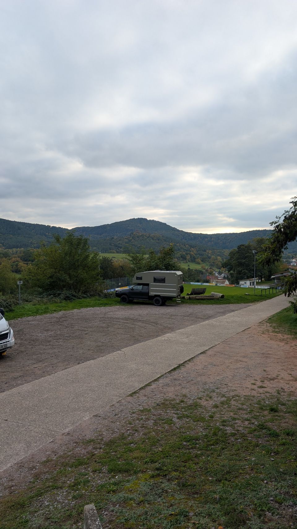 Endlich! Wir sind unterwegs – aber jetzt wirklich 🤩. Die ersten knapp 300 km sind geschafft und wir landen im Dahner Felsenland. Nachdem wir eine Runde über das Haupt-Parkplatz-Areal am Felsenbad gedreht haben (viele Autos, Tagesgäste, Wohnmobile, 12 Euro plus Kurtaxe für die Nacht) was uns nicht so richtig anlacht, finden wir einige Kilometer weiter einen kleinen ruhigen und sogar kostenfreien Übernachtungs(park)platz am Sportplatz des SC Busenberg 🤭… Nee echt, so heißt der wirklich. Der Ort auch. Und außerdem startet hier der Busenberger Holzschuhpfad 🥾🥾, ein sogenannter Premium-Wanderweg, über 24 km und nicht so ganz einfach. Naja, es ist schon nach 16 Uhr, deswegen begnügen wir uns alternativ mit der Eichelbergtour: ein sehr schöner 3 km langer Spaziergang durch den herbstlichen Wald vorbei am Aussichtspunkt Eichelberg mit Blick ins Tal und im Gegensatz zu der Hauptmeile sind hier auch nur ganz wenige Leute unterwegs. Für uns tatsächlich die bessere Alternative 🙂.