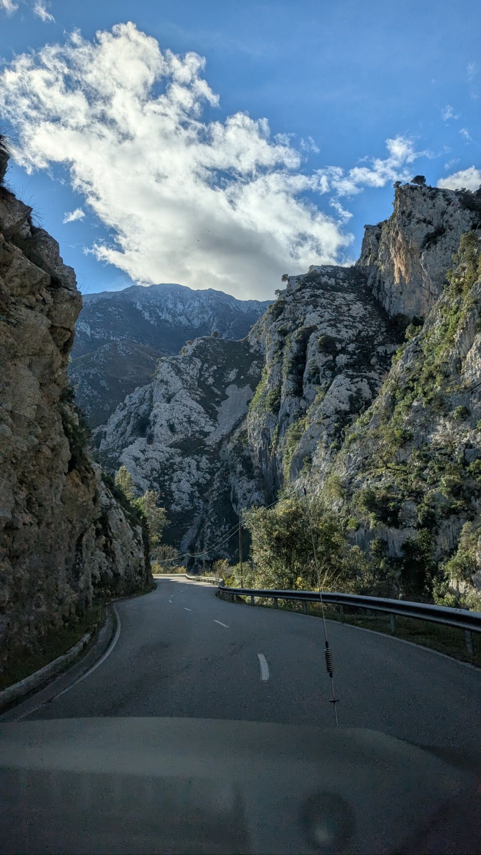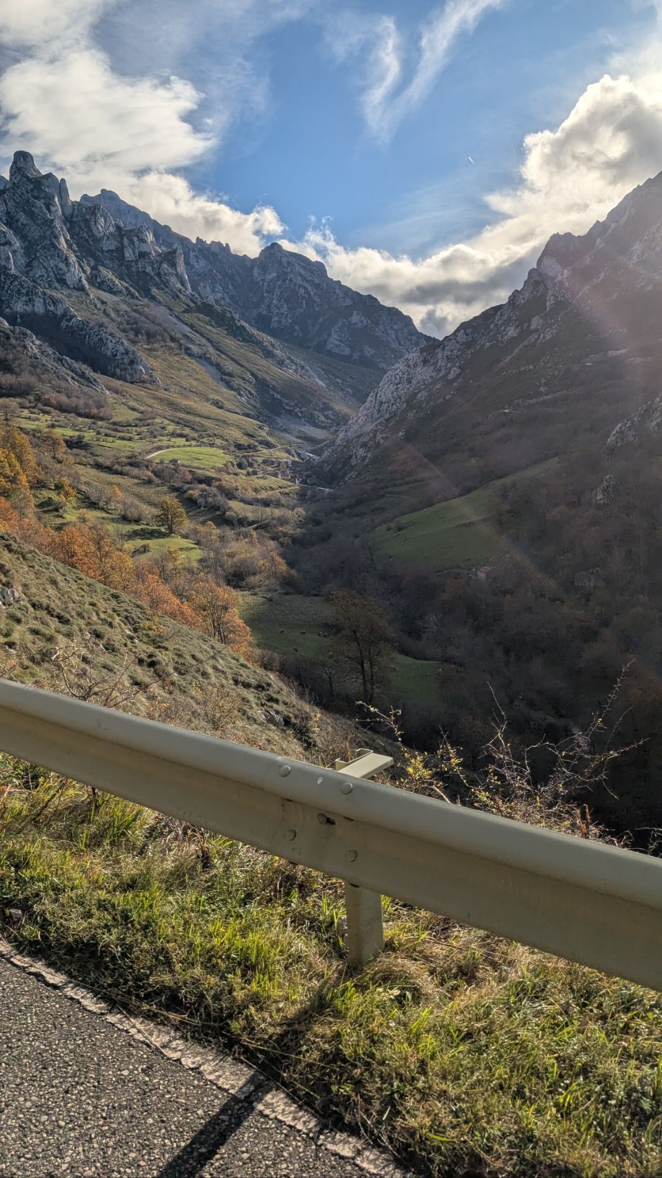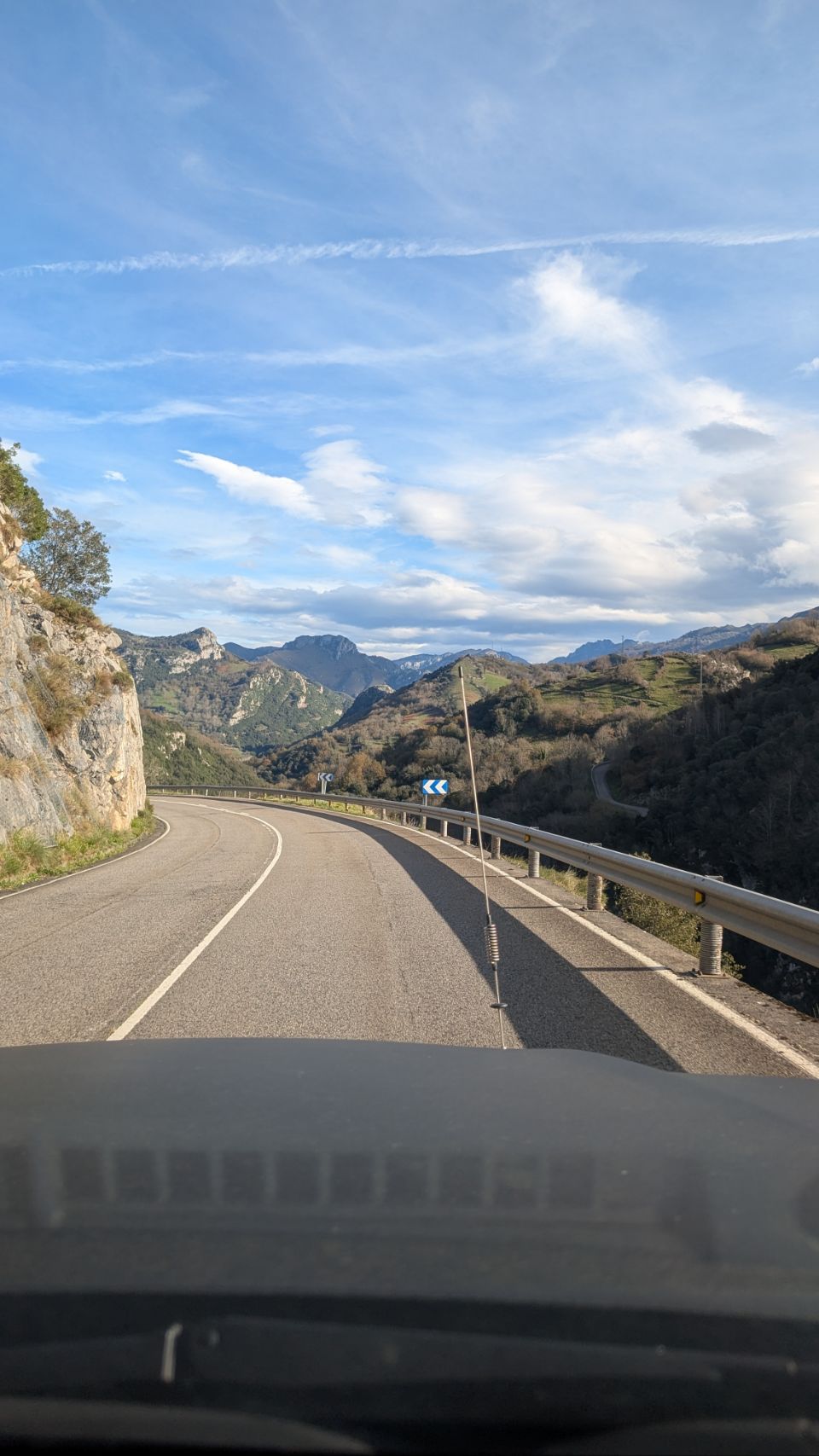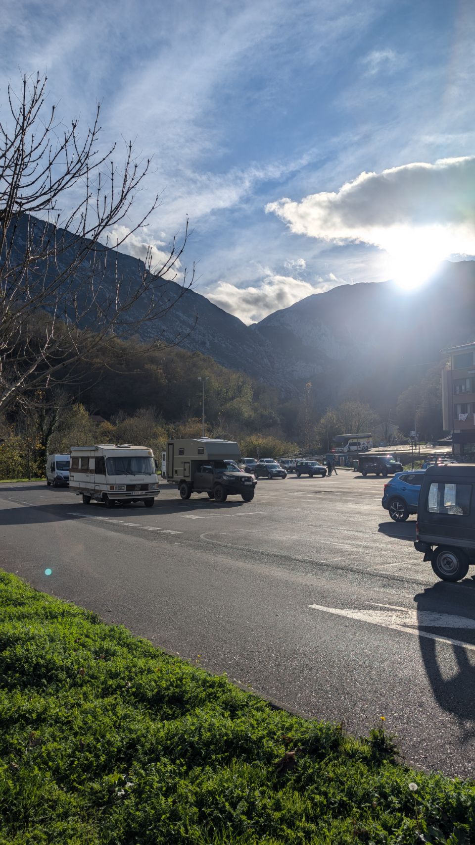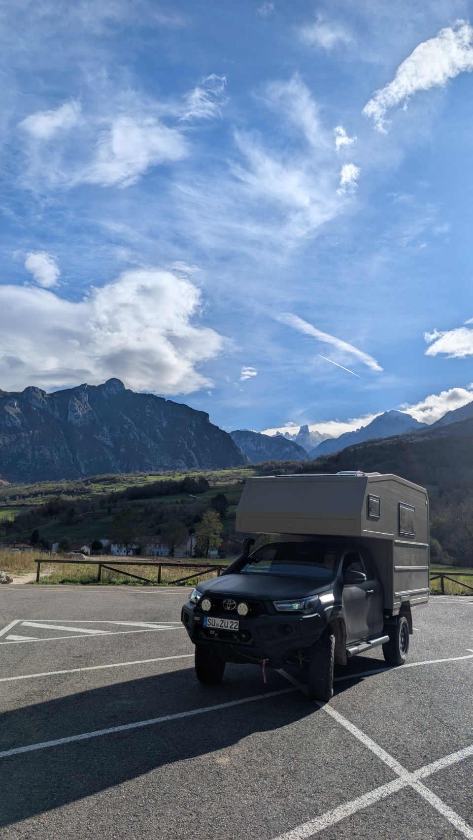 Nächster Halt ist das Dorf Las Arenas im nördlichen Teil des Nationalparks Picos de Europa. Morgen soll das Wetter so gut sein, wie wir es uns für den geplanten Offroad-Track durch die Picos vorstellen, deshalb sind wir eigentlich schon ungefähr bis zum Startpunkt des Tracks gefahren. In Sotres hätten wir aber auf einem kleinen, bereits recht vollgeparkten und auch noch ziemlich schrägen Parkplatz übernachten müssen, deswegen (und nur deswegen, nicht etwa, weil jemand die auch schon richtig coolen 17 km Bergstraßen zurück nochmal fahren wollte 😉…) geht’s durch das Vorgebirge der Picos zurück nach Las Arenas.