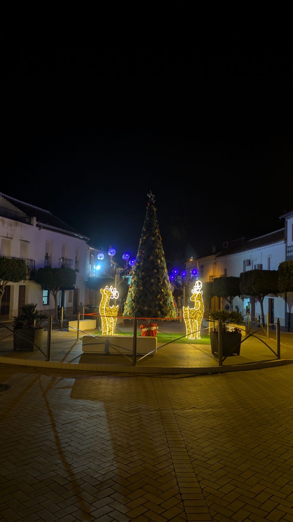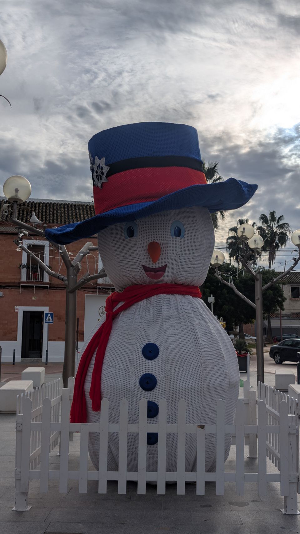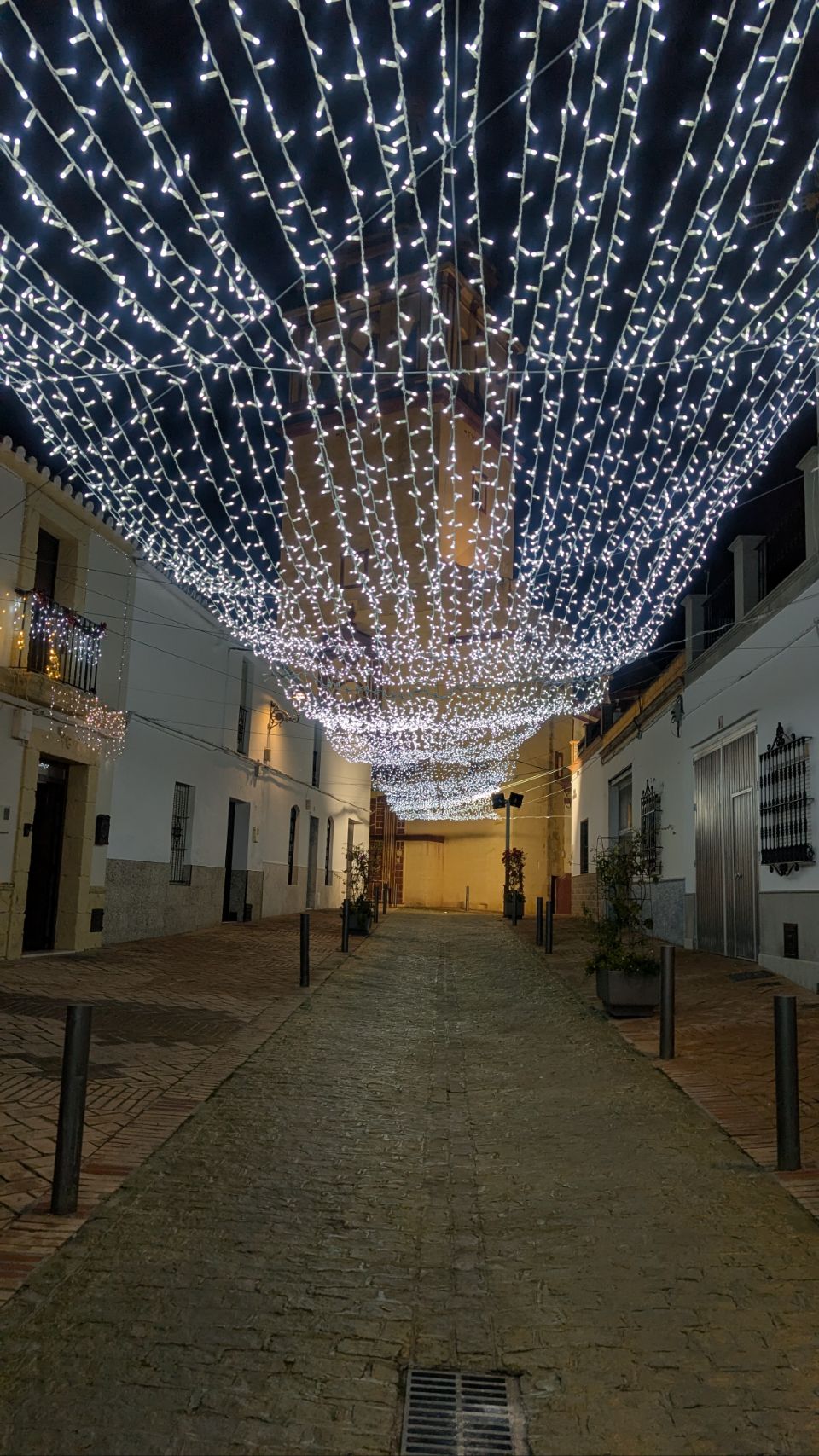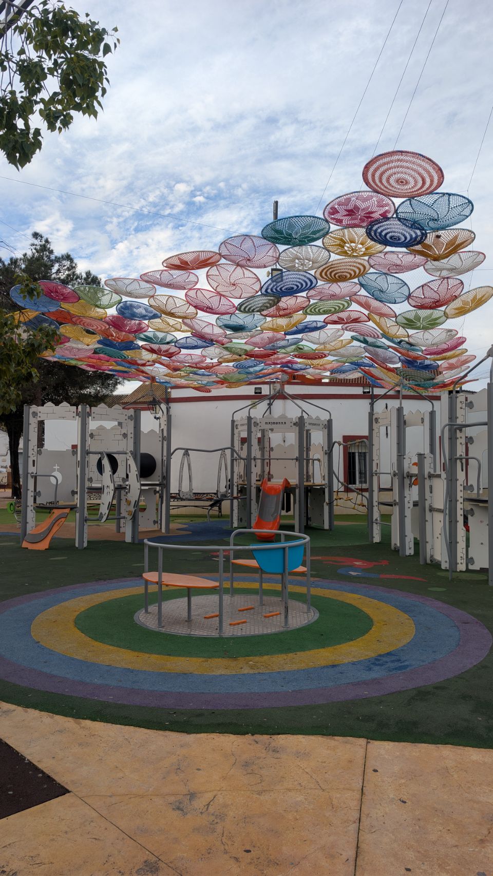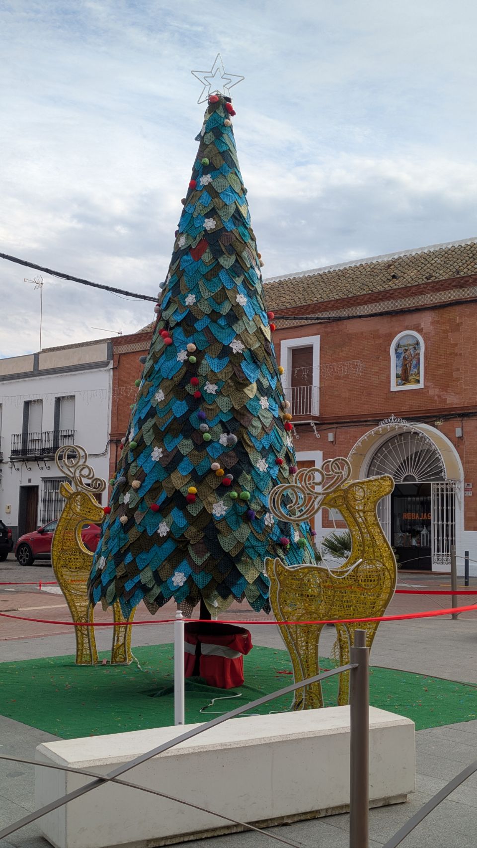 Danach geht es weiter bis El Coronil, wo wir eigentlich nur noch ein bisschen Nachmittagssonne tanken wollen, bevor es (mal wieder) regnen soll. Ein kleiner Spaziergang durch das weitaus weniger bombastisch dekorierte aber dennoch weihnachtliche Dorf klappt aber auch noch. Überall sind kleine Wichtel plaziert: in den Fenstern, an Straßenleuchten, auf der Mauer im Innenhof der Stadtburg … und was mir besonders gut gefällt (hat aber wohl nix mit Weihnachten zu tun) ist der nette bunte Spielplatz mit gehäkelter Dachkonstruktion 🧶🪡 – vielleicht eine Inspiration für die ein oder andere Kreative unter euch 😉.