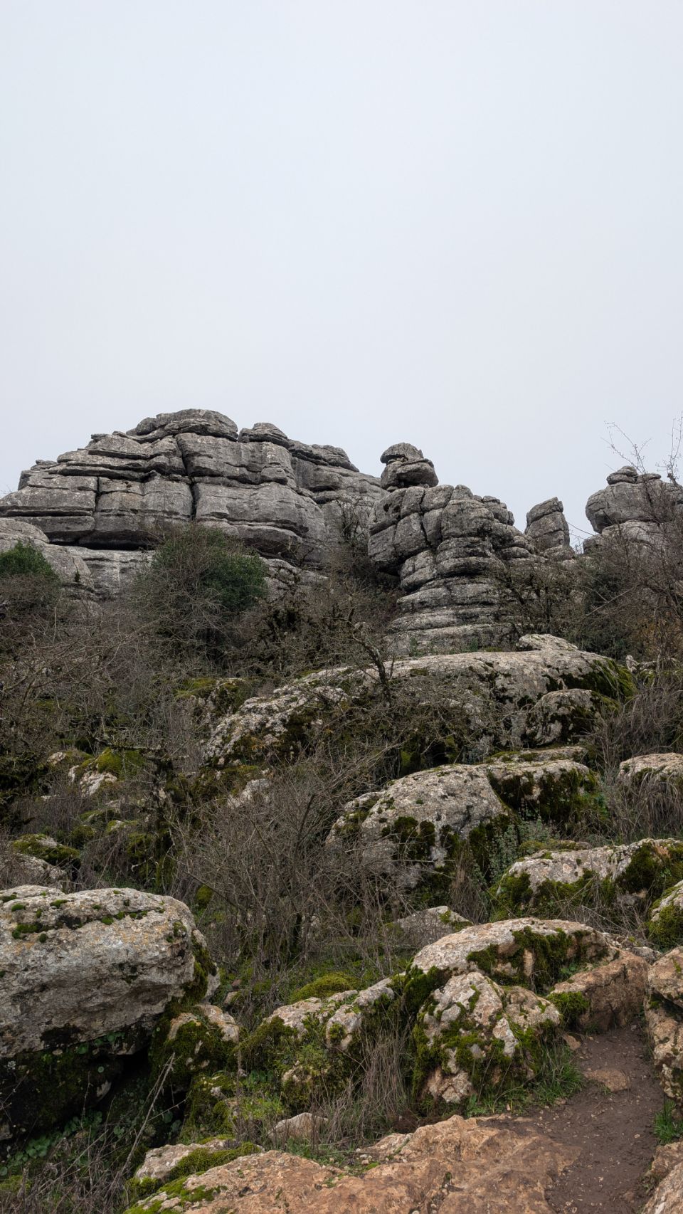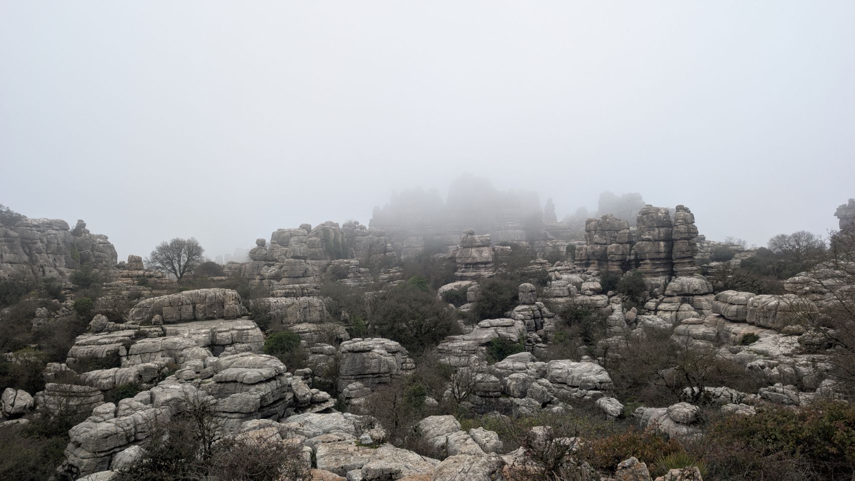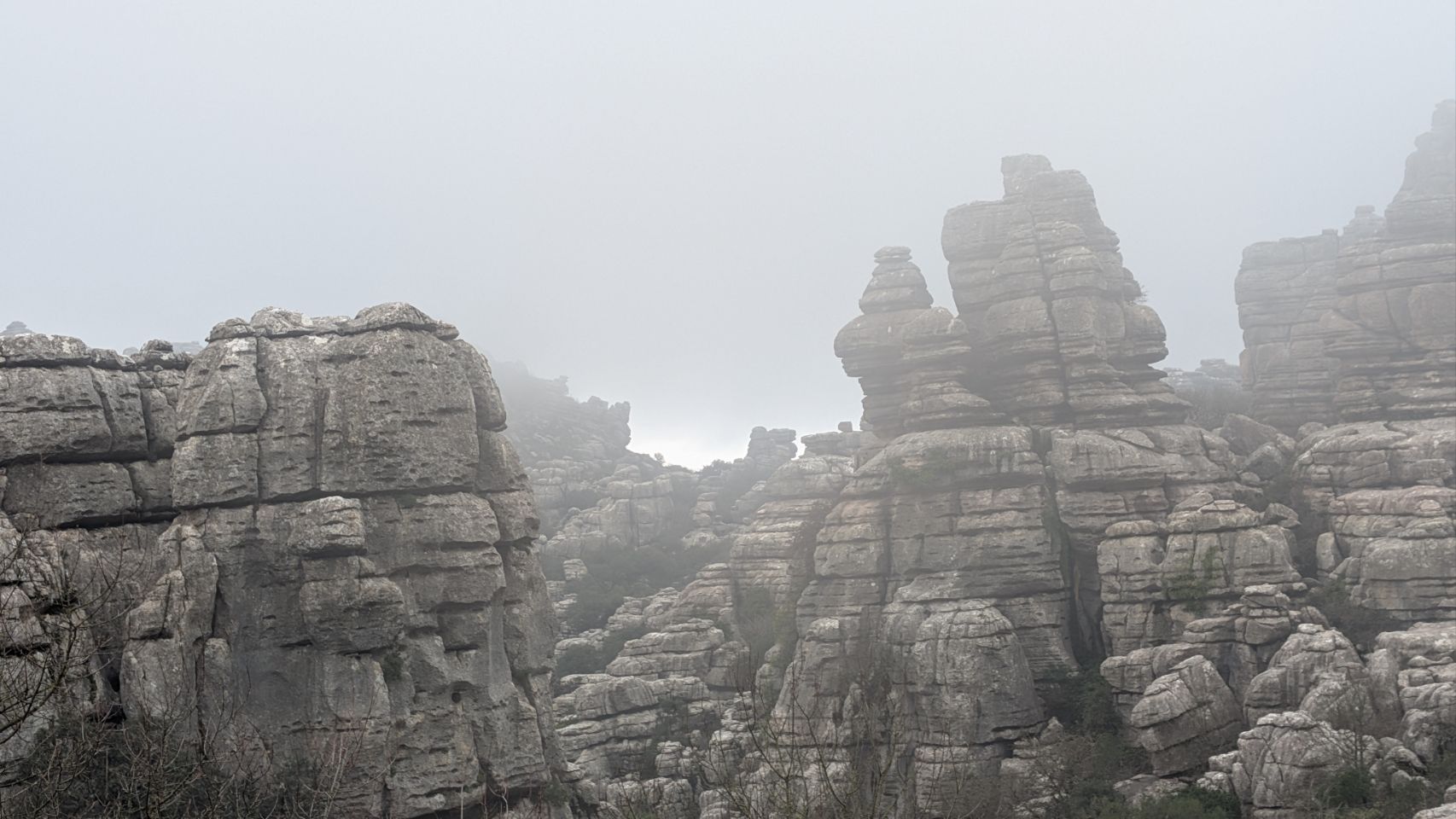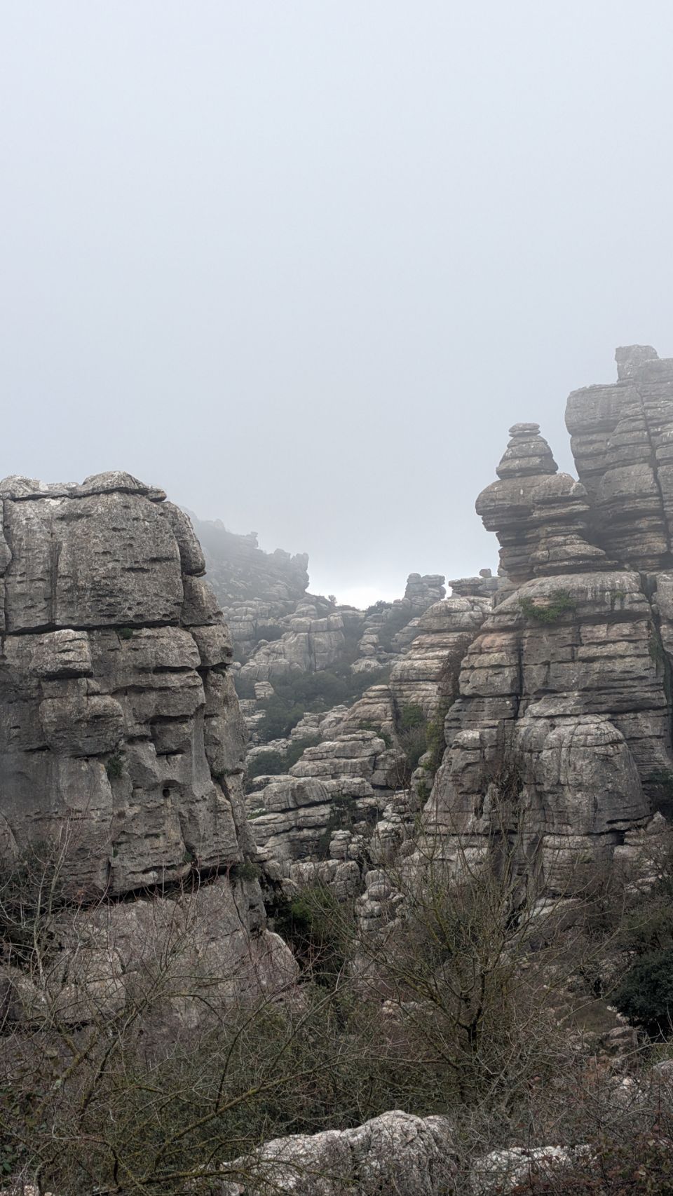 Der spooky Nebel begleitet uns weiter bis zum und auch bei der Wanderung durch den Naturpark El Torcal. Das Bergmassiv aus Kalkstein ist bekannt für seine spektakulären, durch Erosion geformten Karstlandschaften, Schluchten und bizarren Steinformationen. Es gehört zum UNESCO-Welterbe und ist vor 250 bis 200 Millionen Jahren entstanden.