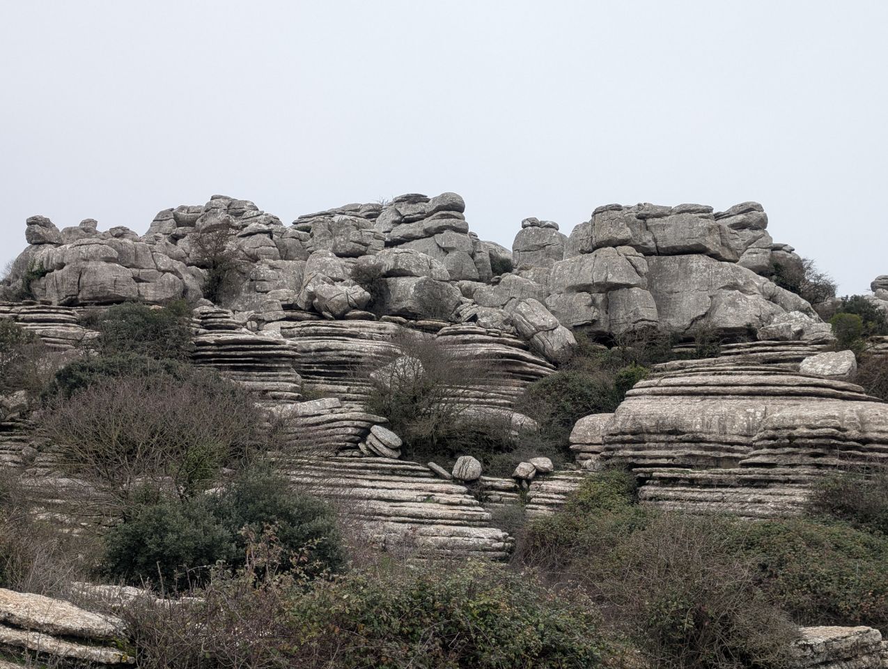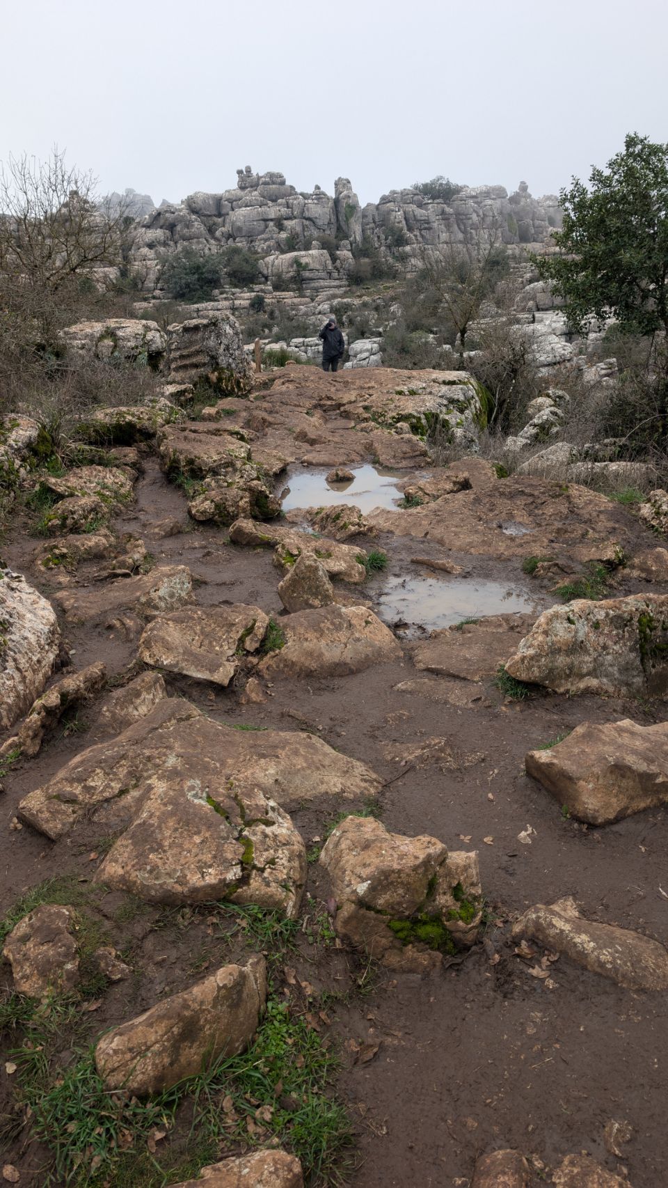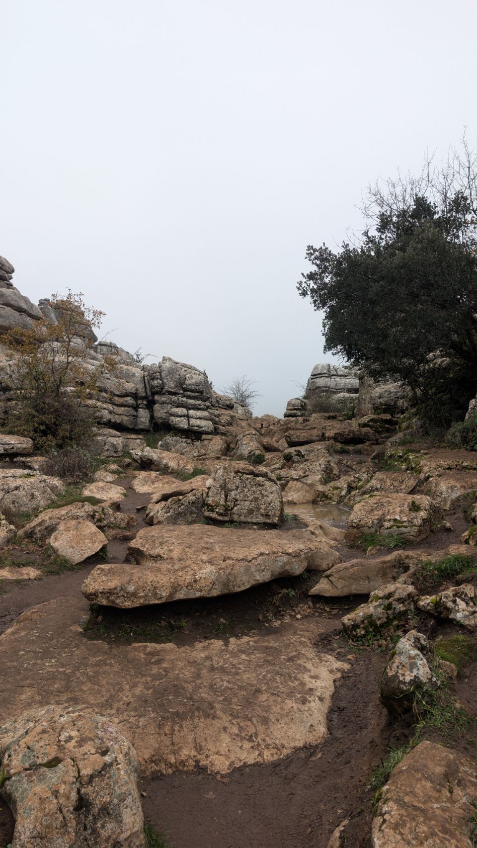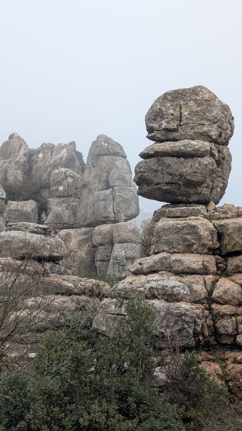 Der spooky Nebel begleitet uns weiter bis zum und auch bei der Wanderung durch den Naturpark El Torcal. Das Bergmassiv aus Kalkstein ist bekannt für seine spektakulären, durch Erosion geformten Karstlandschaften, Schluchten und bizarren Steinformationen. Es gehört zum UNESCO-Welterbe und ist vor 250 bis 200 Millionen Jahren entstanden.