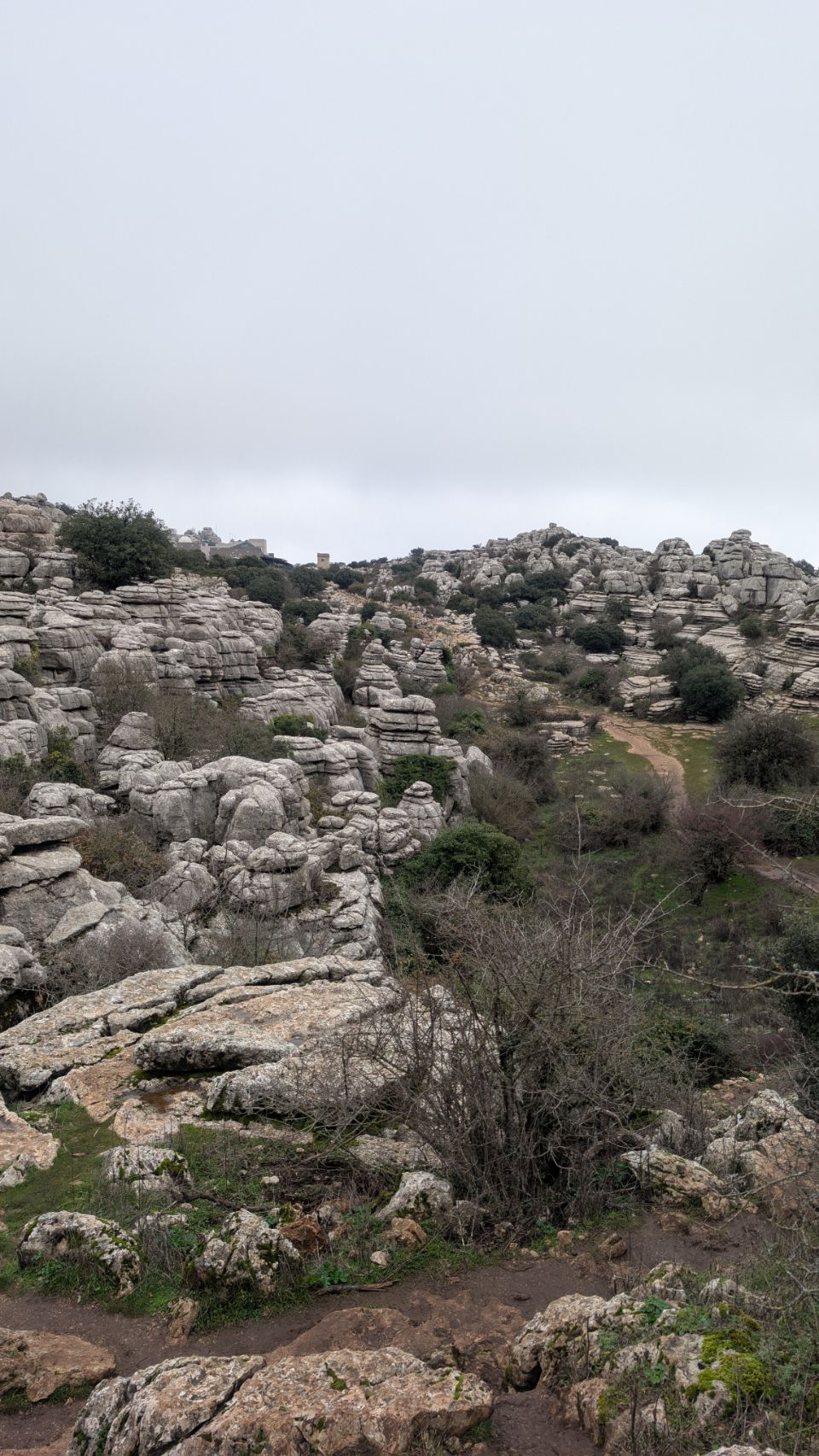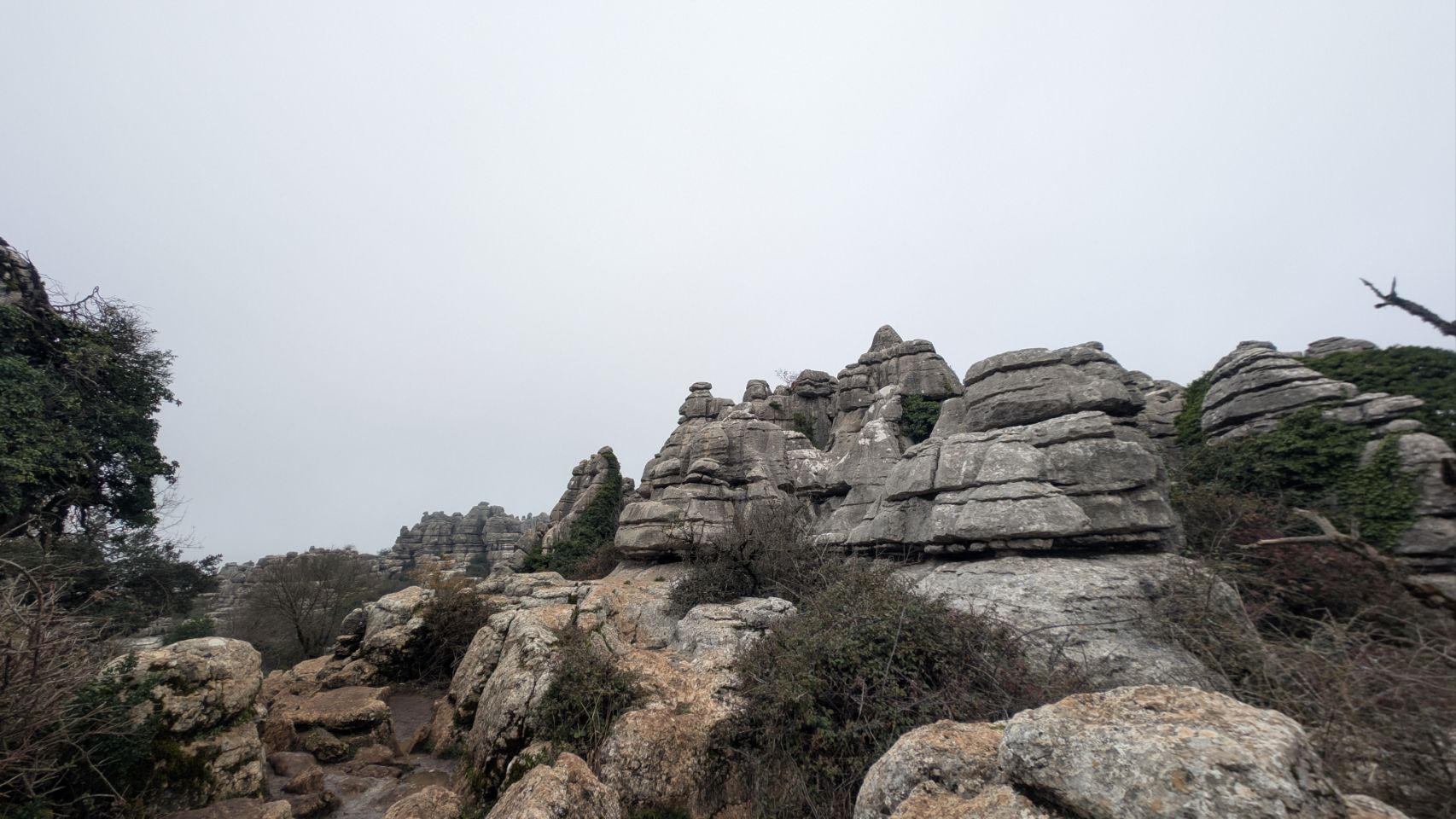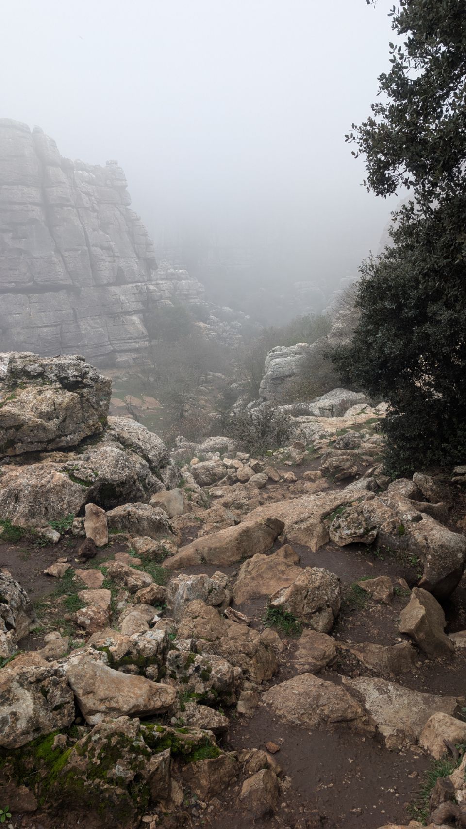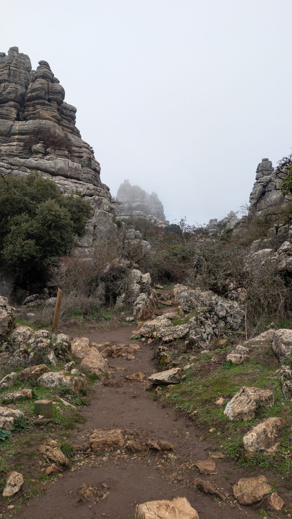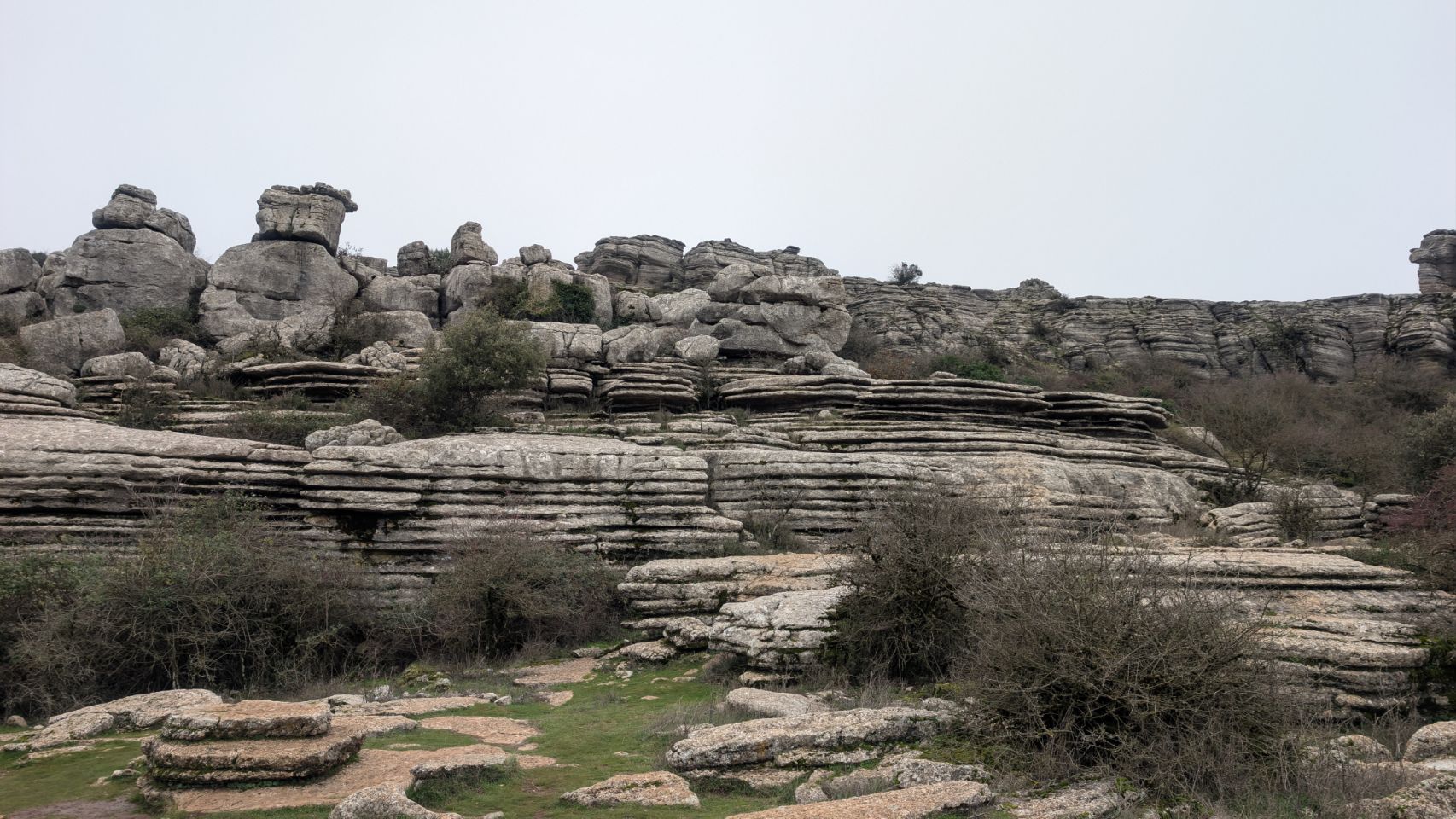 Der spooky Nebel begleitet uns weiter bis zum und auch bei der Wanderung durch den Naturpark El Torcal. Das Bergmassiv aus Kalkstein ist bekannt für seine spektakulären, durch Erosion geformten Karstlandschaften, Schluchten und bizarren Steinformationen. Es gehört zum UNESCO-Welterbe und ist vor 250 bis 200 Millionen Jahren entstanden.