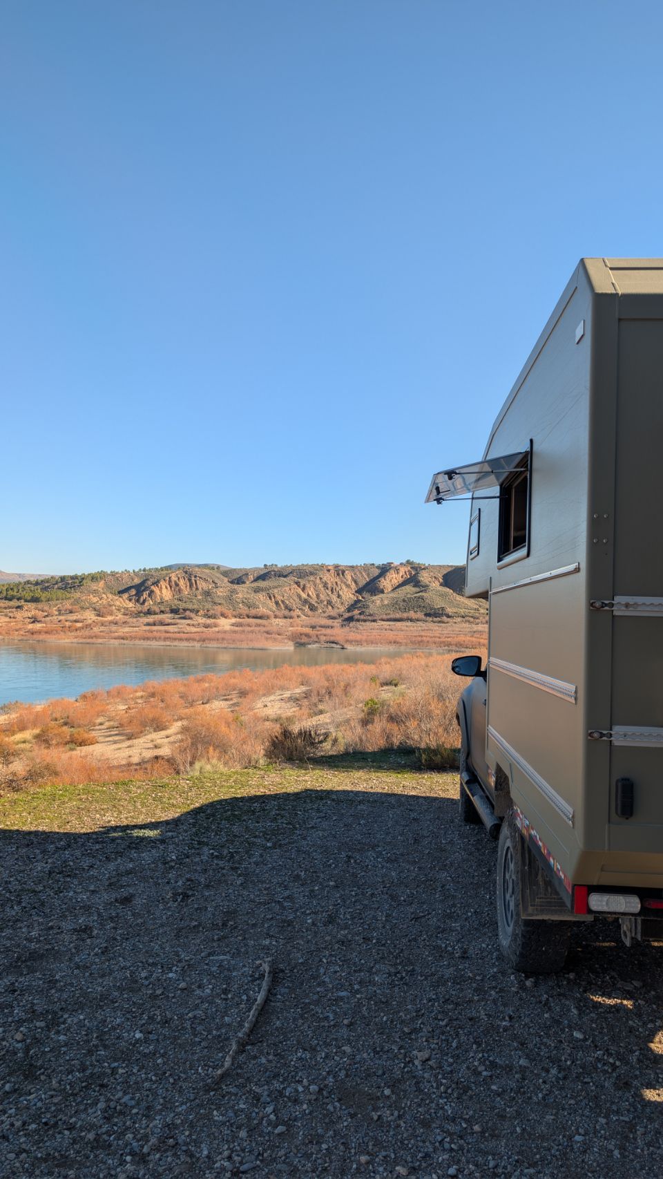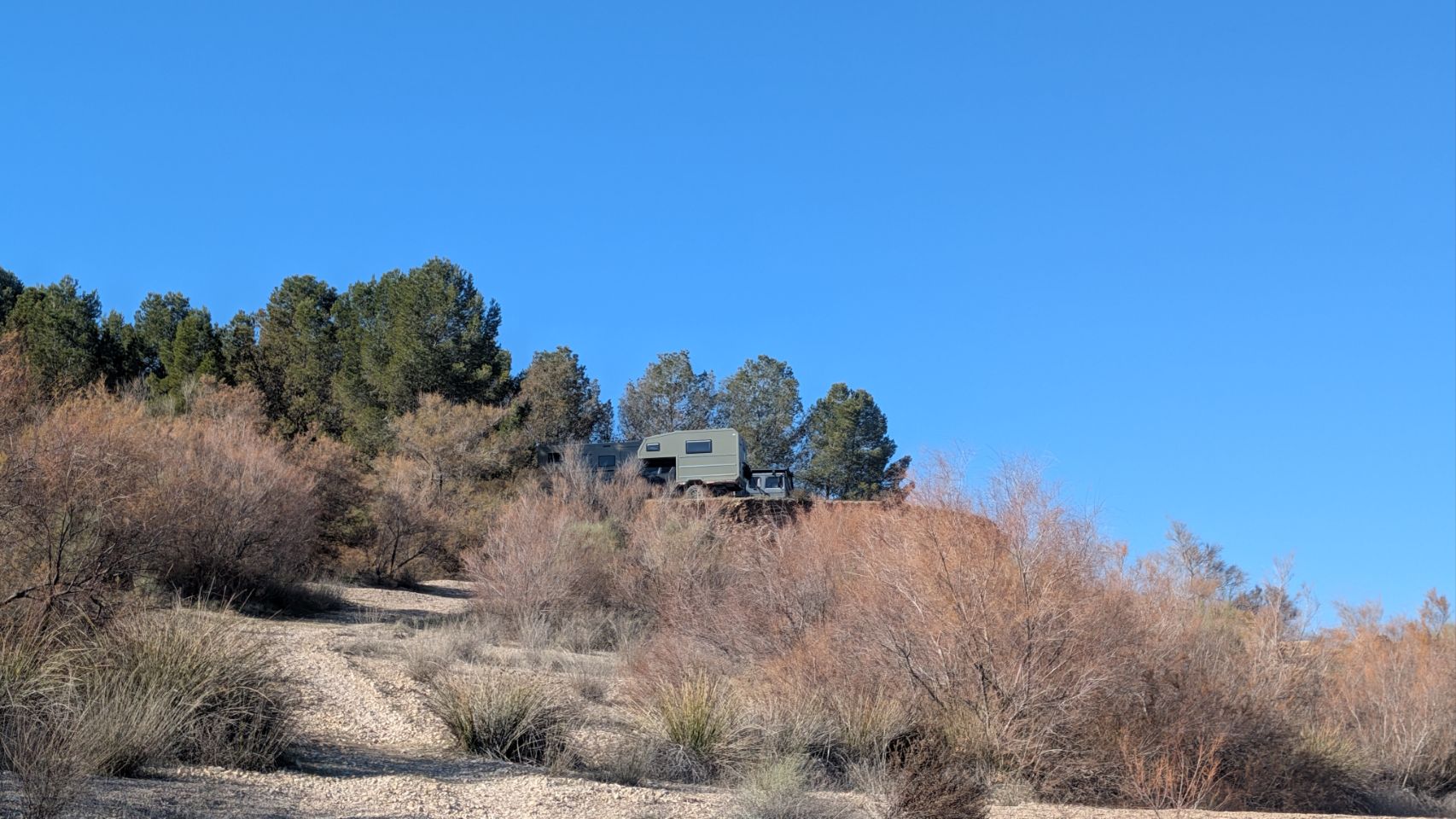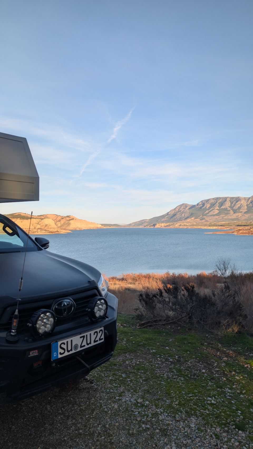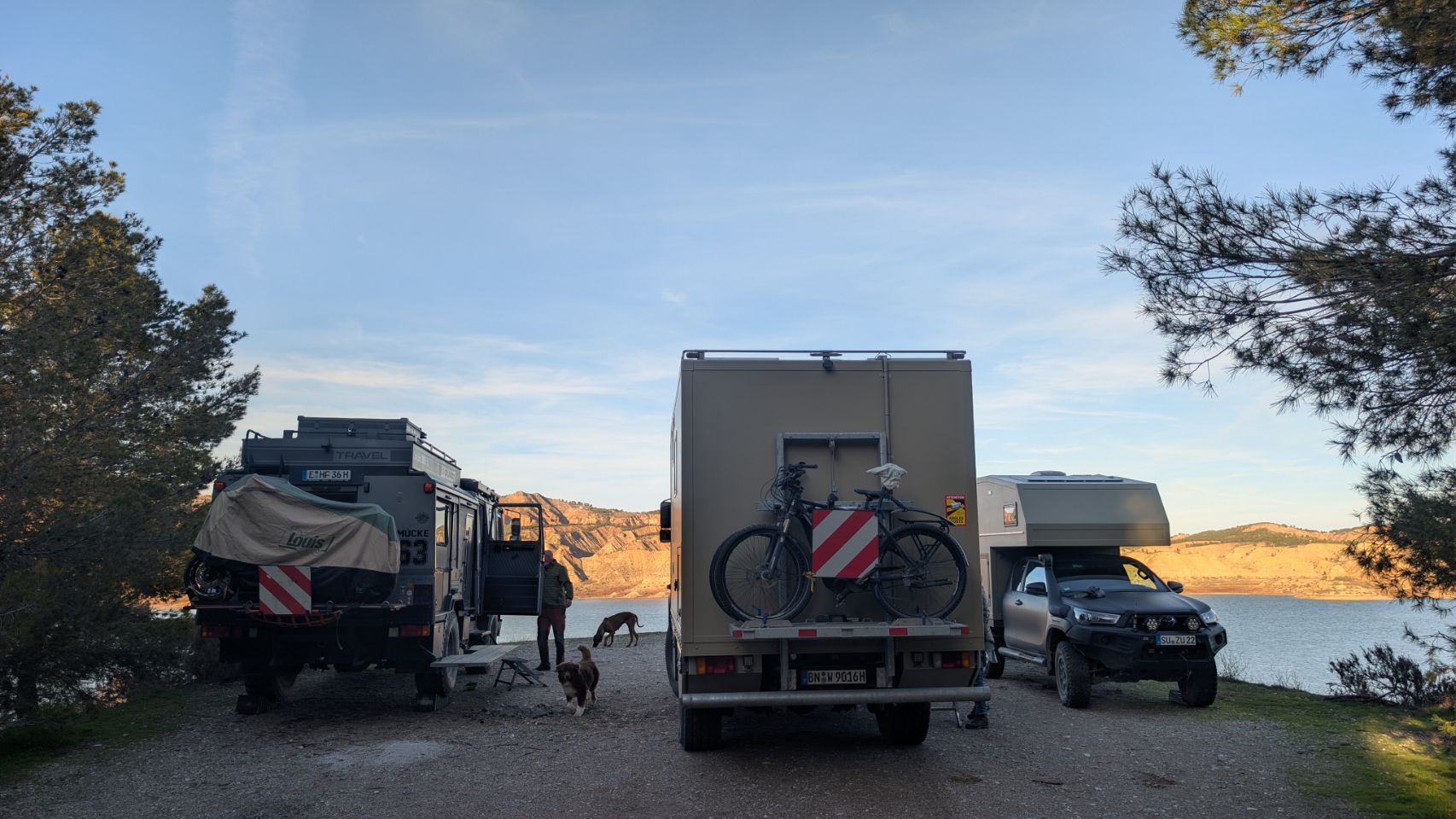 Glücklicherweise schließt sich der Rest der Truppe an und wir finden dann – Gott sei Dank – als Alternative einen richtig schönen Platz auf einem kleinen Plateau oberhalb des Stausees mit dem schönen Namen Balcon del Negratin. Leider ohne warme Quelle (dafür ist jetzt am Nachmittag sowieso der Wind zu kalt 🌬️), dafür gibt es als Entschädigung zum Abendessen meinen Lieblings-Bohnen-Onepot für Alle!
