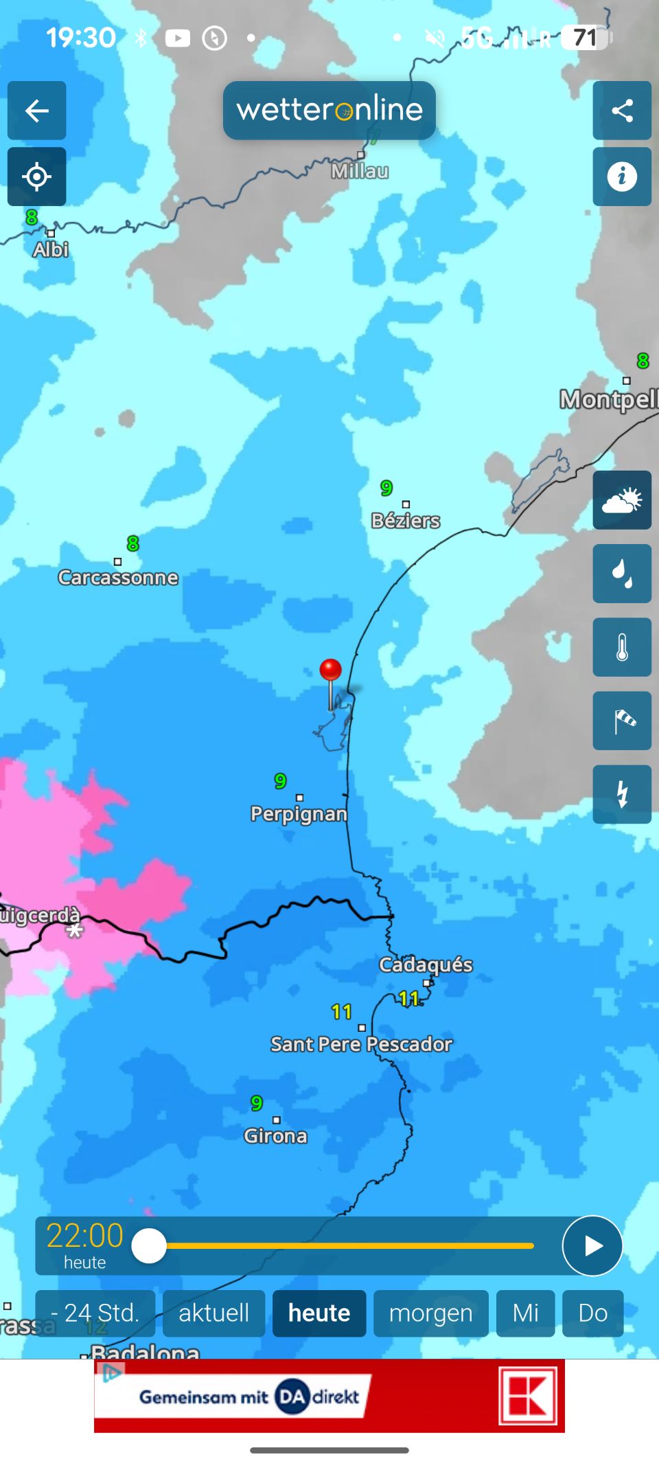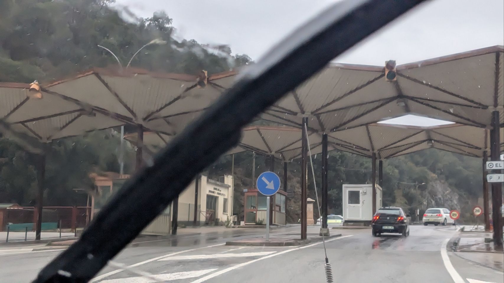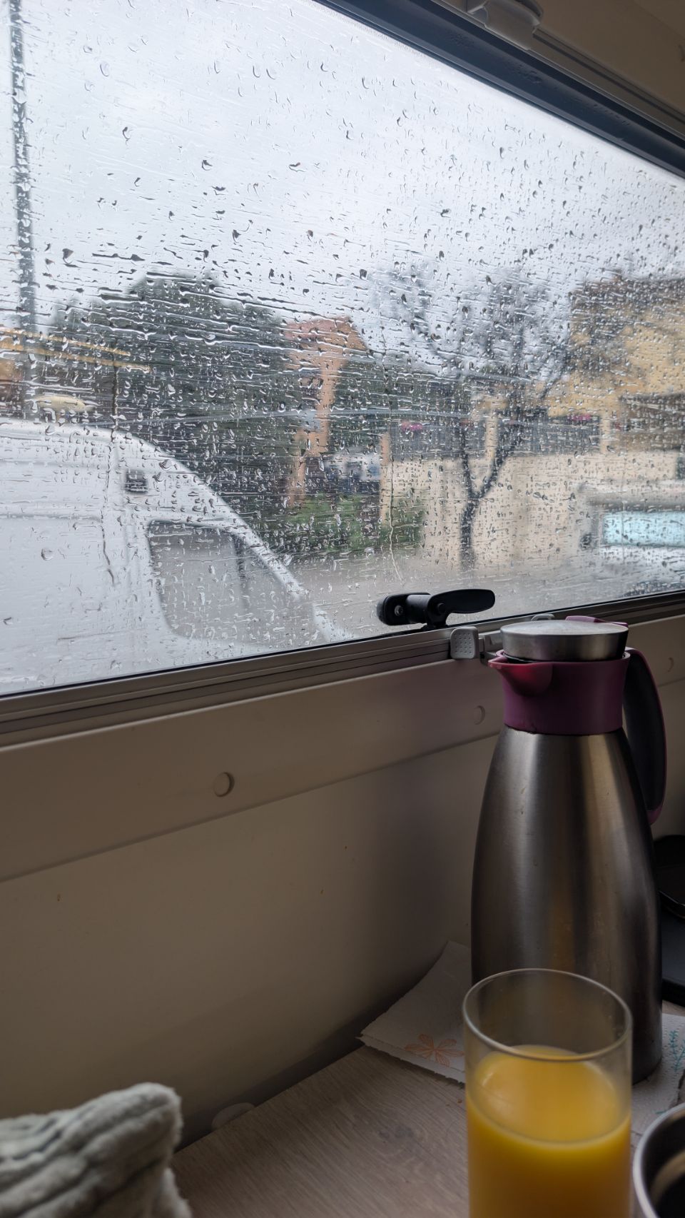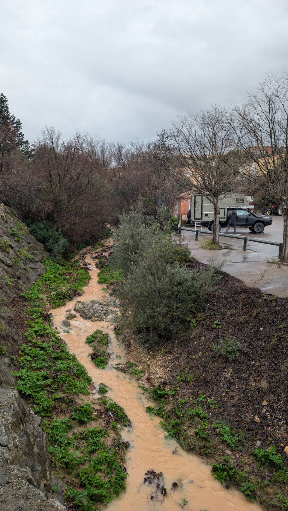 Es reicht leider nicht 🥺. Bei weiterhin strömendem Regen landen wir auf einem ruhigen kleinen Asphaltplatz in Fitou, nachdem wir den zunächst anvisierten Platz direkt an der Küste von Leucate aufgrund der ständig aufploppenden Unwetterwarnungen aufgegeben haben.