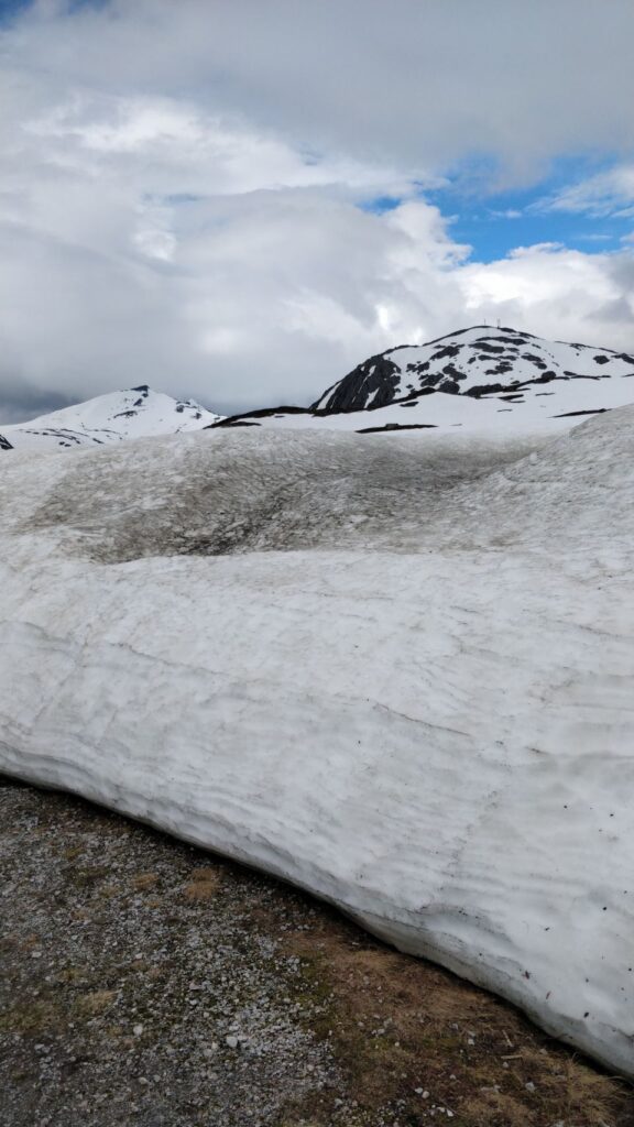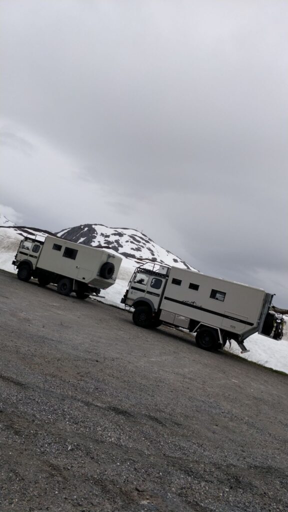 Das Oskar-Team meldet sich und gibt grünes Licht, außerdem hat Thom sich ja schon Mut angetrunken – also wagen wir’s und folgen den beiden zum Gletscherplatz. Es sind übrigens sogar 2 (super enge) Tunnel und dummerweise kam uns tatsächlich (glücklicherweise nur) ein PKW entgegen – da hat echt nur noch ein Blatt Papier dazwischen gepasst. Aber wie so oft: der Aufwand hat sich gelohnt, wie die Bilder zeigen: Ein wirklich außergewöhnlicher Stellplatz mitten im Juni in Schnee und Eis.